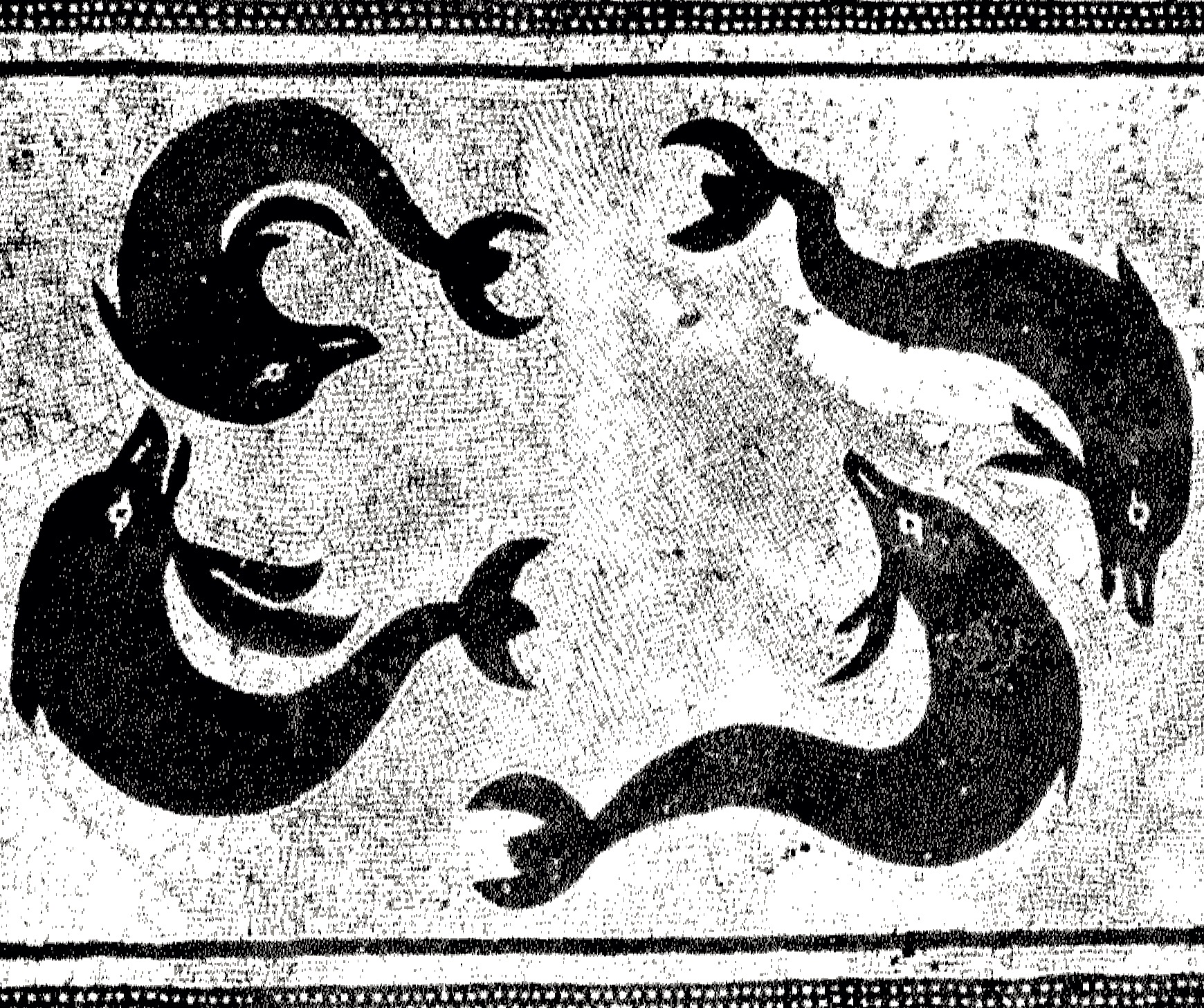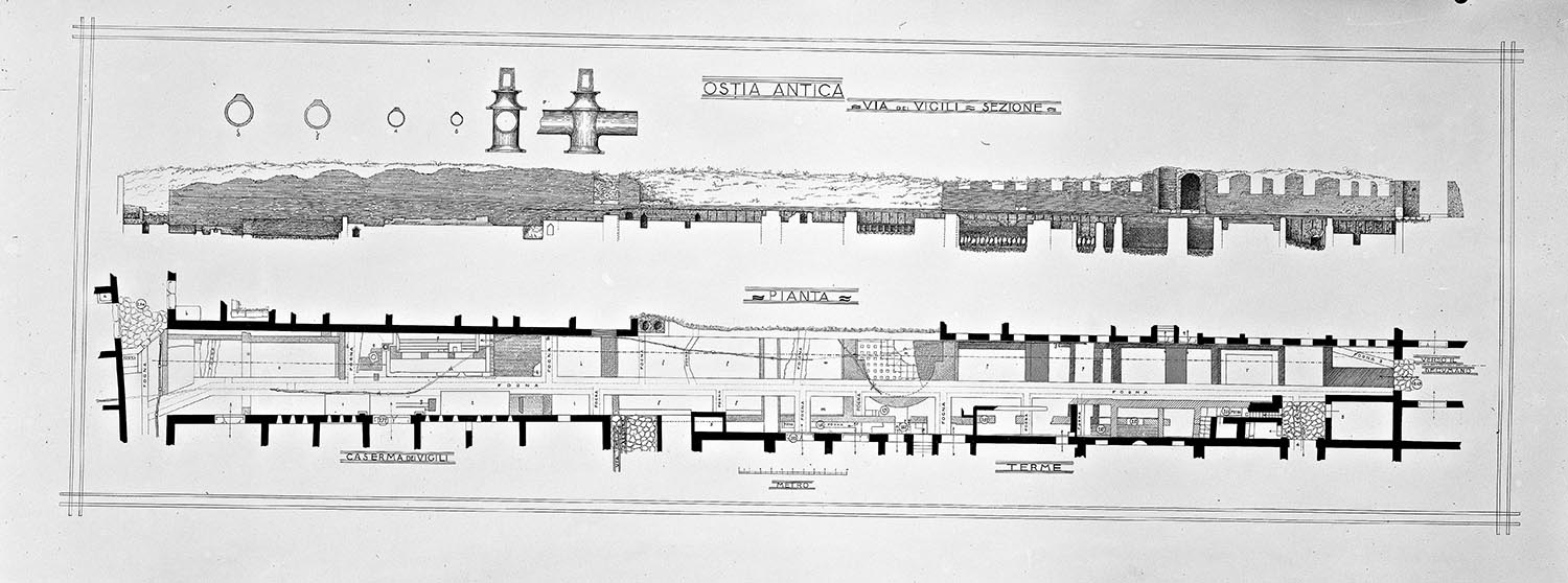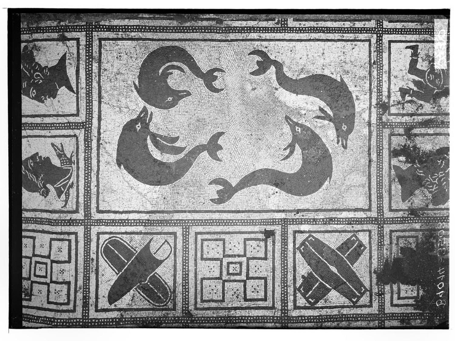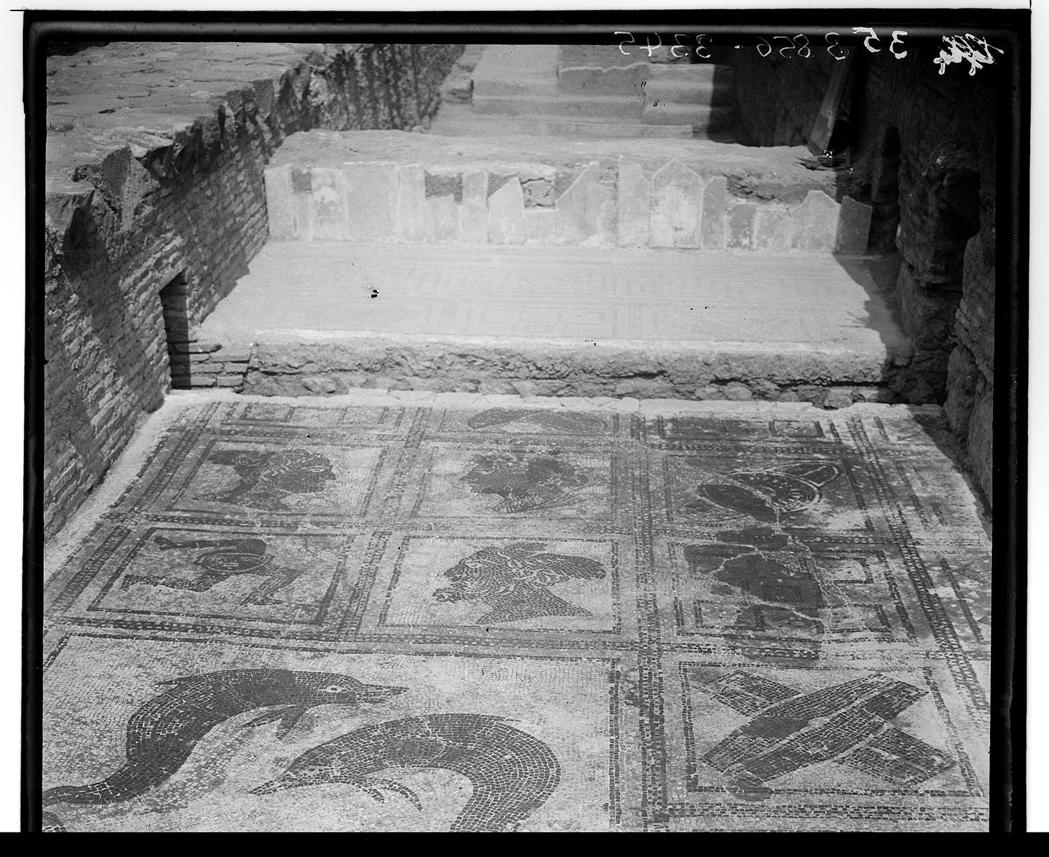 Archaeological soundings beneath the road, dating to the early 2nd century AD, brought to light a bath complex of the period of Claudius (AD 41-54) whose size is impossible to determine. The only portion still visible is a fine black and white mosaic presenting panels with depictions of weapons and geometrical motifs enclosed within a meander border. The central area is adorned with a panel containing depictions of dolphins, flanked by the personifications of the Provinces (Spain, Sicily, Egypt and Africa) and of the winds, symbolized respectively by women’s heads and men’s heads. The figurative motifs probably allude to the development of maritime trade between the provinces of the western Mediterranean and Rome following the construction of the port of Claudius.