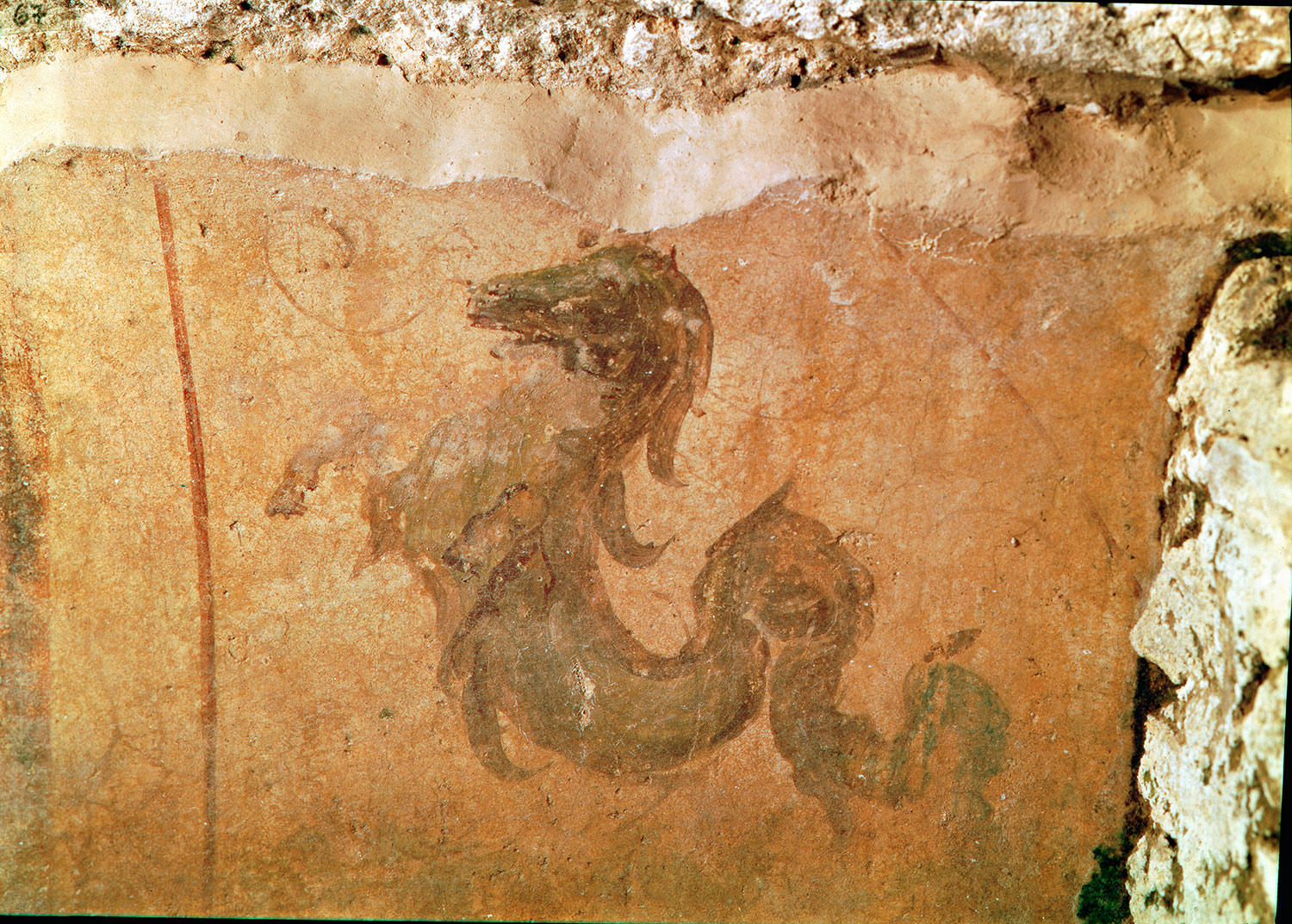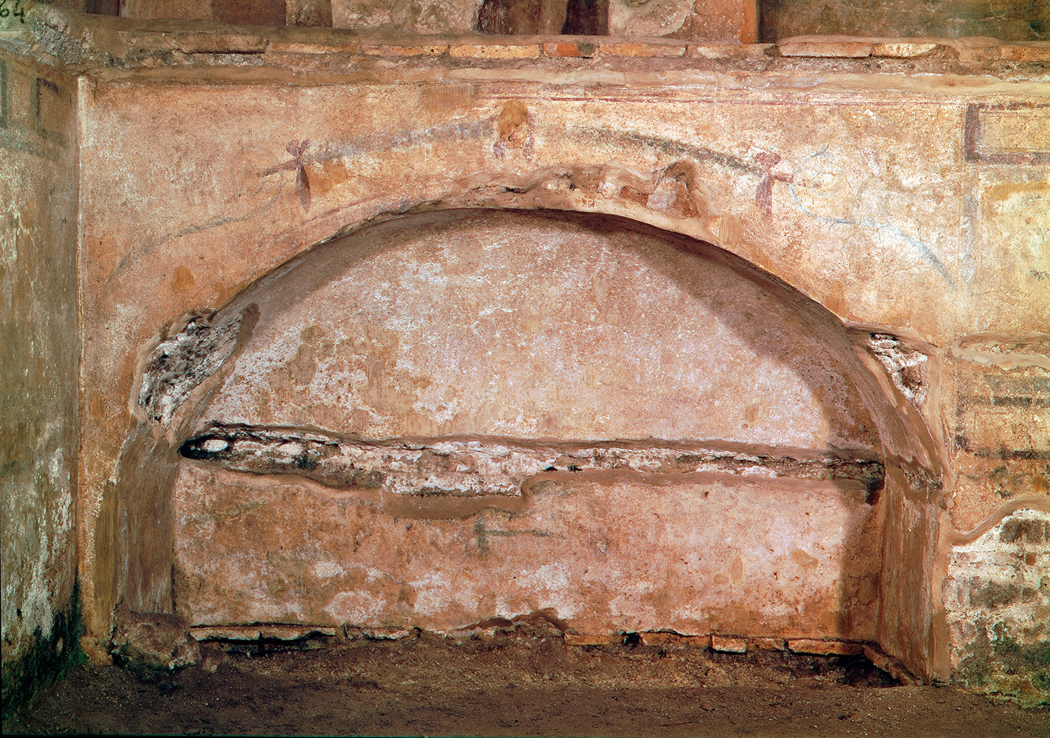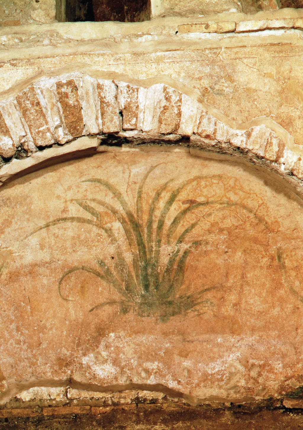 The interior walls are richly decorated with paintings. In the lower register, geometric and figured motifs may be seen, such as winged griffins and a tragic mask, while a marsh landscape with two seahorses is depicted in the rear wall’s arcosolium. The same wall’s central niche was decorated with a couple clasping their right hands (dextrarum iunctio) to seal their marriage bond. Coming from the left wall’s central niche is the painting of a young horseman with his horse; in his left hand he is holding a palm frond, a prize attributed to winning aurigae during Antiquity. These two paintings, dated to 140-150 AD.
