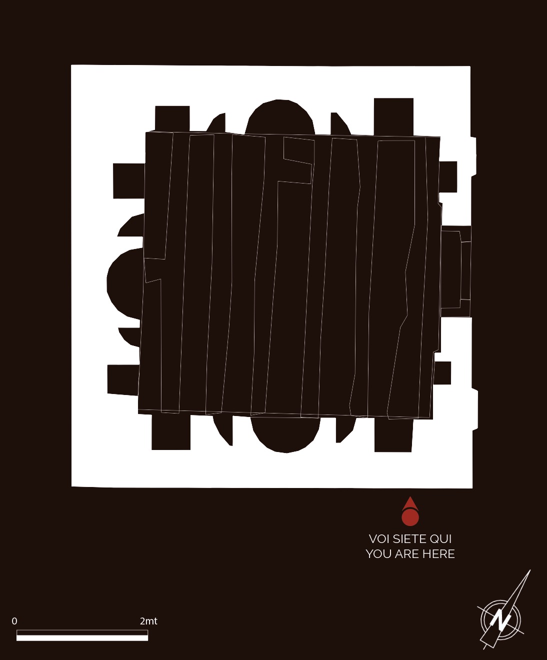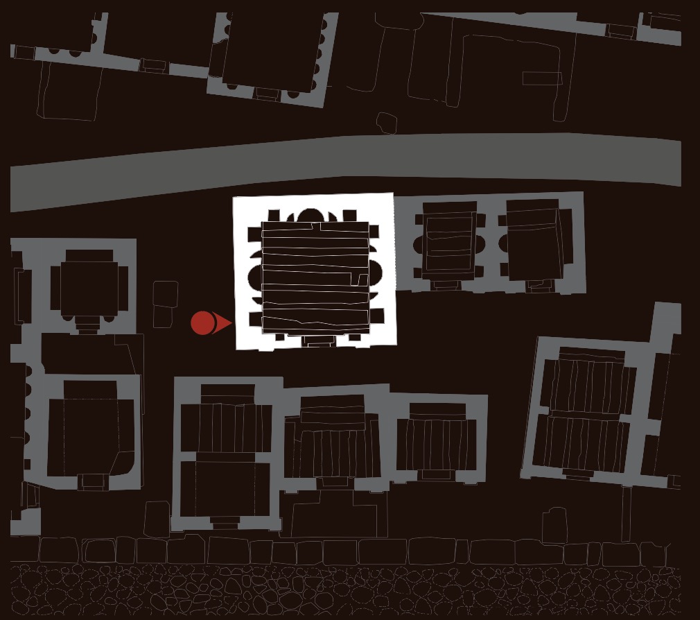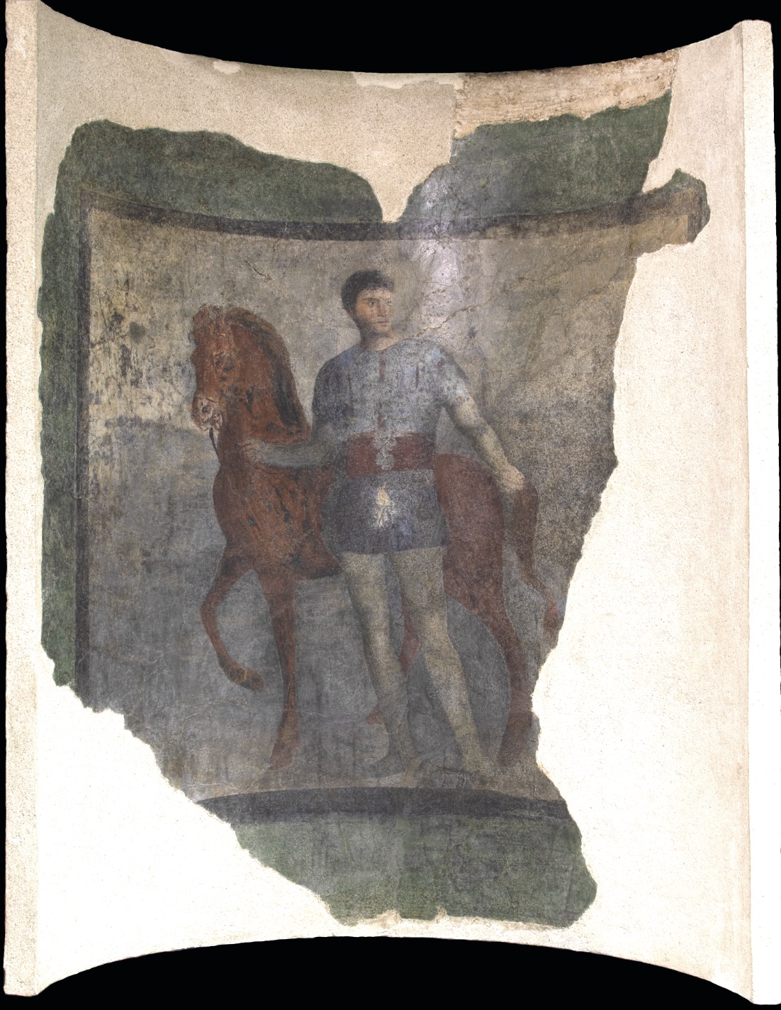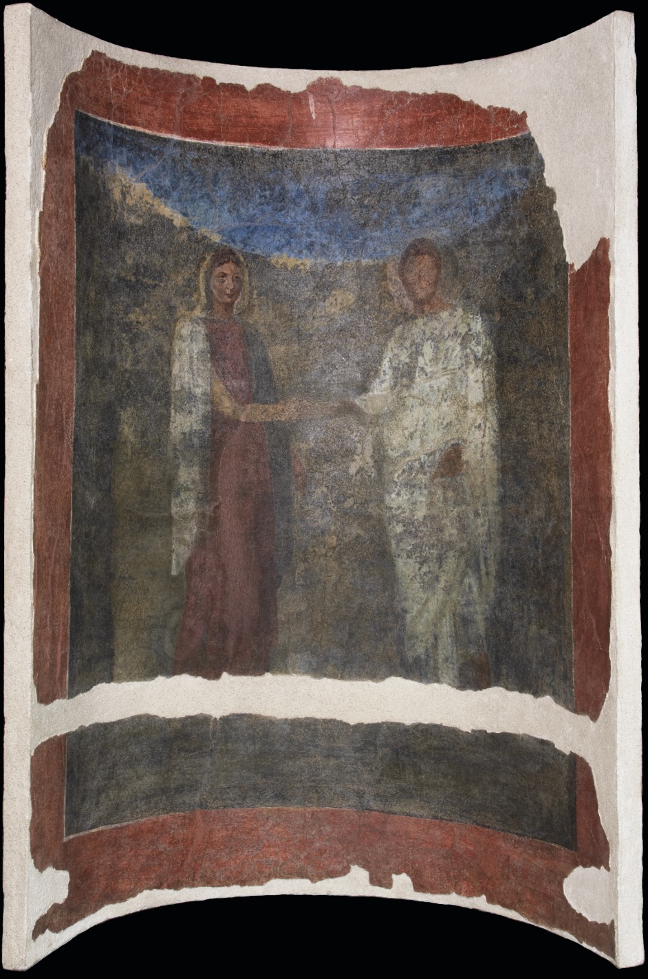 The interior walls are richly decorated with paintings. In the lower register, geometric and figured motifs may be seen, such as winged griffins and a tragic mask, while a marsh landscape with two seahorses is depicted in the rear wall’s arcosolium. The same wall’s central niche was decorated with a couple clasping their right hands (dextrarum iunctio) to seal their marriage bond. Coming from the left wall’s central niche is the painting of a young horseman with his horse; in his left hand he is holding a palm frond, a prize attributed to winning aurigae during Antiquity. These two paintings, dated to 140-150 AD.