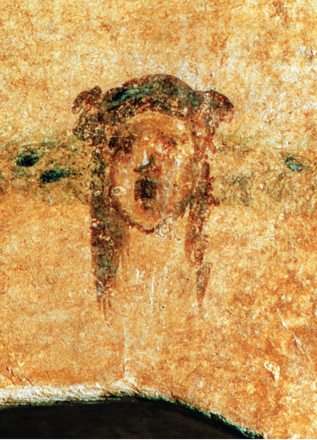 Painted decoration of an arcosolium with depiction of a griffon and tragic mask, now almost vanished