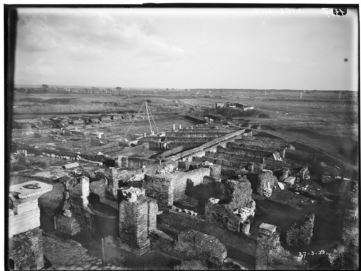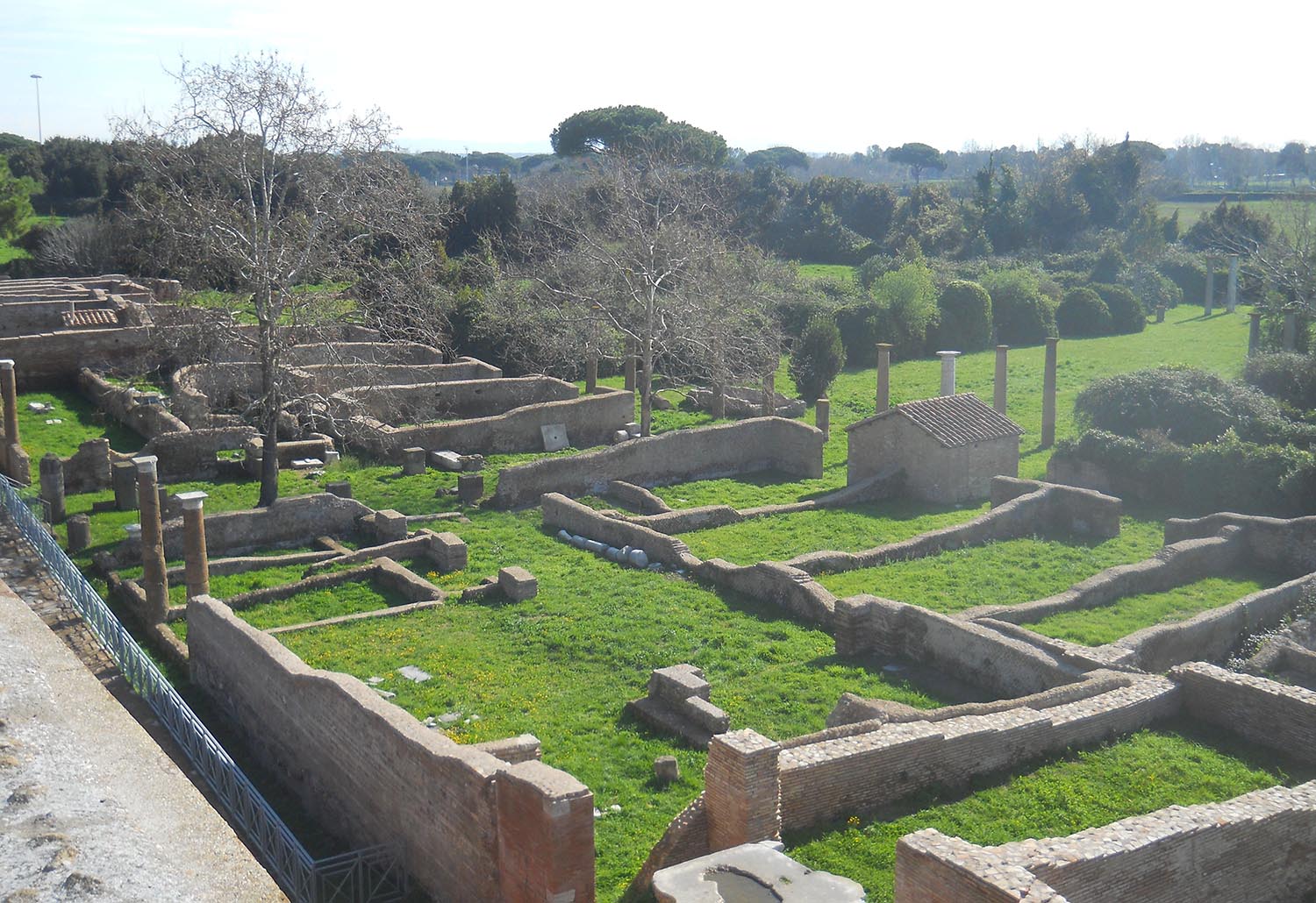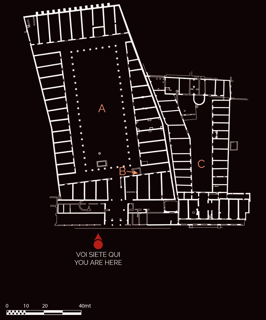 The Horrea (warehouses) of Hortensius (A), perhaps built in the late Republican period (1st century BC), are one of the most ancient examples of such buildings in Ostia and maintained their original level over time. They have a large internal courtyard, surrounded by tufa columns, onto which open the cellae (rooms for storing goods) in opus reticulatum. Between two cellae was a small temple (B) built by Lucius Hortensius, the captain of the fleet at Misenum, who is named on the mosaic floor. The nearby Horrea of Artemis (C), so-called after the discovery of a painting representing the goddess and built in the Trajanic period (AD 98-117), also have an internal courtyard; they were installed over an earlier building of commercial nature, telling us that the area was used predominantly for the storage of goods already in the 1st century BC.
