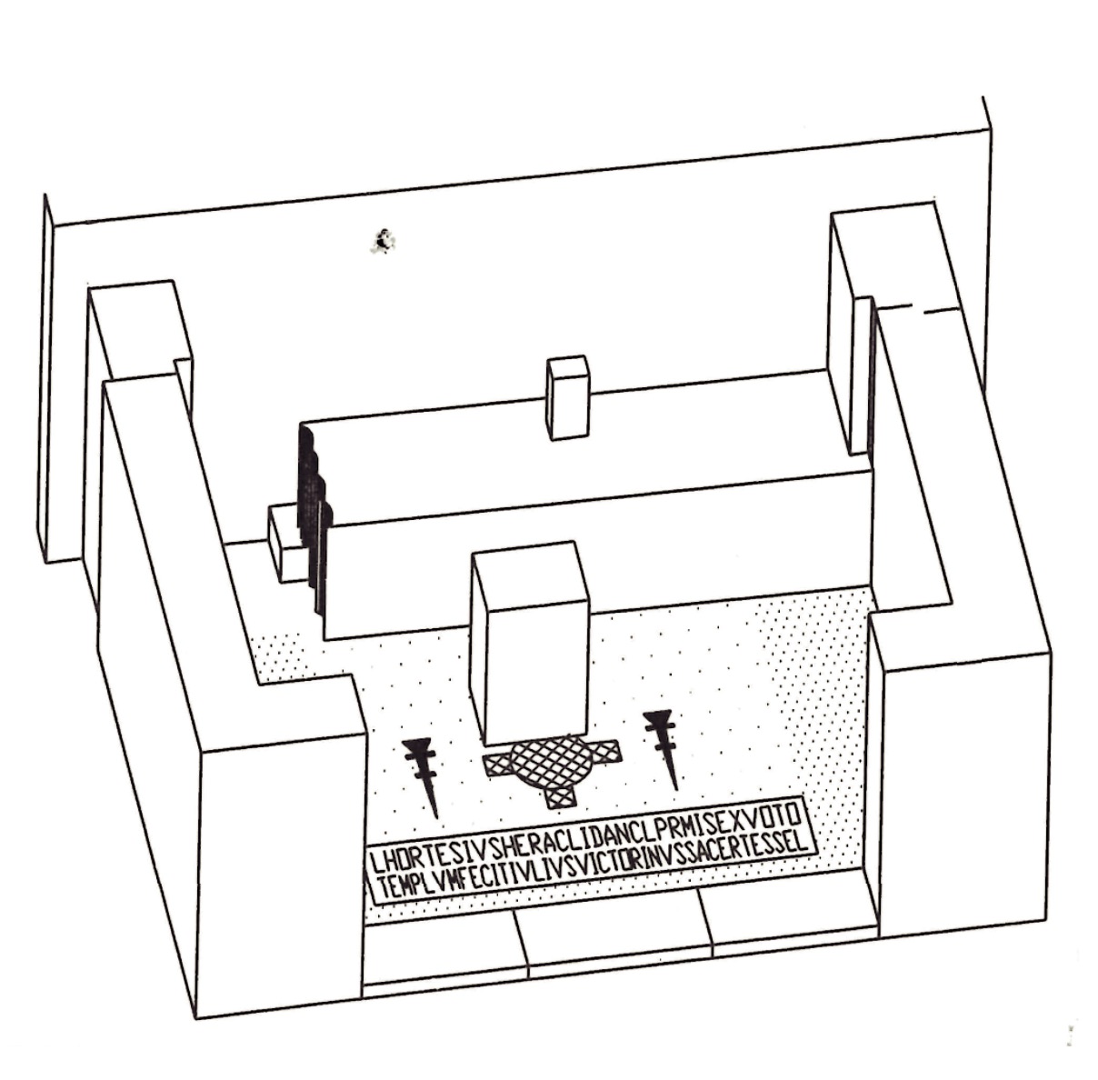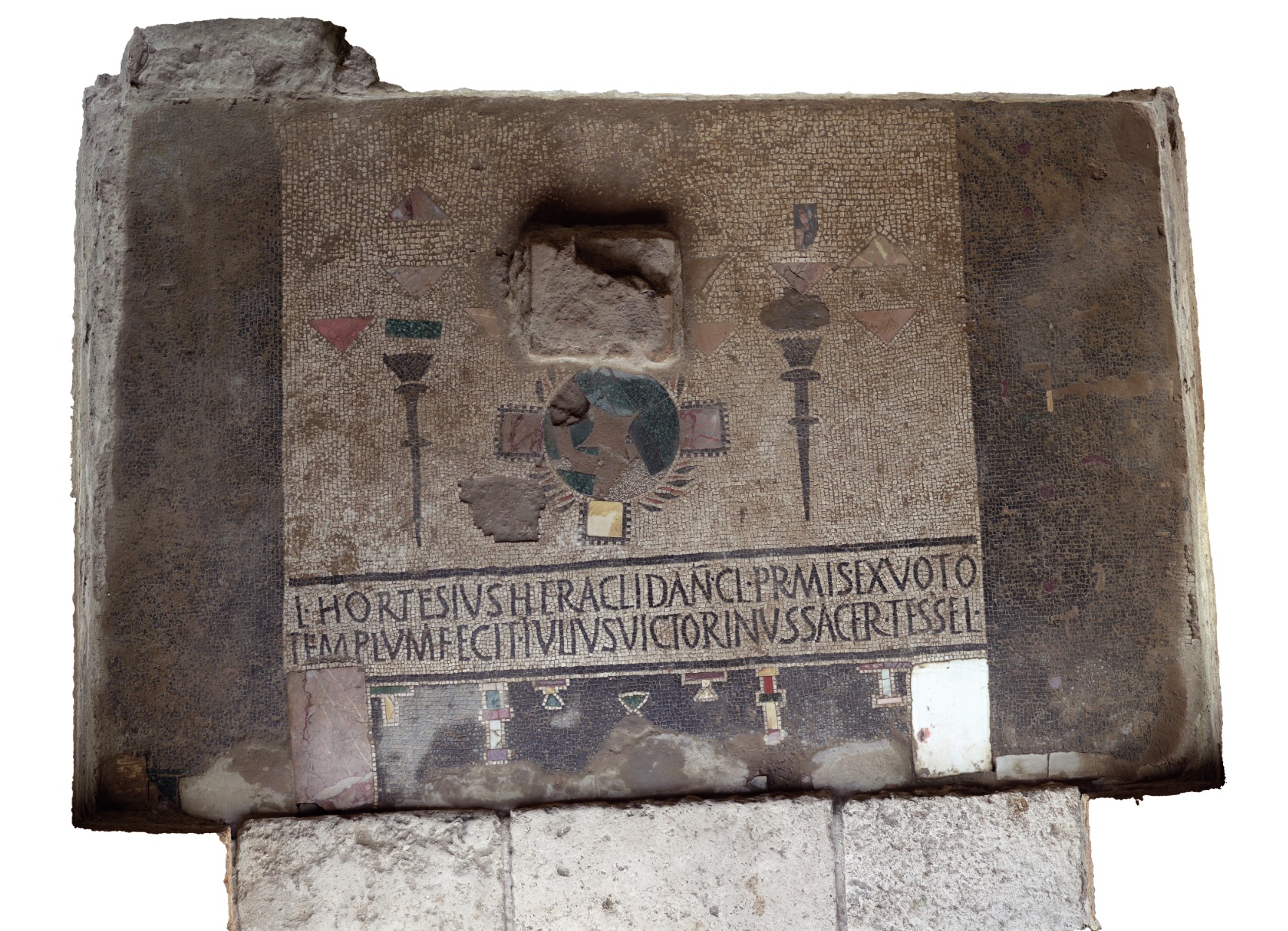 "L. Hortensius Heraclides (?), captain of the praetorian fleet at Misenum, had the small temple built in fulfilment of a vow. The priest Julius Victorinus had the mosaic"