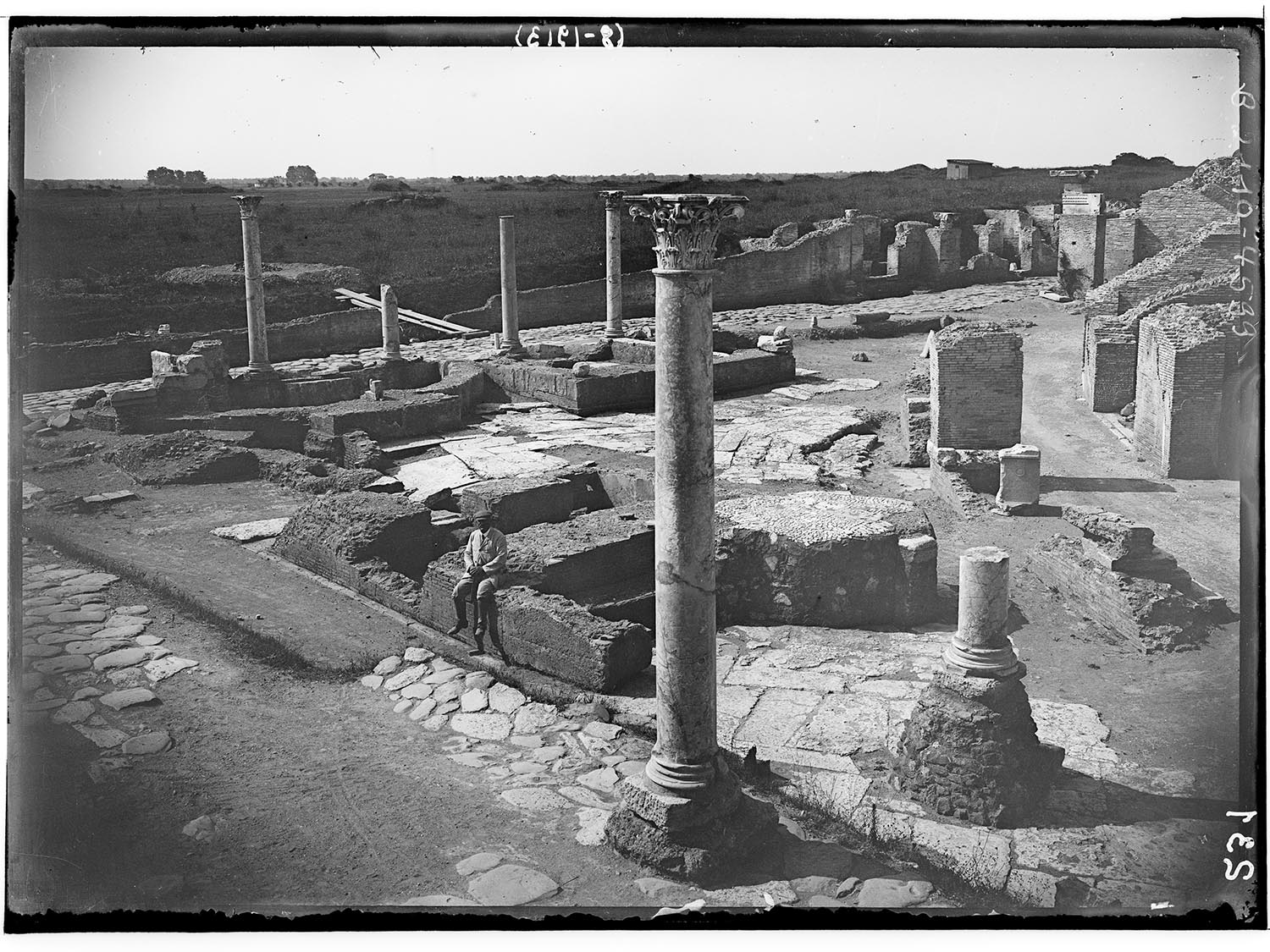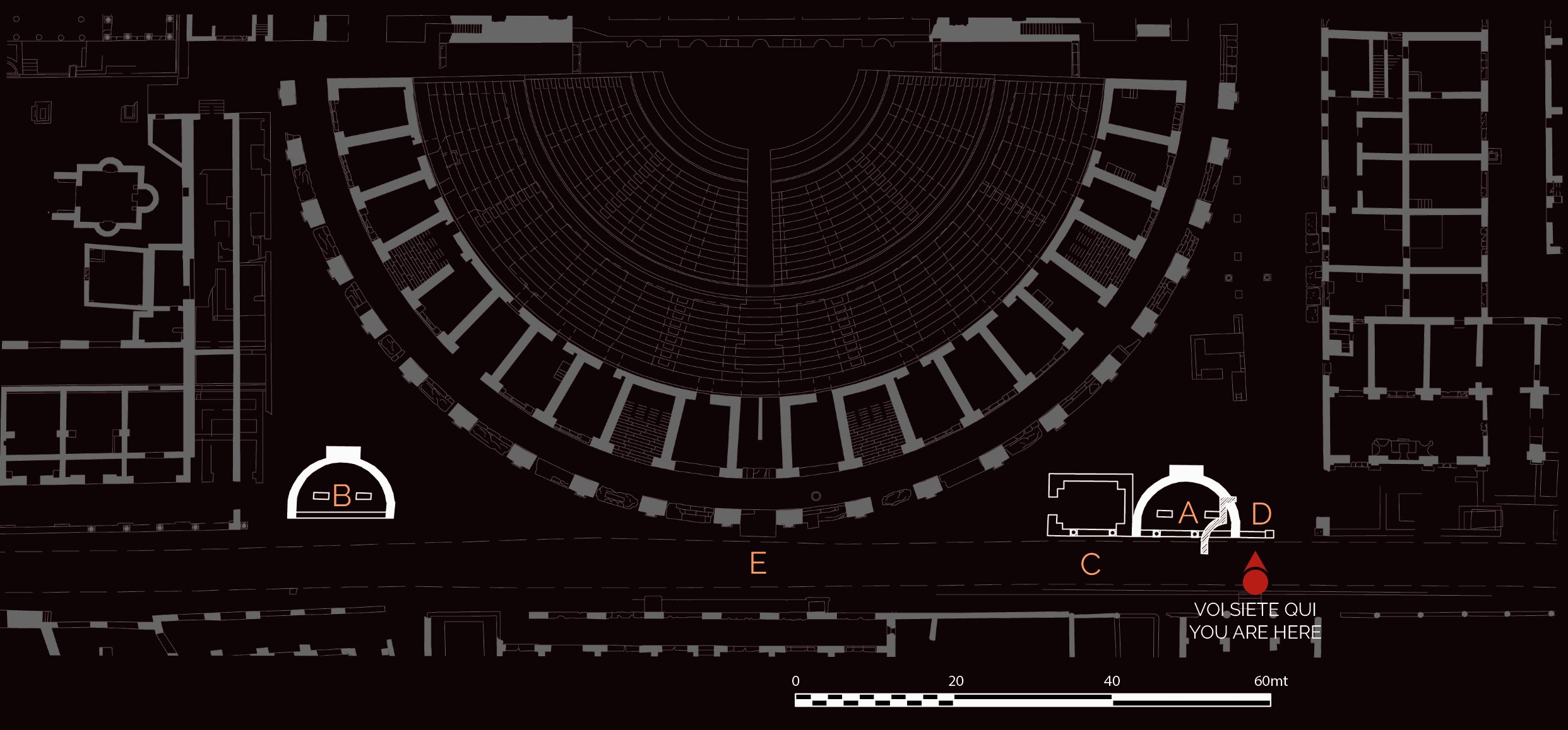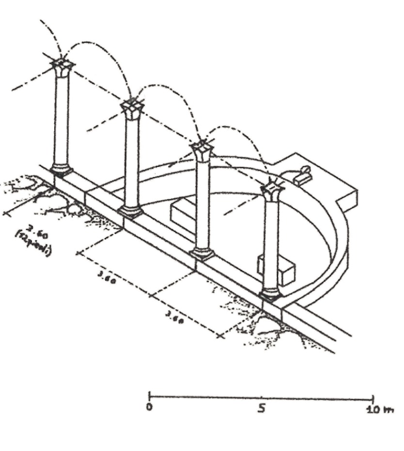 Built to adorn the front of the theatre already during the Domitianic period (late 1st century AD), the two twin nymphaea (A-B) had a semi-circular plan and were incorporated into a small later portico with marble columns (C). An oratory (one of Ostia’s few Christian buildings) was installed in the east nymphaeum in the 4th-5th century AD; it consisted of a chamber with an apse and was made of reused bricks (D). The oratory was built to commemorate the martyrs of Ostia (including St Aurea and St Cyriacus), killed in AD 269 near the arch of Caracalla (E) that stands in front of the theatre. It maintained its religious function until the medieval period, when the town was already in ruins.