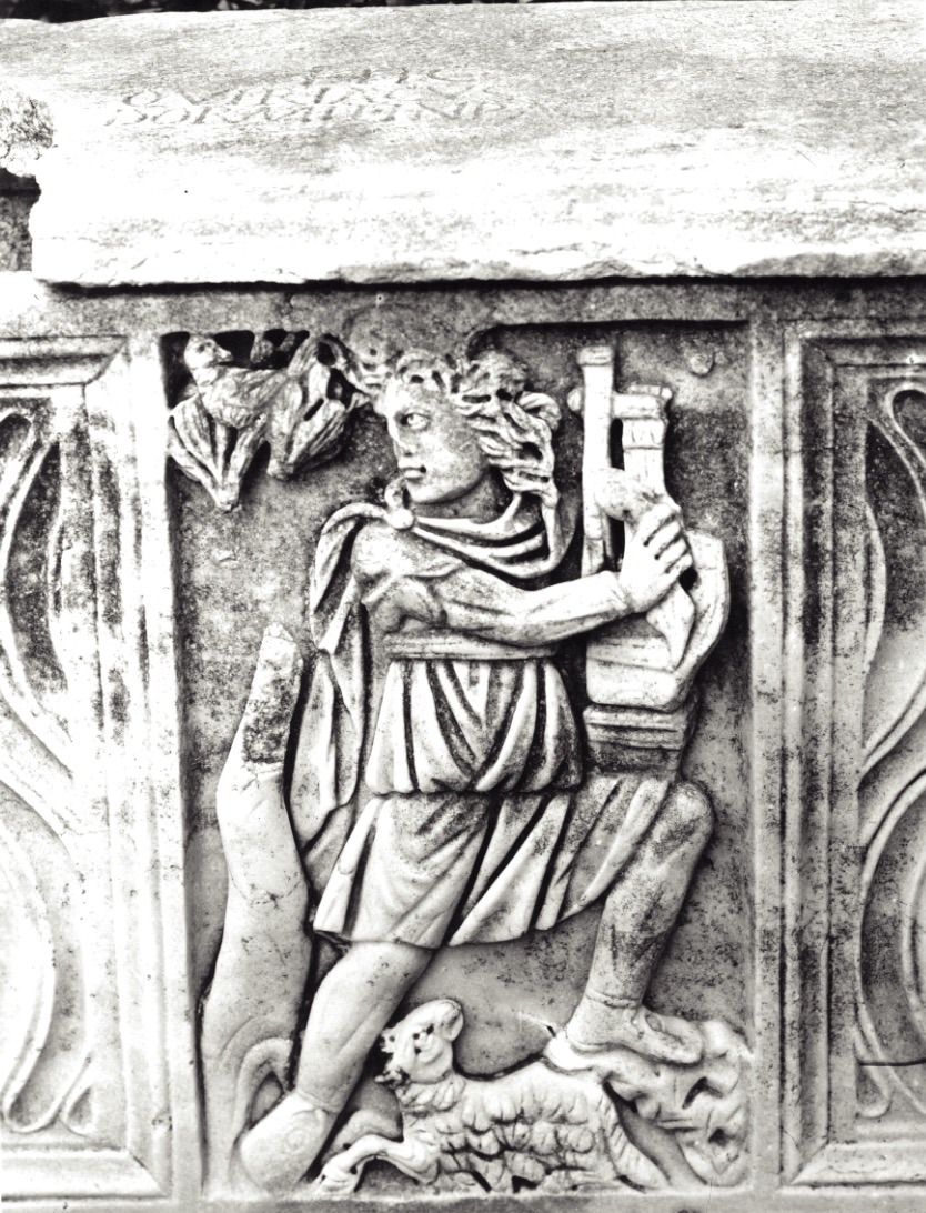 Detail of the sarcophagus with the myth of Orpheus, whose inscription mentions the martyr St Cyriacus