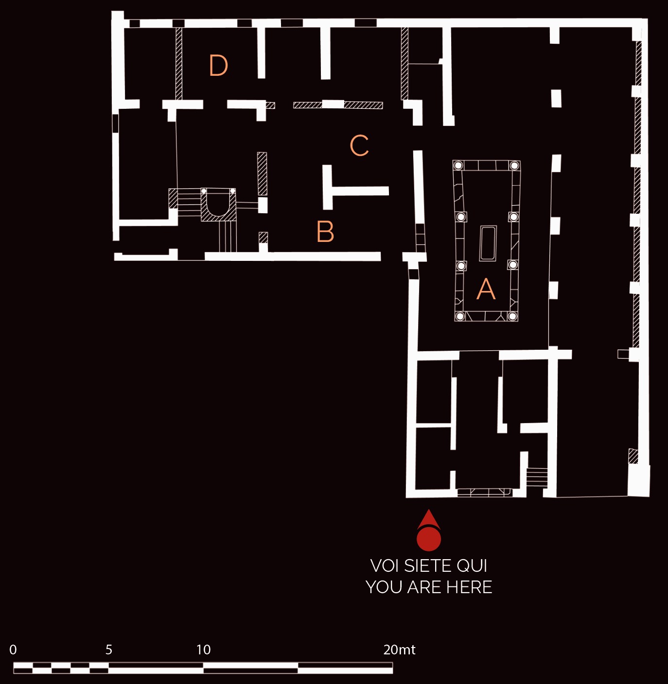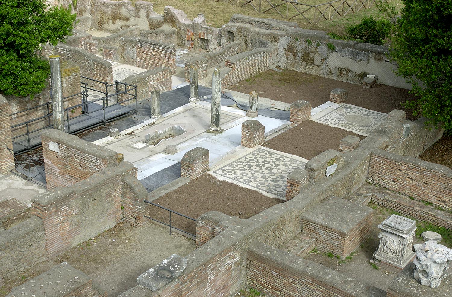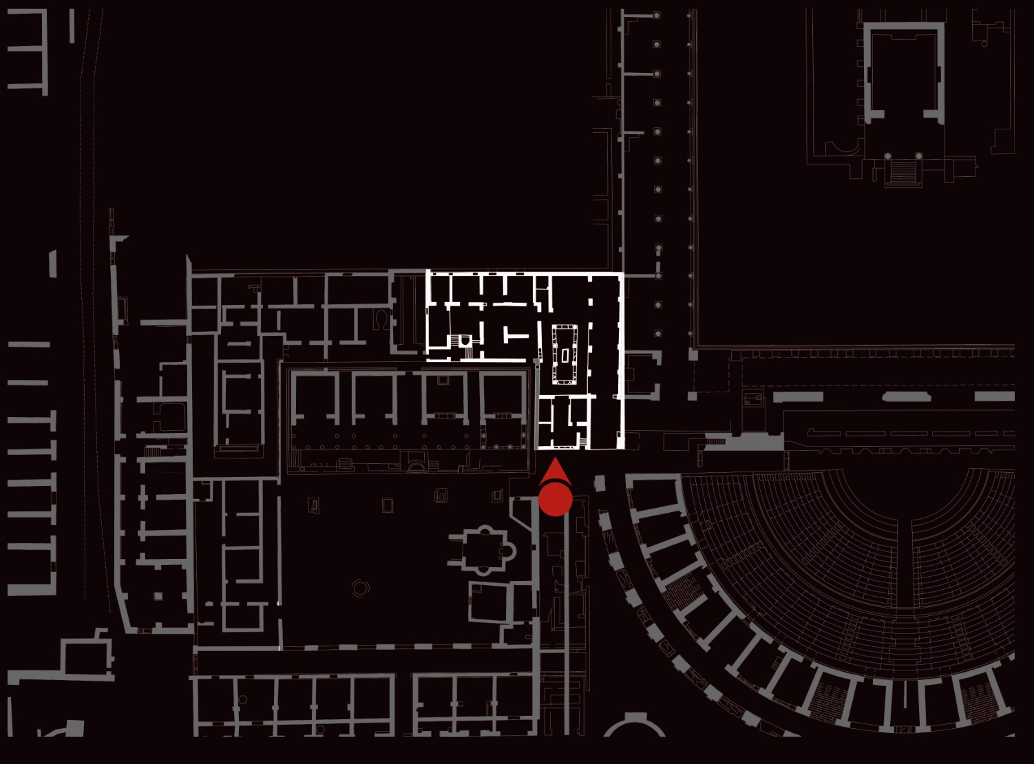 Different construction phases can be seen in the house, the first of which has been connected to the nearby small temples of the late Republican period and may have belonged to the individual who built them, Publius Lucilius Gamala. The brick building now visible can be dated to around the mid- 2nd century AD: the inscription preserved on a fistula (lead water pipe) names the owner of the house during this phase as Lucius Apuleius Marcellus, perhaps to be identified as the author of the Metamorphoses, a famous literary work of the 2nd century AD. The domus (house) had a courtyard (A) aligned with the entrance, which takes the form of an atrium with eight Corinthian columns and an impluvium (central basin), with a row of rooms opening onto it to the east whilst other rooms were arranged in the west wing. Most of the rooms had mosaic floors.