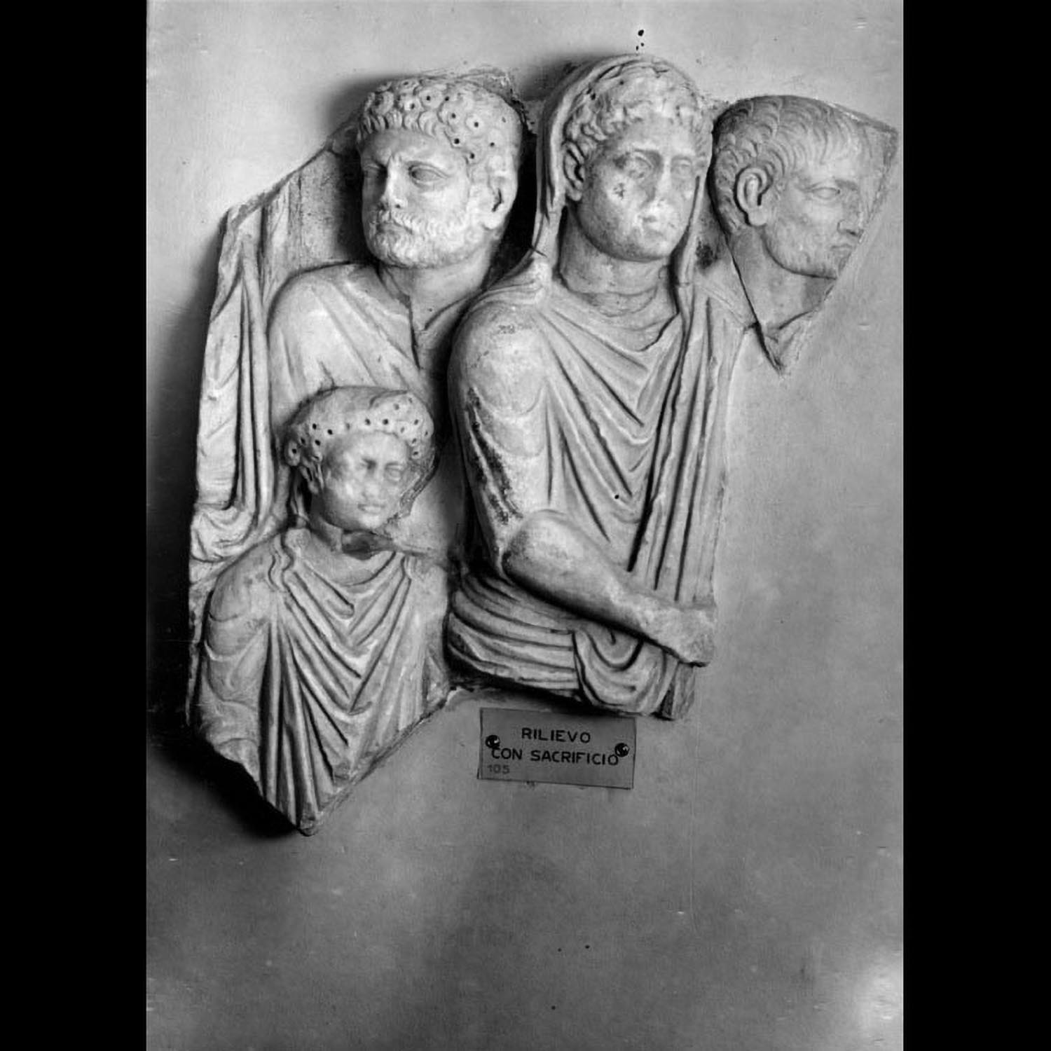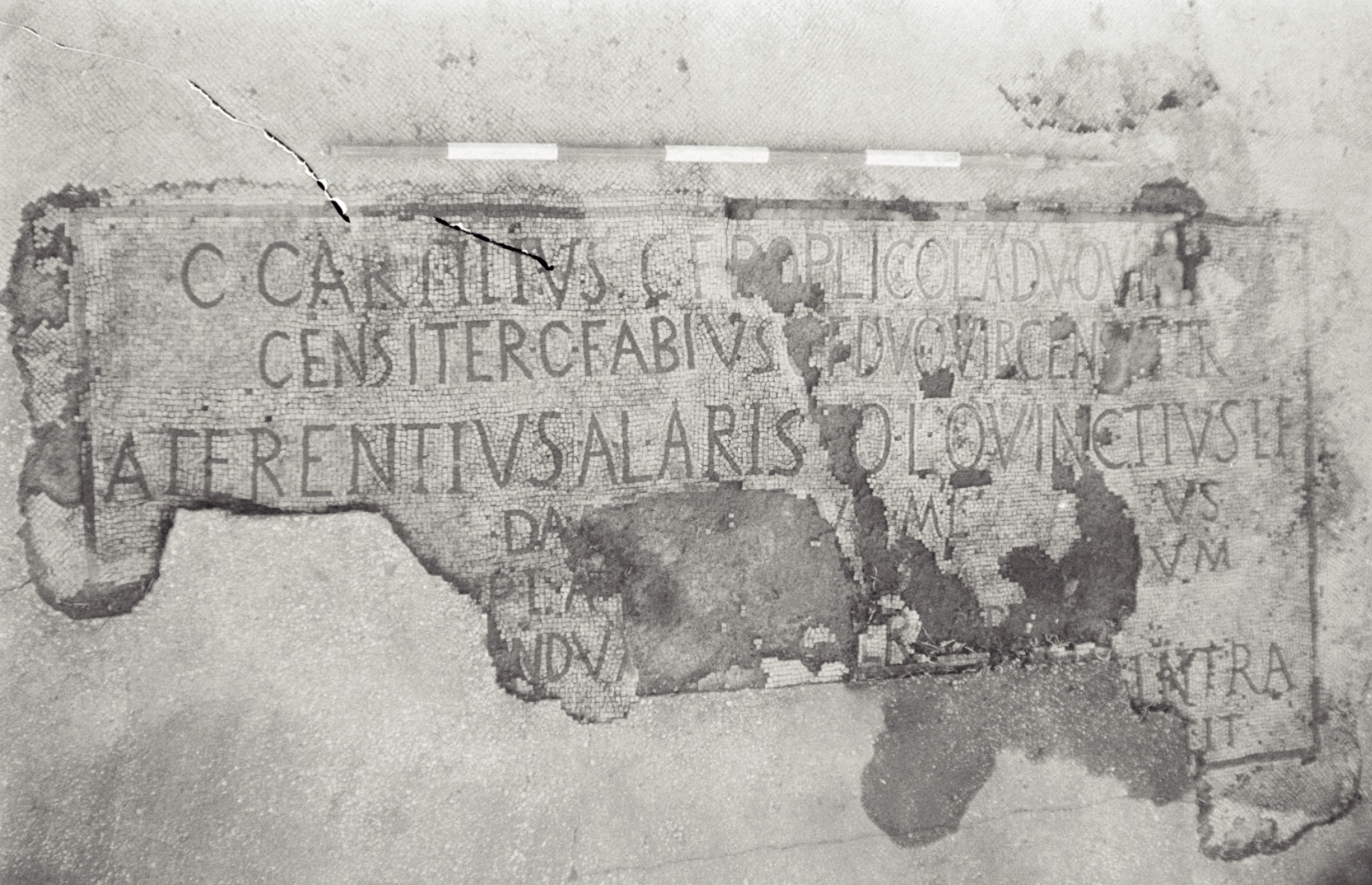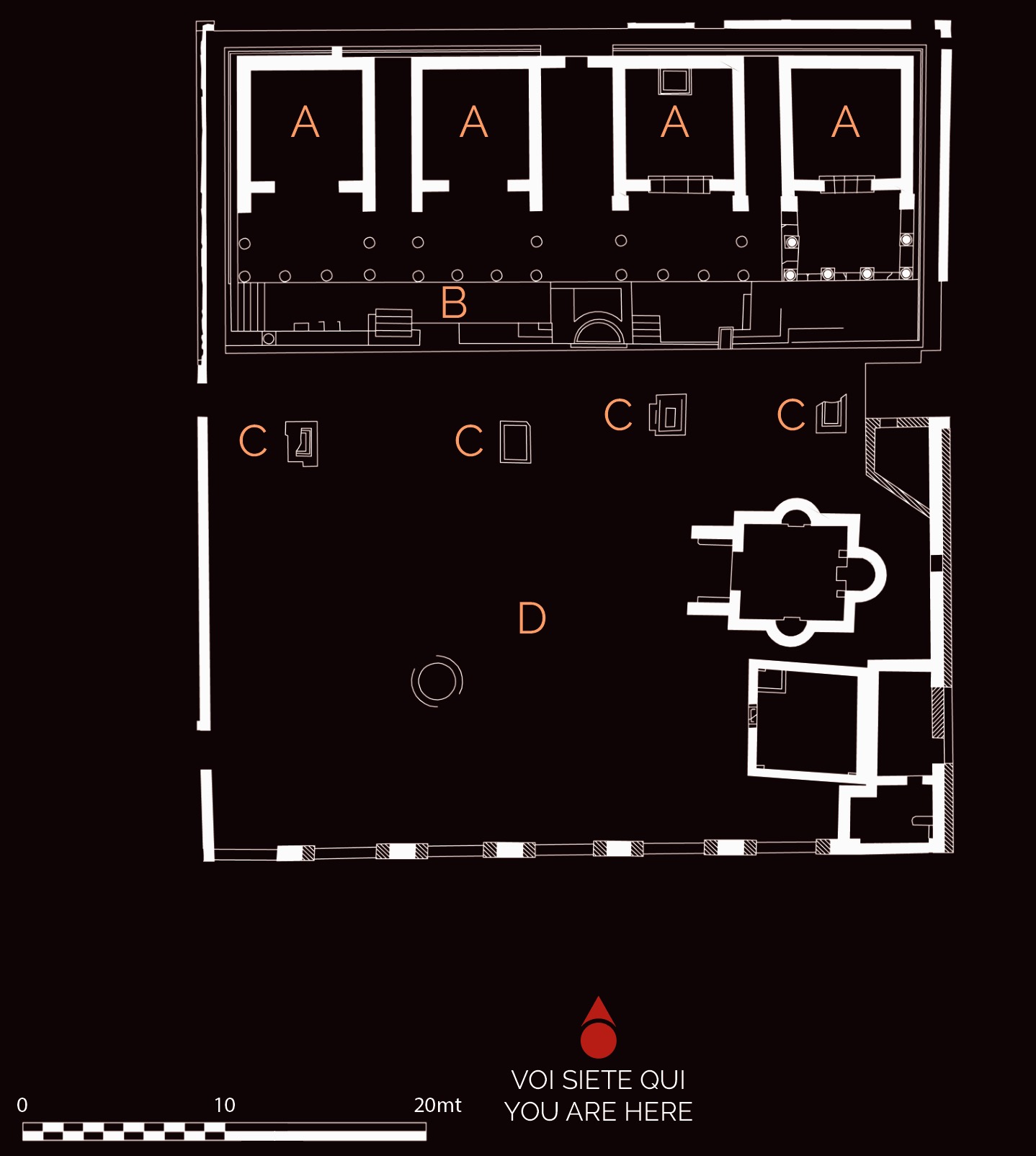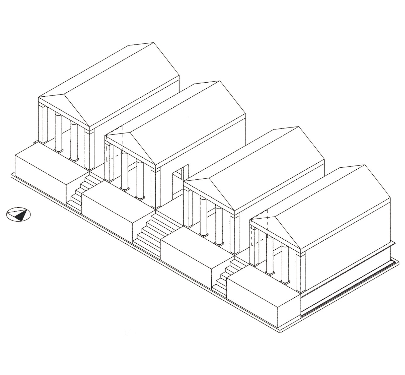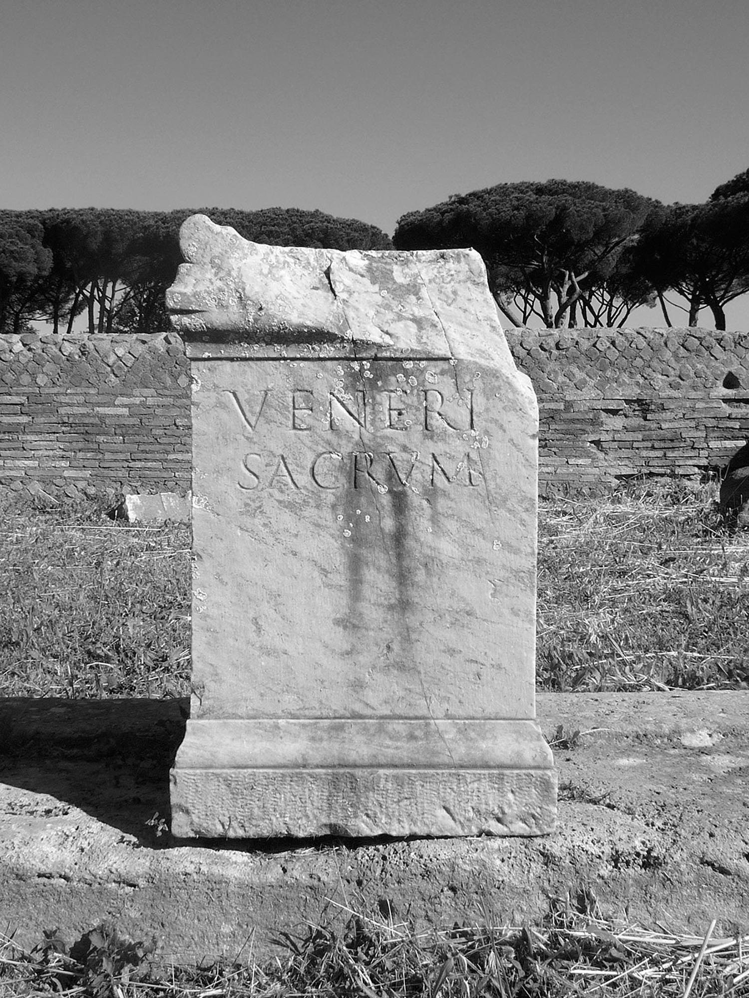 The complex, probably built in around the mid-1st century BC, consists of four buildings (A) of identical shape and size in opus quasi reticulatum on a single podium (B), facing towards a vast open area bounded by a wall (D). These are the temples of Venus, Fortuna, Ceres and Spes (Hope) mentioned in an inscription found at Portus and built by Publius Lucilius Gamala, a magistrate belonging to an important Ostian family. The sanctuary, dedicated to deities who protected sailing and commerce, lay near the river port within the area of public land marked out by the boundary stones of Caninius. The little temples were restored on numerous occasions, as we know from both the mosaic inscription of the westernmost temple mentioning the duumvir (municipal magistrate) Gaius Cartilius Poplicola (Augustan period) and the addition of a porch to the easternmost temple.