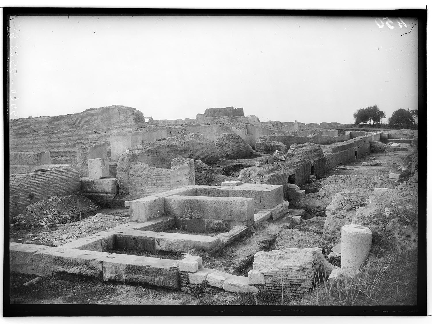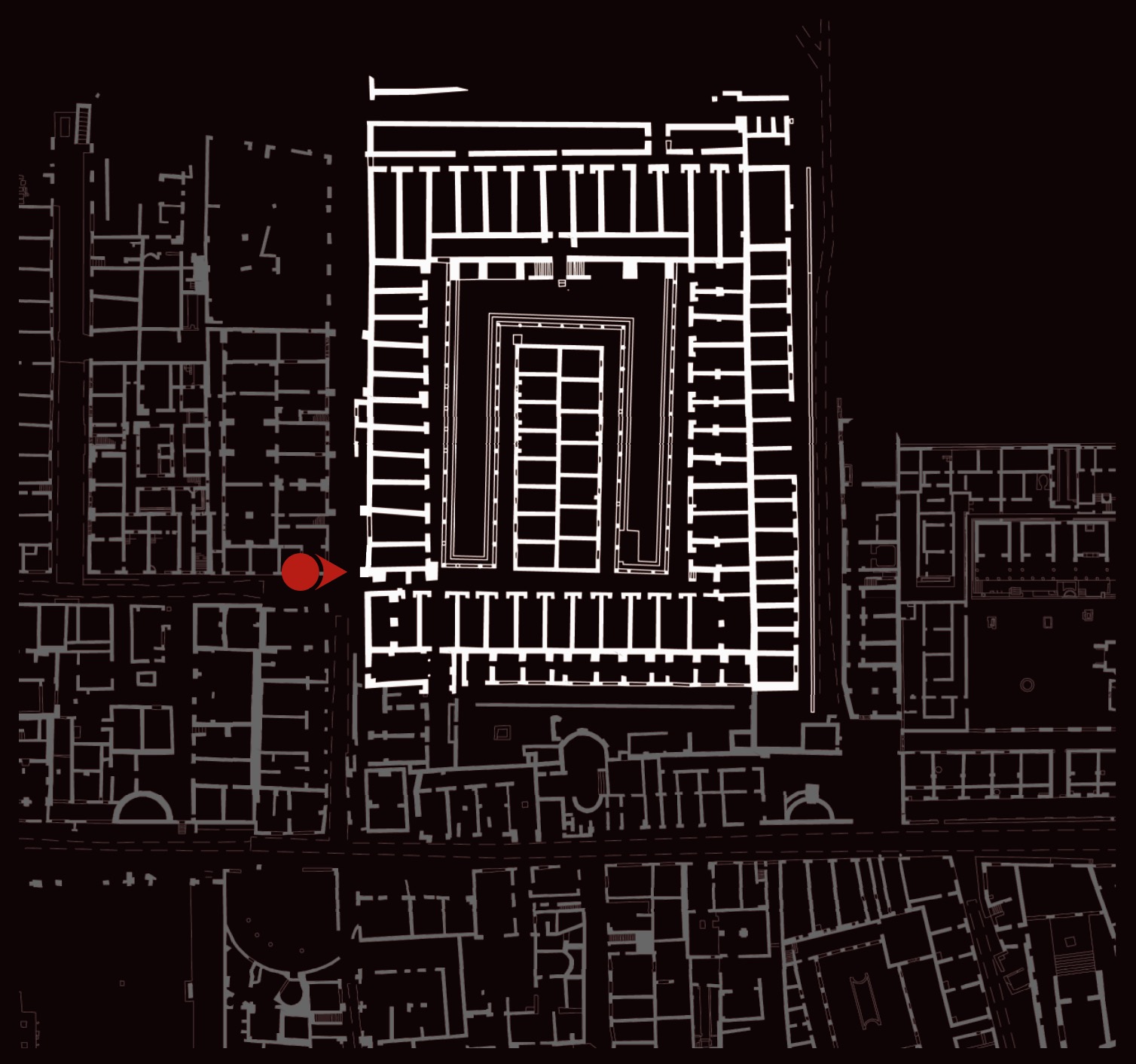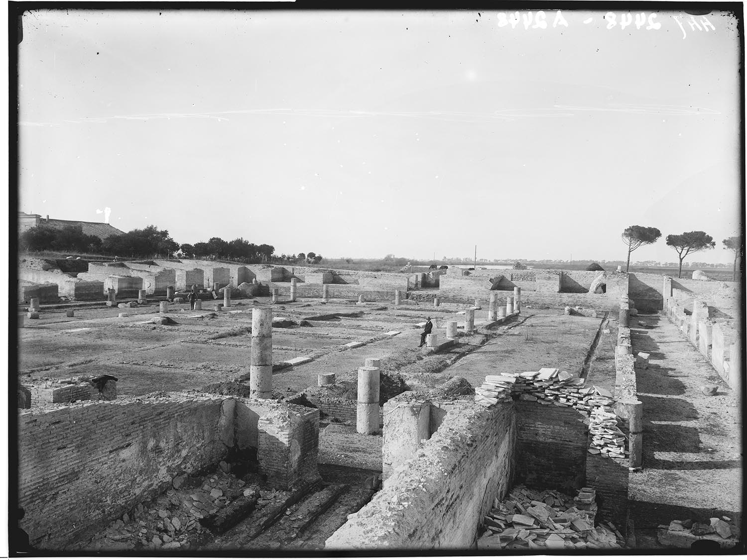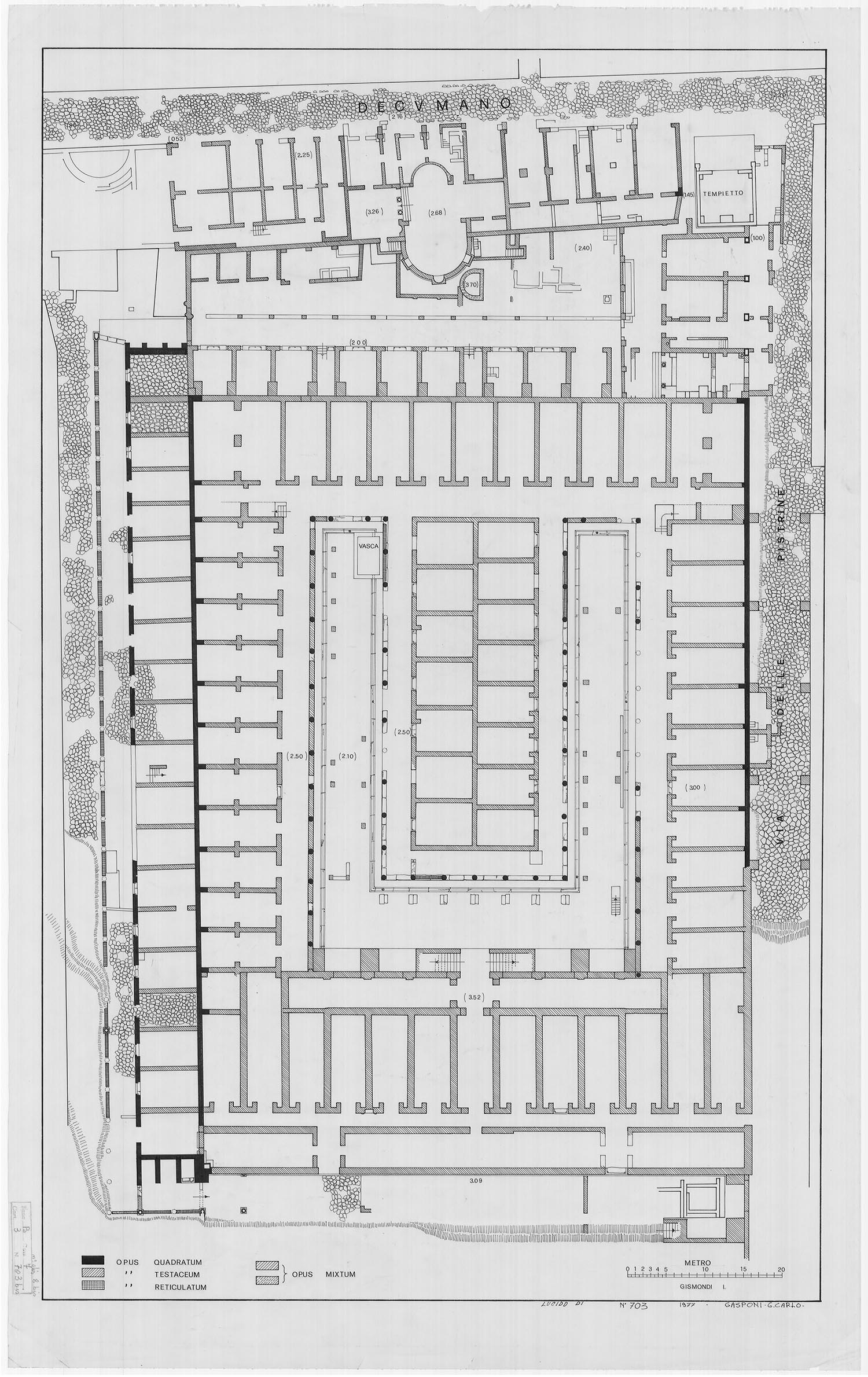 Ostia’s largest commercial building is traditionally dated to the period of the emperor Claudius (AD 41-54), though recent studies have proposed an initial date in the 1st century BC. It had a porticoed courtyard with tufa columns (B), around which the cellae (storage rooms) (C) were arranged on three sides. It was completely rebuilt between the late 2nd century and the early 3rd century AD, when the brick walls were renovated, two parallel rows of cellae were added in the centre of the courtyard and the second storey was built. At this time, the floors of all the cellae were raised using suspensurae (little brick pillars), thus creating a space that insulated the grain stored here from damp.