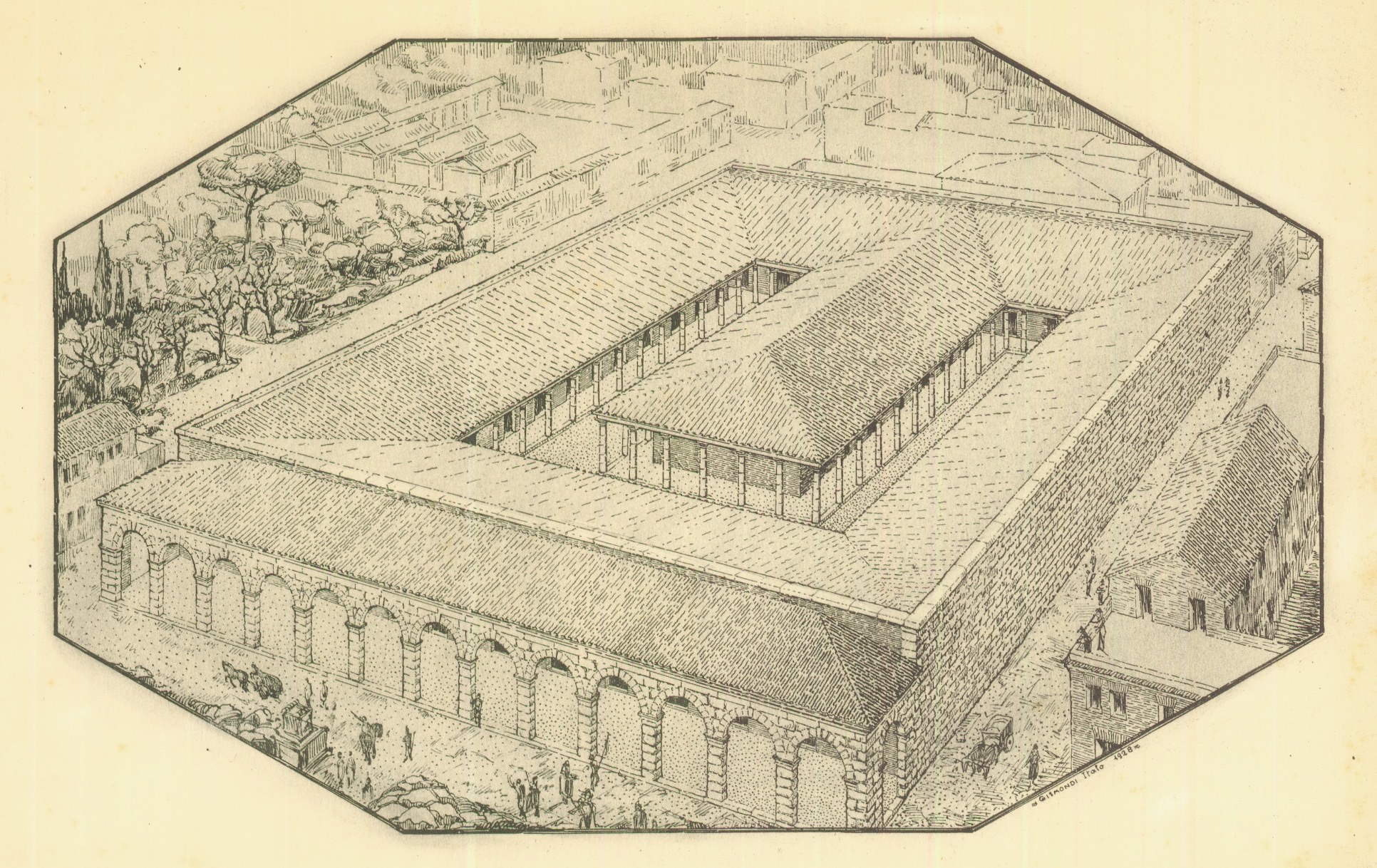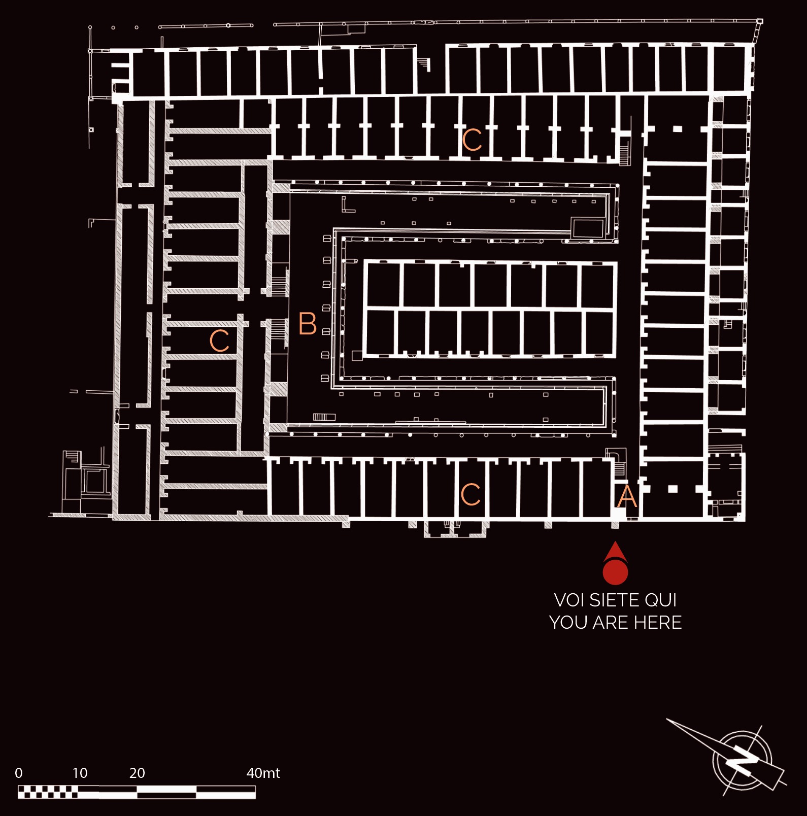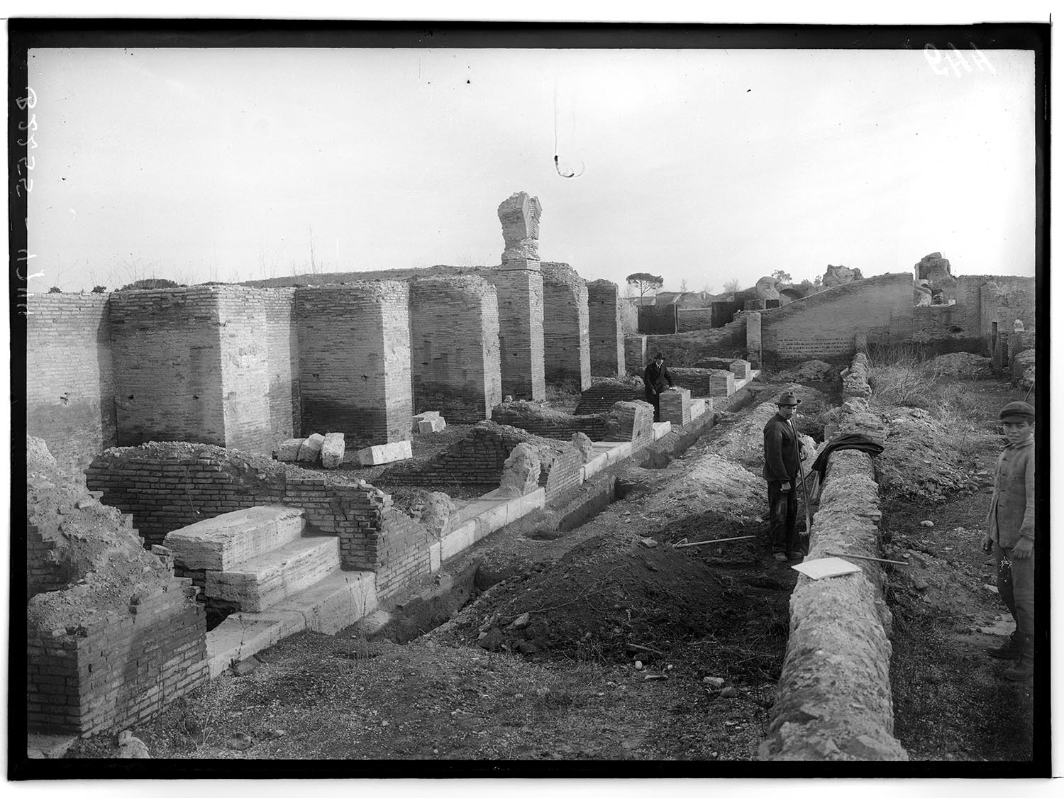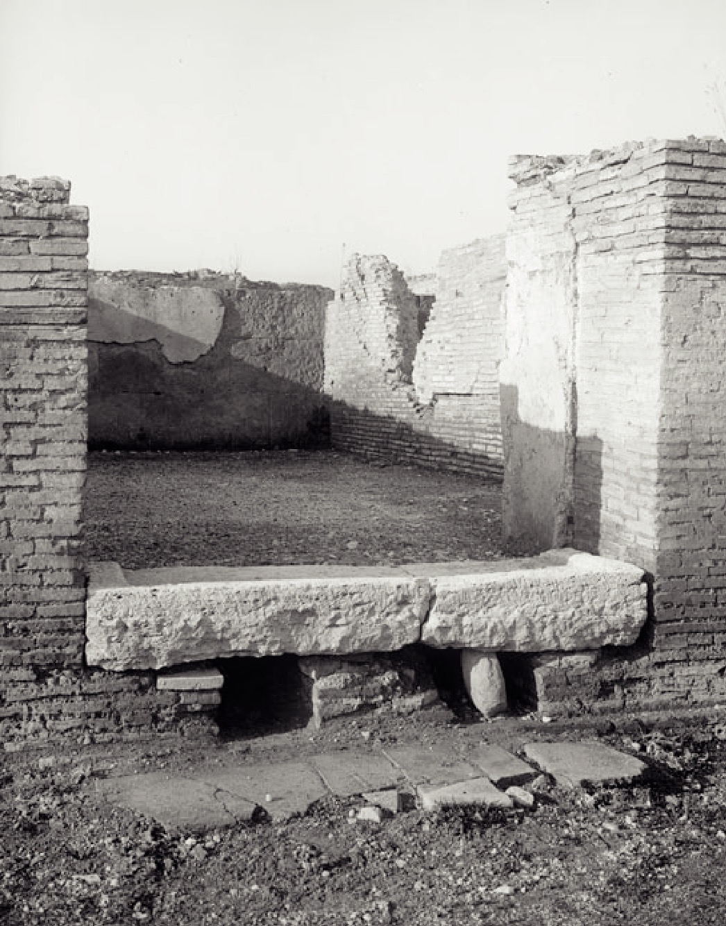 Ostia’s largest commercial building is traditionally dated to the period of the emperor Claudius (AD 41-54), though recent studies have proposed an initial date in the 1st century BC. It had a porticoed courtyard with tufa columns (B), around which the cellae (storage rooms) (C) were arranged on three sides. It was completely rebuilt between the late 2nd century and the early 3rd century AD, when the brick walls were renovated, two parallel rows of cellae were added in the centre of the courtyard and the second storey was built. At this time, the floors of all the cellae were raised using suspensurae (little brick pillars), thus creating a space that insulated the grain stored here from damp.