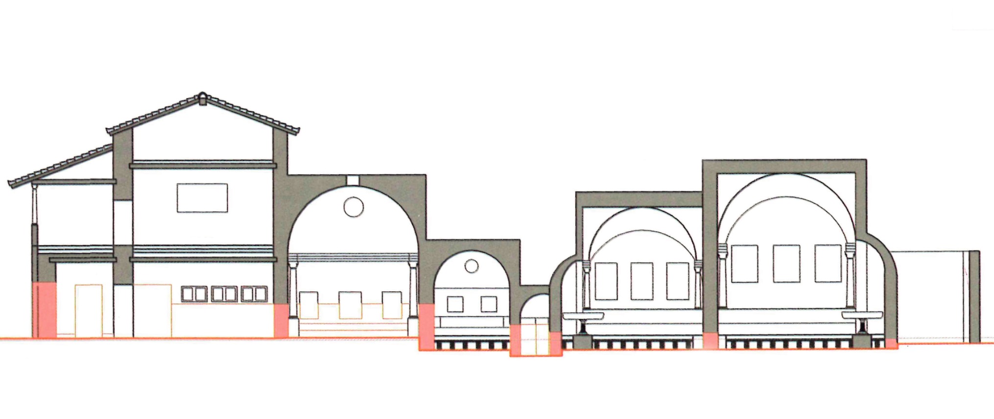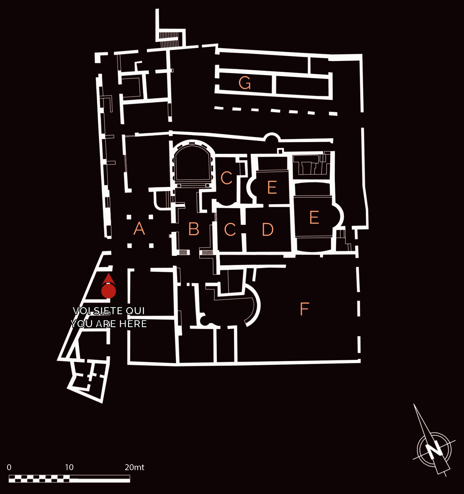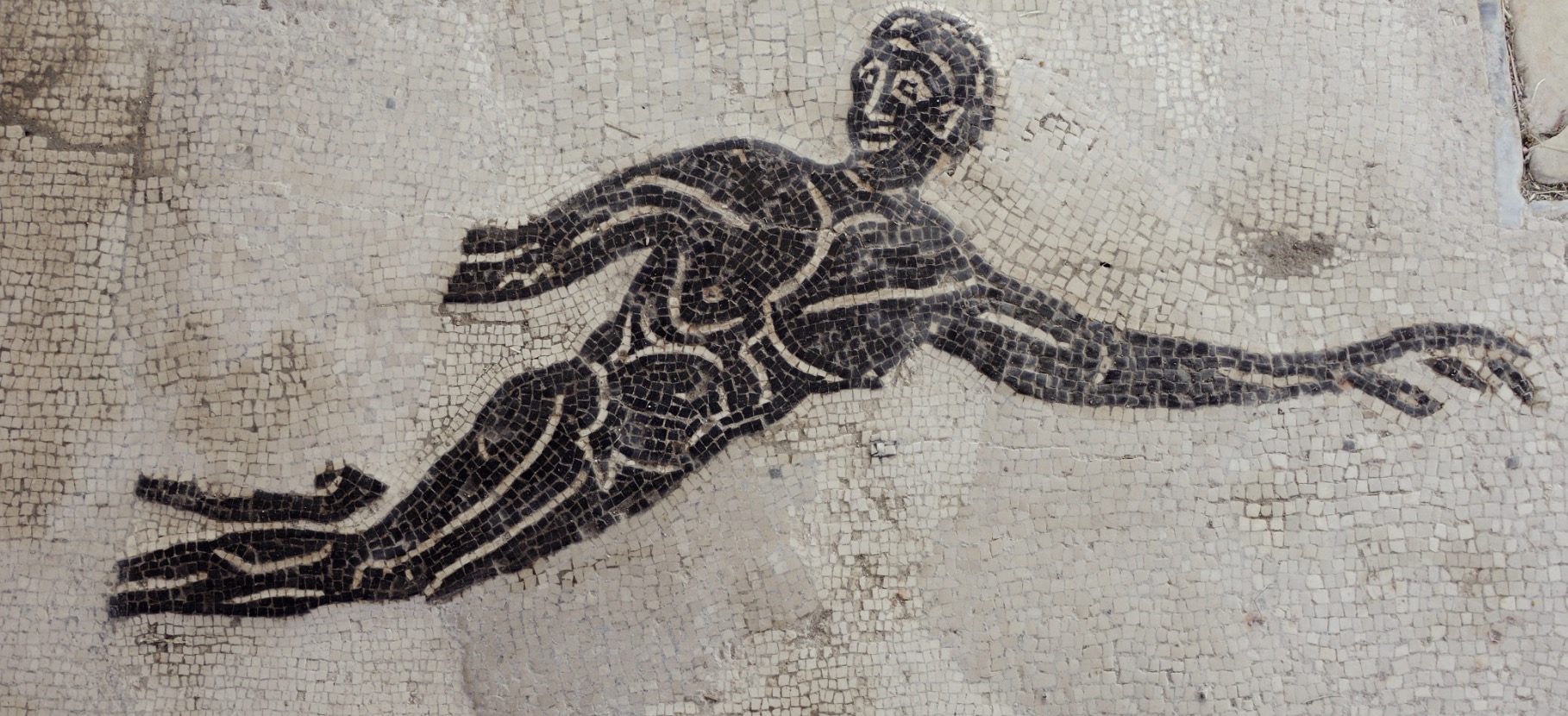 Built in the late Flavian period (late 1st century AD), the baths underwent significant transformations during the 2nd century and were then precociously abandoned in the mid-3rd century AD. The entrance corridor built through the nearby Sanctuary of the Bona Dea led into a vestibule (A) giving access both to the gymnasium sector and the bath rooms. A visit to the baths began in the frigidarium (room for cold baths) (B), which has a mosaic floor depicting a swimmer. This was followed by two tepidaria (rooms for warm baths) (C), one of which was decorated with stucco reliefs, a laconicum (steam room) (D) and two calidaria (rooms with hot baths) (E). A large two-storey cistern (G) guaranteed the baths’ water supply; they were also fed by the city aqueduct through lead pipes.