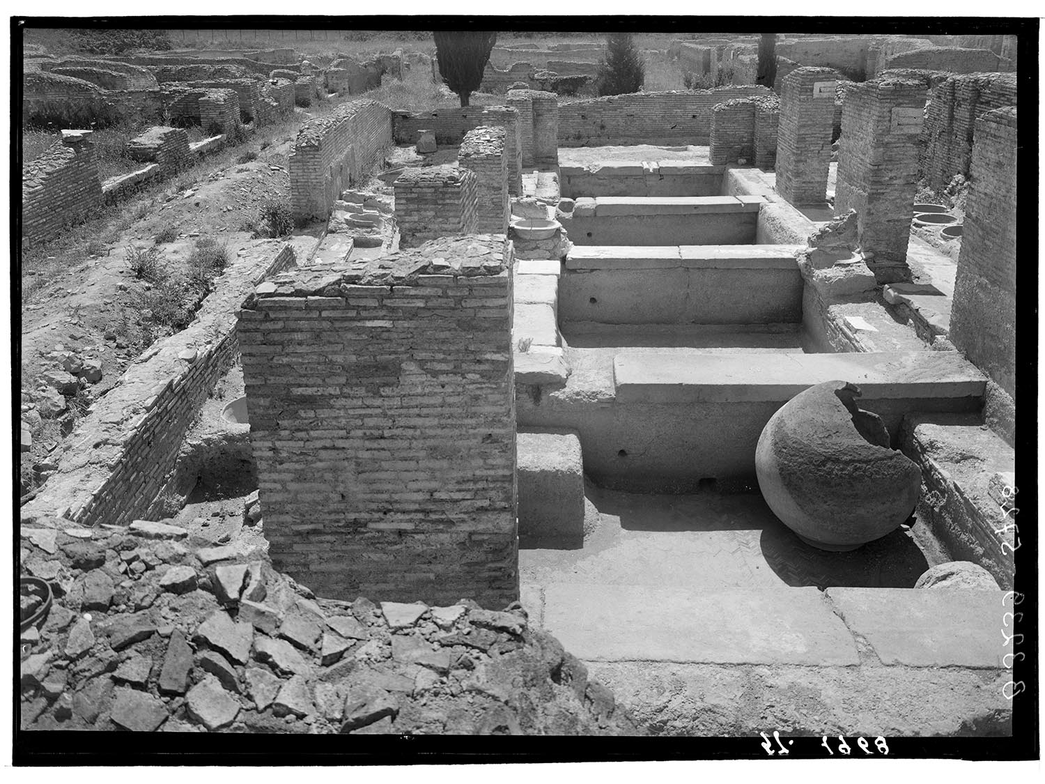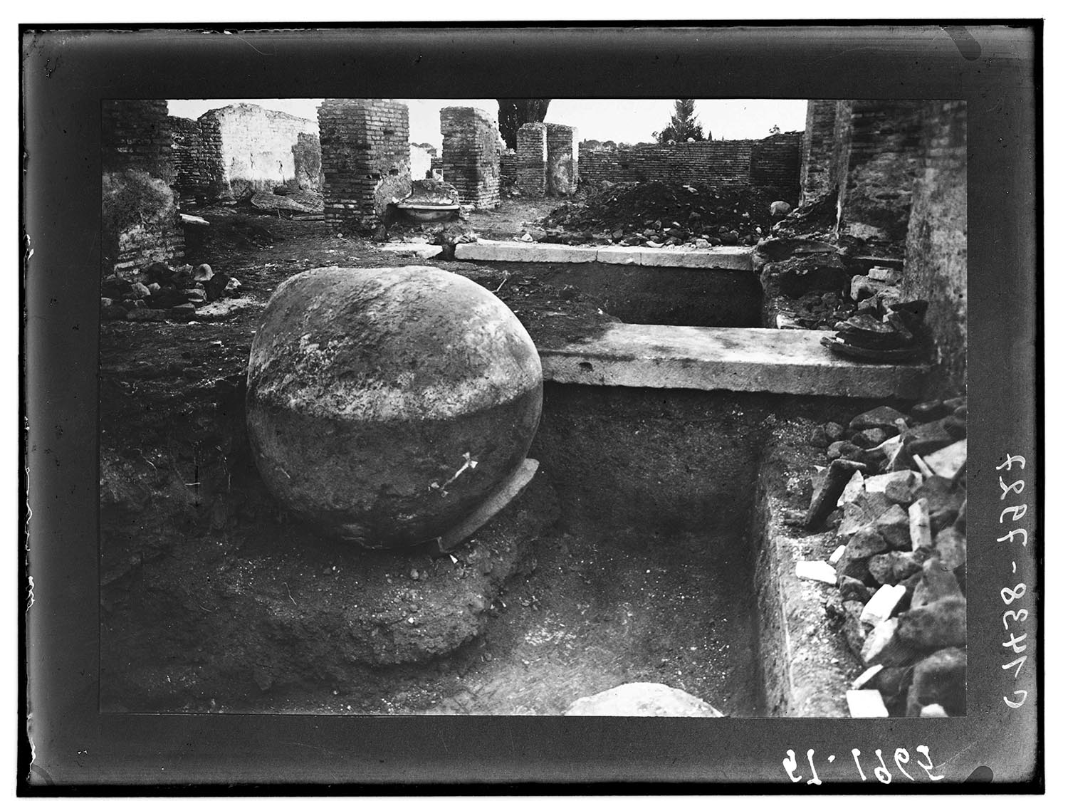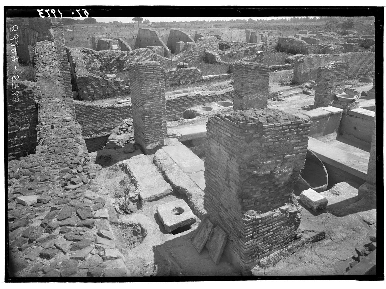The fullonica (fullery) was built in the early 2nd century AD by converting a house of an earlier period. It consisted of a huge room with a roof supported by pillars, hosting four large basins connected to one another and lined with cocciopesto, a coating that served to waterproof them. In the 3rd century AD, 35 circular recipients in terracotta were added, separated by low brick walls against which the workers leant as they pressed the textiles with their feet. The fabrics were washed with a variety of substances, including natural soda and urine, which contains ammonia, and were hung out to dry on slender beams, as suggested by the presence of cavities in the sides of the pillars.
