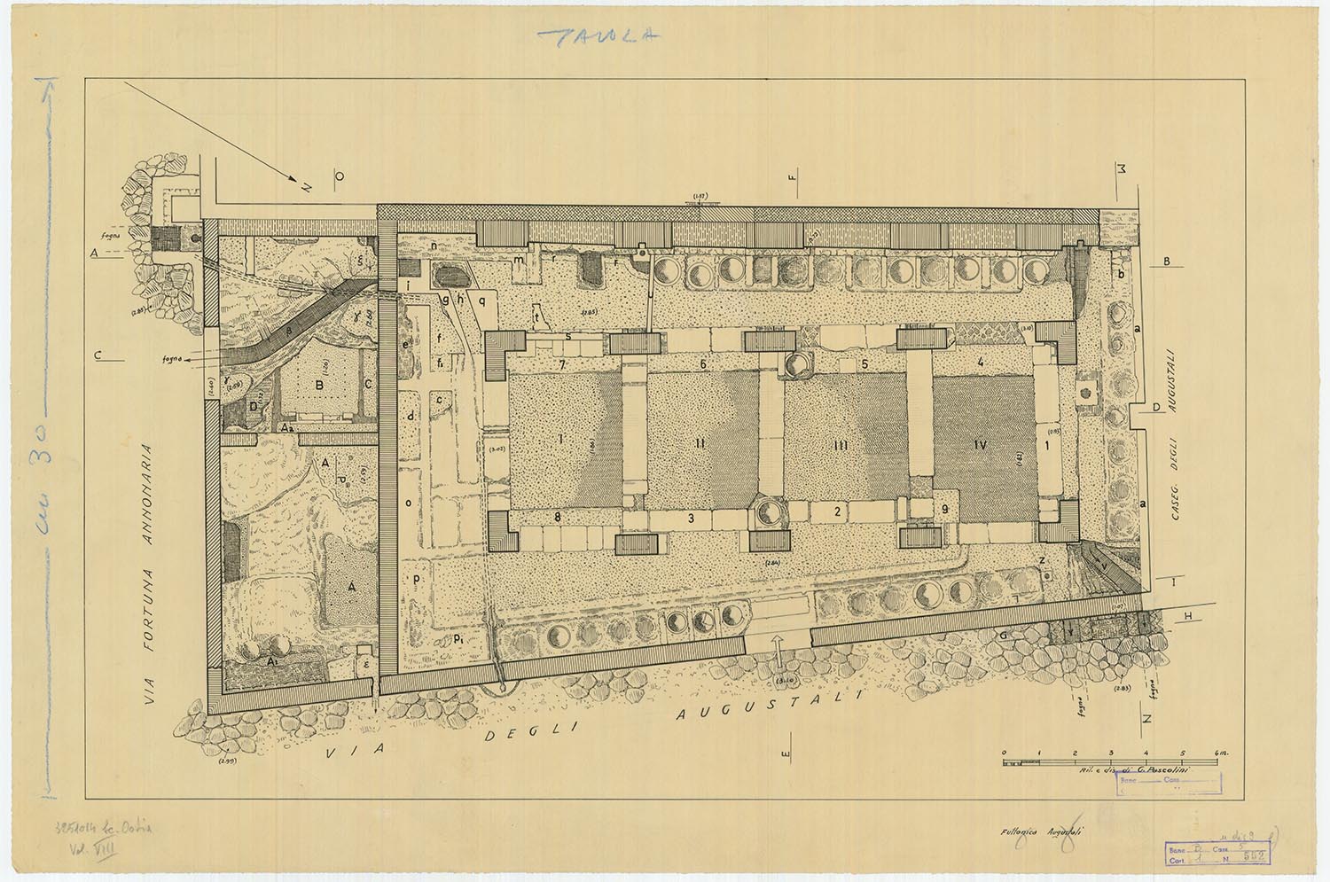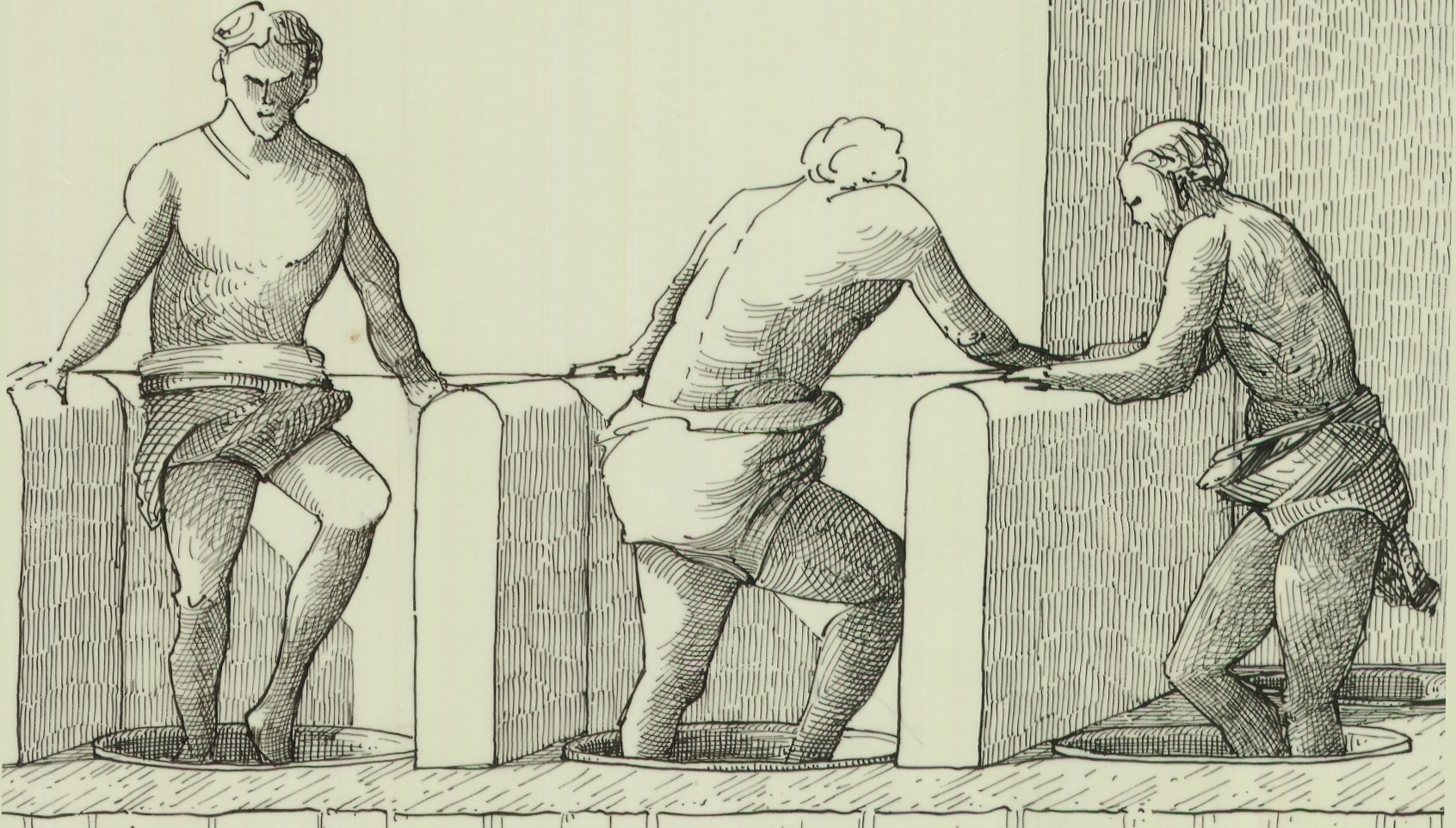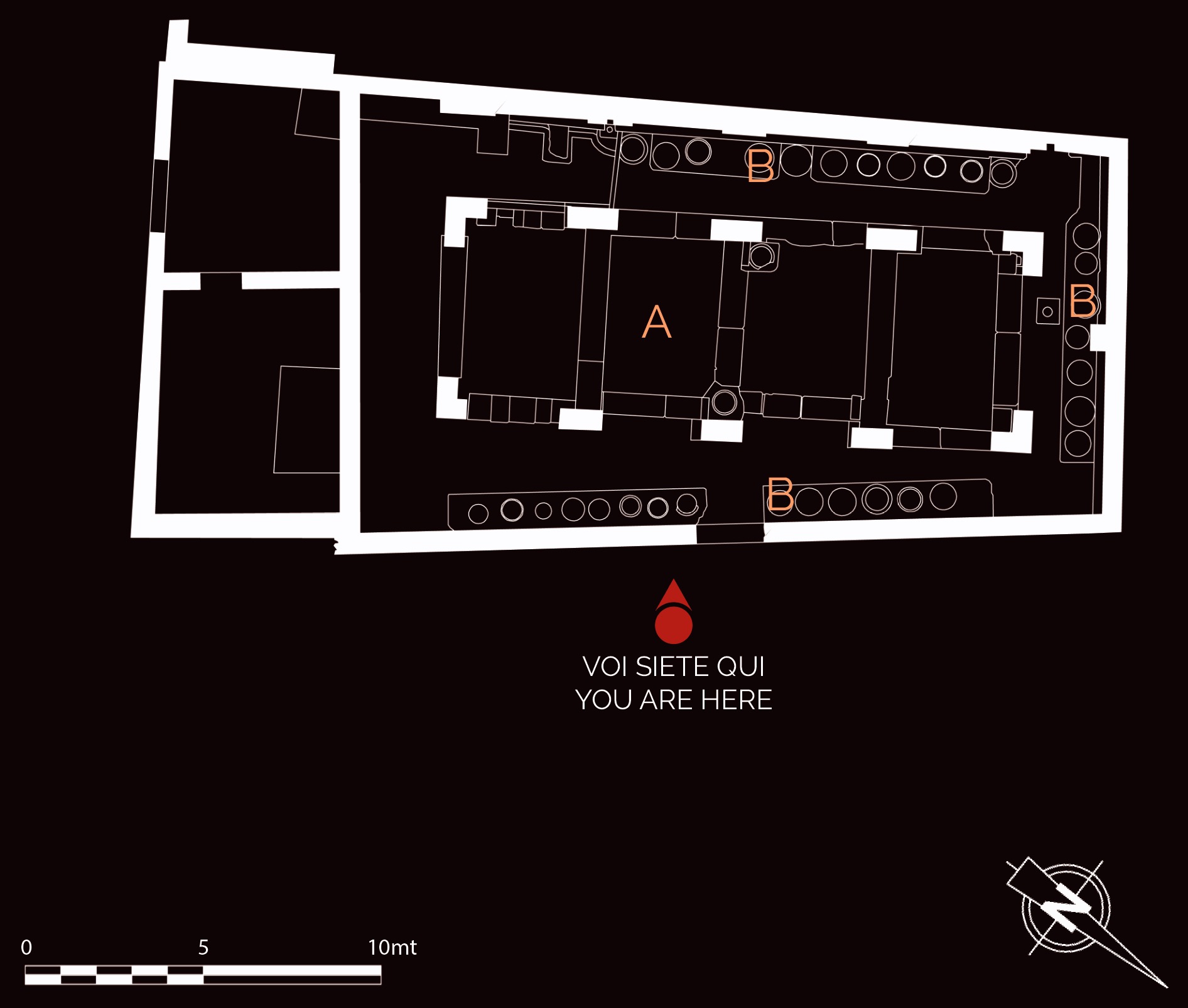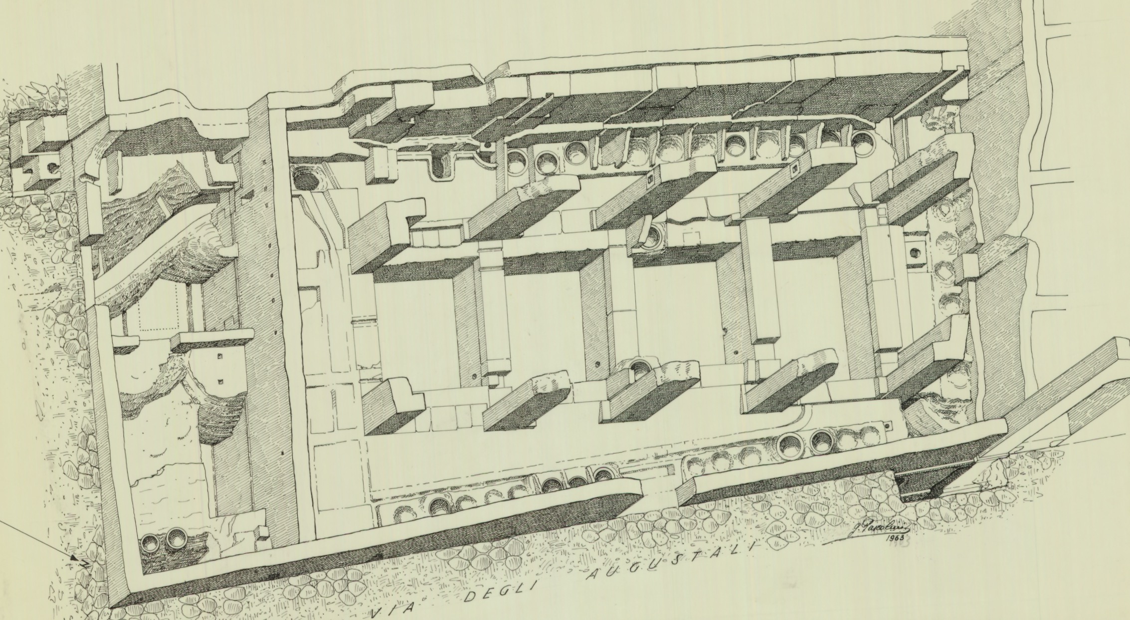 The fullonica (fullery) was built in the early 2nd century AD by converting a house of an earlier period. It consisted of a huge room with a roof supported by pillars, hosting four large basins connected to one another and lined with cocciopesto, a coating that served to waterproof them. In the 3rd century AD, 35 circular recipients in terracotta were added, separated by low brick walls against which the workers leant as they pressed the textiles with their feet. The fabrics were washed with a variety of substances, including natural soda and urine, which contains ammonia, and were hung out to dry on slender beams, as suggested by the presence of cavities in the sides of the pillars.