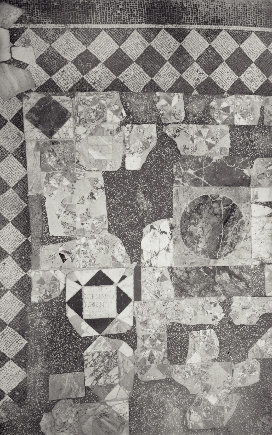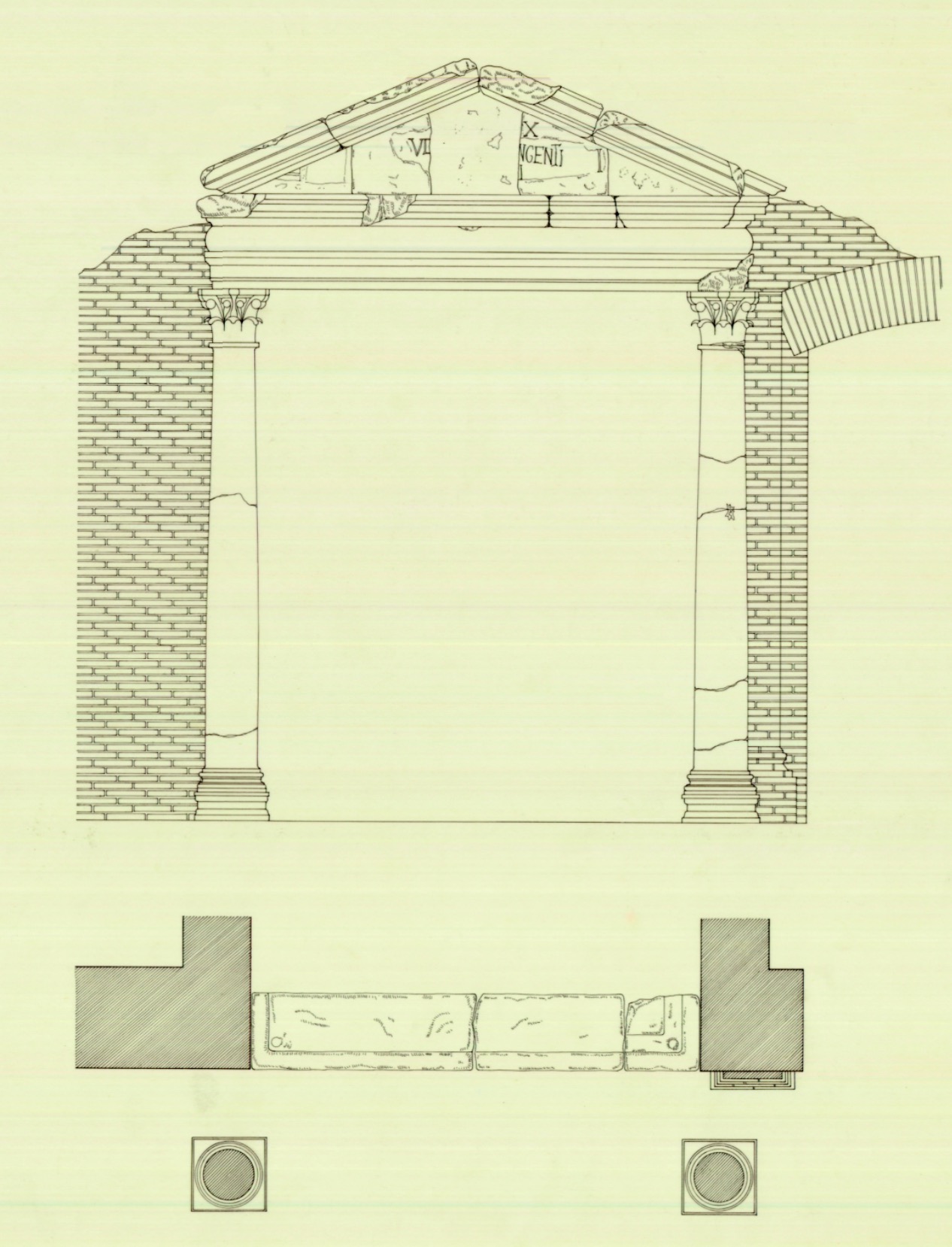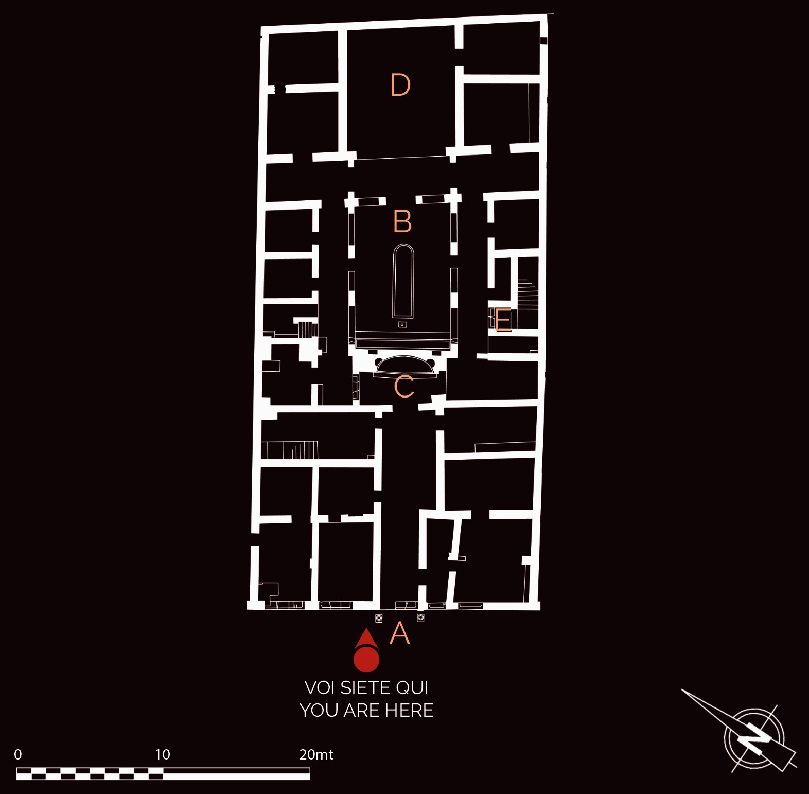 The luxurious aristocratic house was built in successive phases during the 3rd century AD. It was accessed through a monumental entrance (prothyrum) with marble columns and a pediment (A) on which the owner’s name was inscribed, erased in antiquity. It had a central courtyard (B), embellished with a nymphaeum (C) decorated on both sides, with a curved front and niches facing the vestibule and a façade with aedicules and marble pediments facing the main room (D). The latter had two columns at the entrance and was paved with marble slabs; a similar veneer, partly made of reused materials, was present in the more luxurious rooms of the house. A small underground room (E) with niches and a well could be reached from the courtyard and can perhaps be interpreted as a domestic sanctuary.