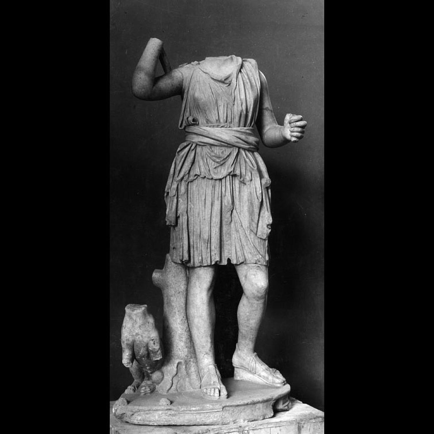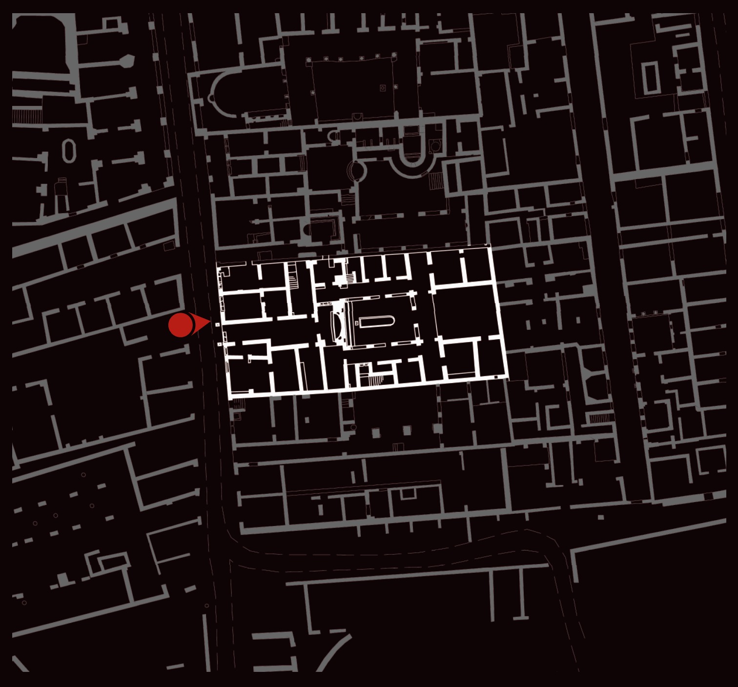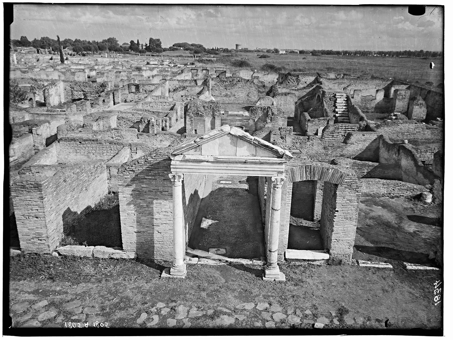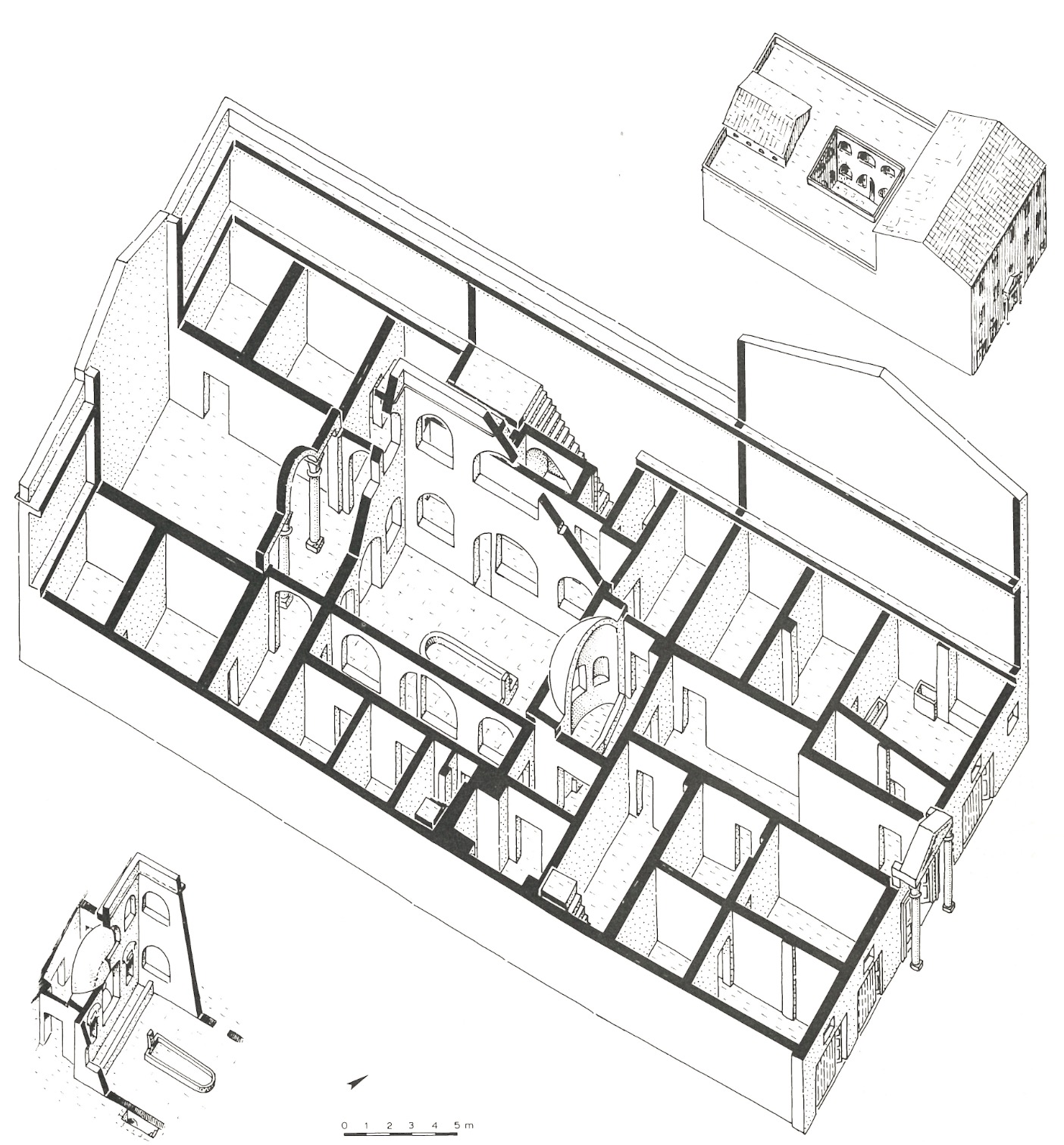 The luxurious aristocratic house was built in successive phases during the 3rd century AD. It was accessed through a monumental entrance (prothyrum) with marble columns and a pediment (A) on which the owner’s name was inscribed, erased in antiquity. It had a central courtyard (B), embellished with a nymphaeum (C) decorated on both sides, with a curved front and niches facing the vestibule and a façade with aedicules and marble pediments facing the main room (D). The latter had two columns at the entrance and was paved with marble slabs; a similar veneer, partly made of reused materials, was present in the more luxurious rooms of the house. A small underground room (E) with niches and a well could be reached from the courtyard and can perhaps be interpreted as a domestic sanctuary.