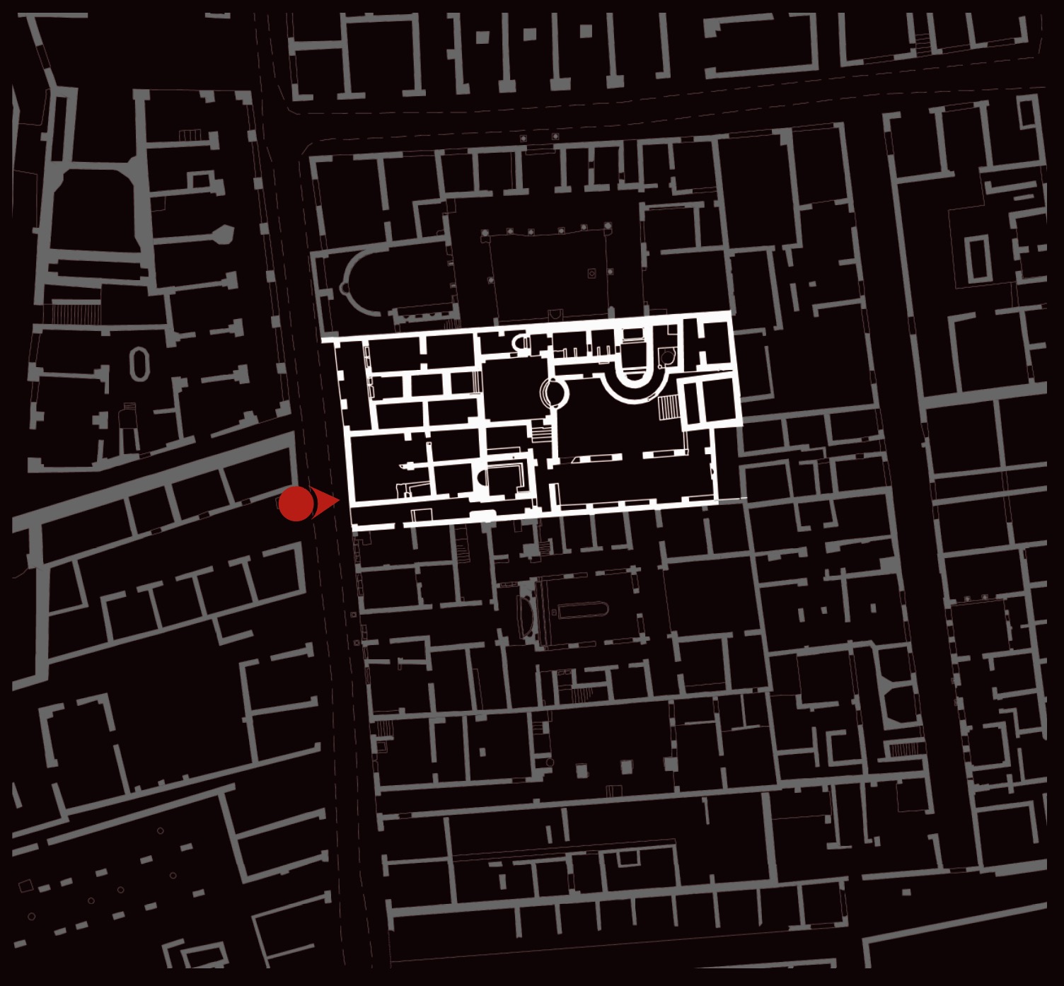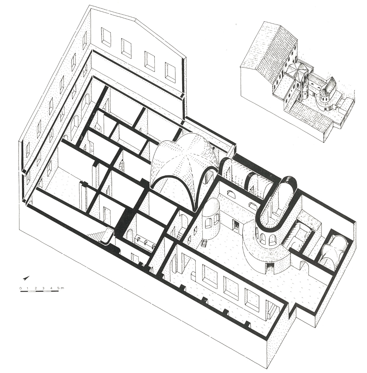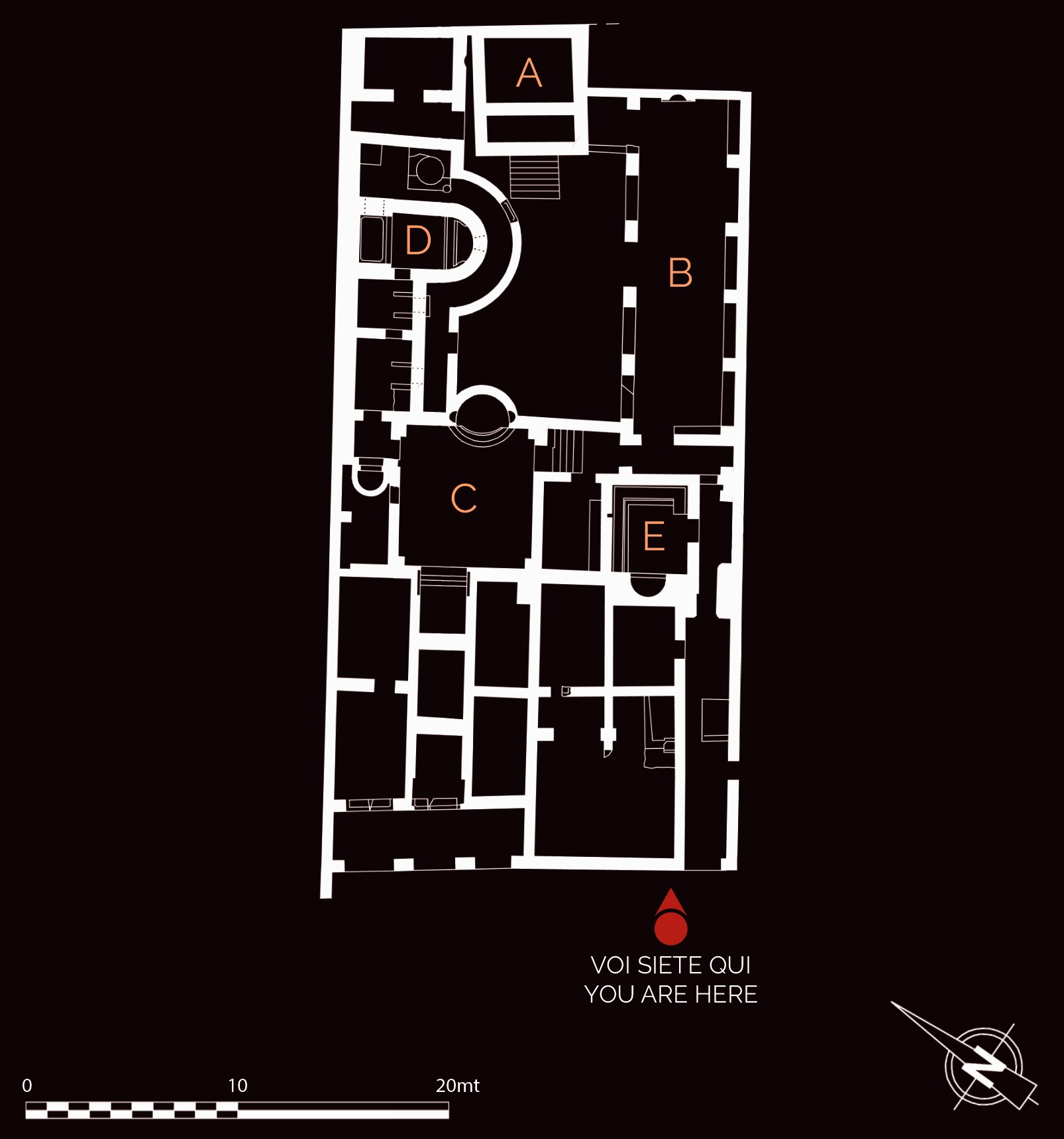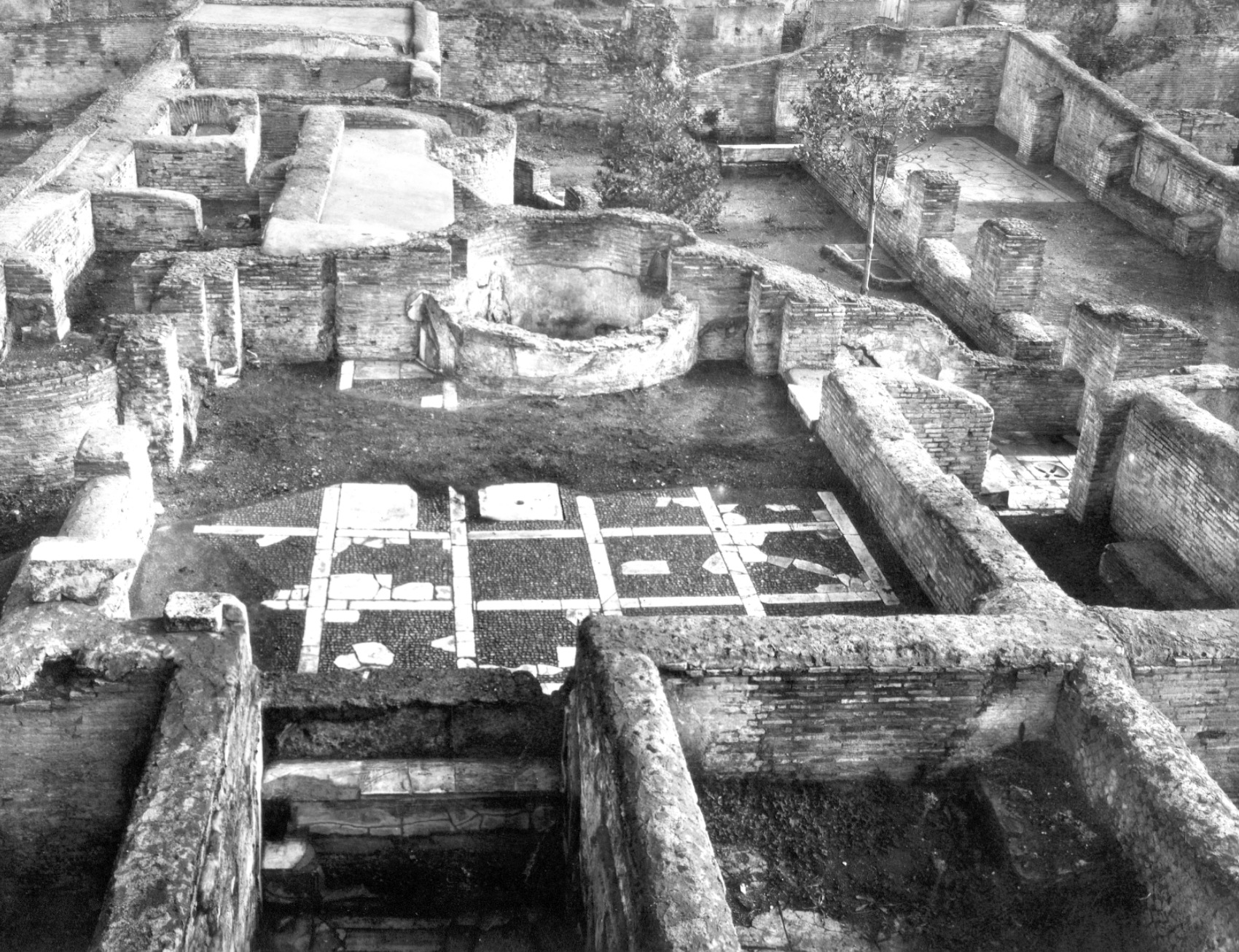 In the early 2nd century AD, the complex consisted of a series of shops with an open space behind them in which a small temple (A) dedicated to an unknown god was built in around AD 200. In the second half of the 3rd century AD, the building became the headquarters of a Neoplatonic philosophical college, as we know from the discovery inside of two portraits identified as the philosopher Plotinus (203/205-270 AD). The building had a meeting room (B) with benches and a niche at the back, and a small bath complex with a frigidarium (room for cold baths), paved with a mosaic made of large tesserae in green marble (C). The heated rooms, also marble-panelled, were located in the north sector of the building (D).