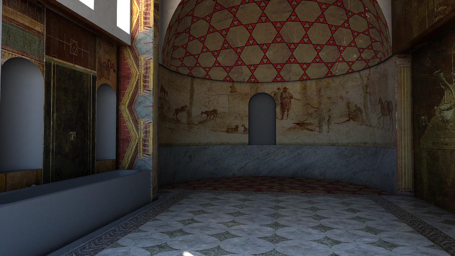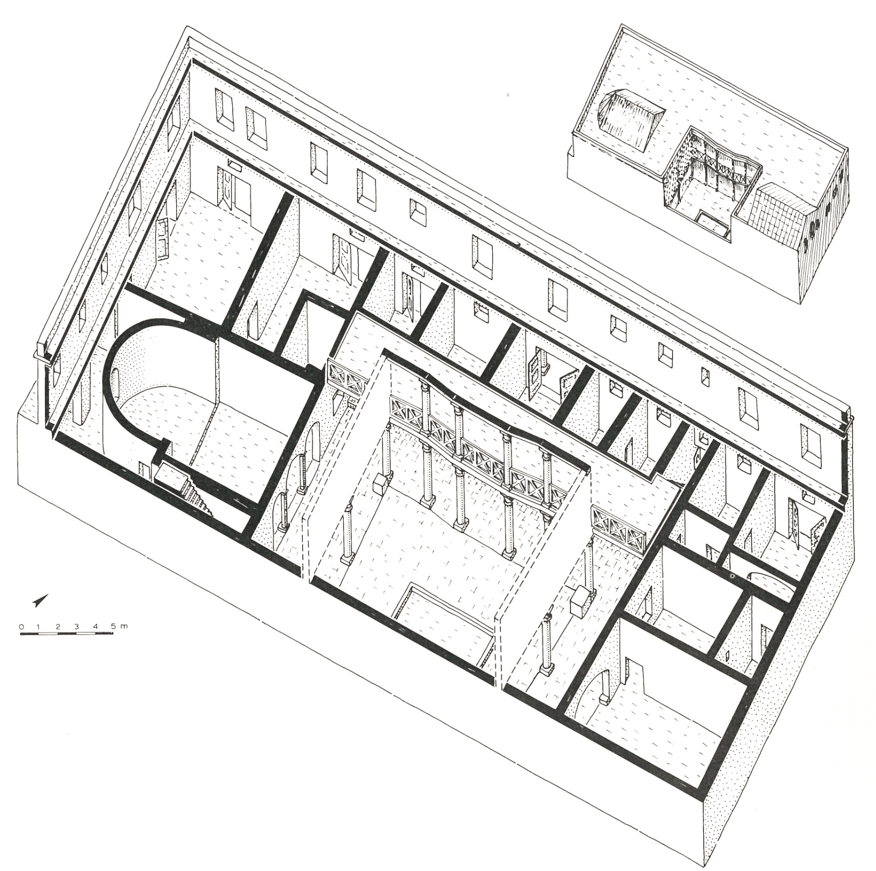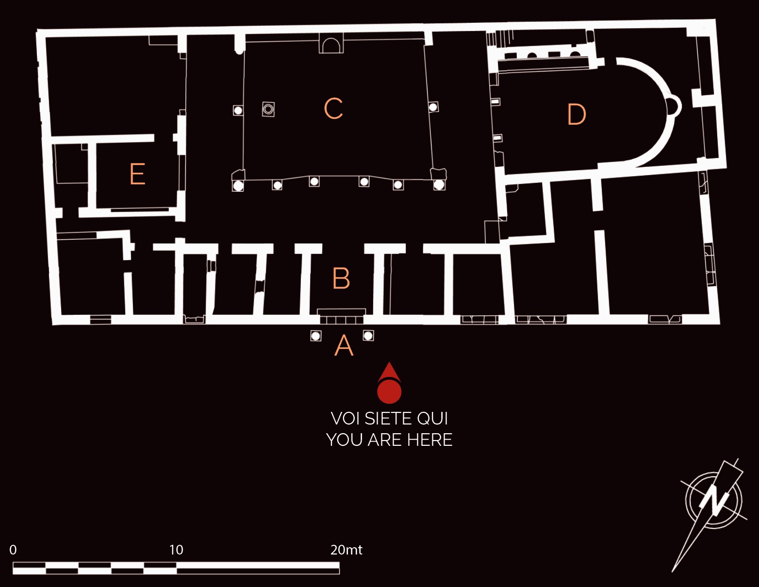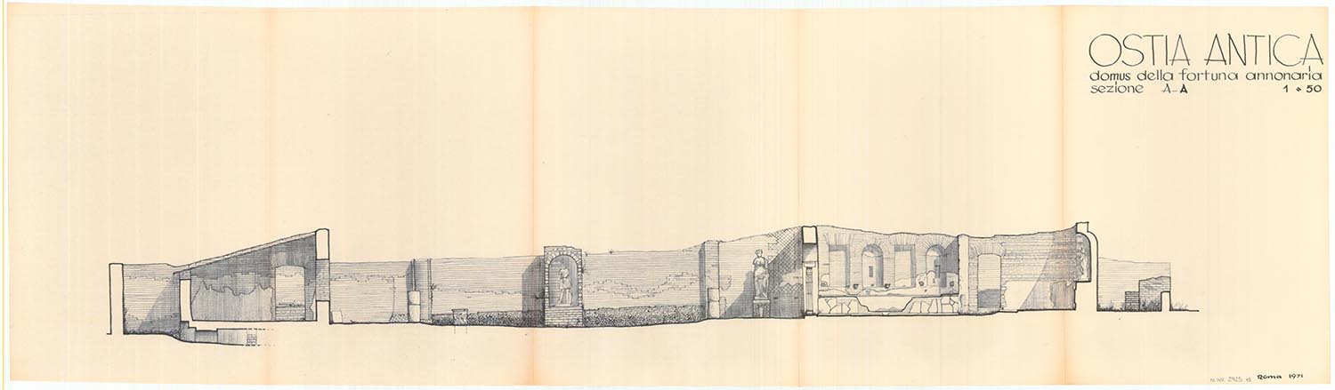 The aristocratic domusth (house), whose current appearance dates to the 4 century AD, was installed inside a house of the mid-2nd century AD of which it preserved the peristyle in the central courtyard. The entrance was monumentalized with a prothyrum (colonnaded entrance) (A) that led into a vestibule (B). This in turn gave access to the large courtyard (C), against the back wall of which is a cast of the statue of a goddess identified as Fortuna Annonaria (the goddess of food supplies) or as a personification of Ostia. The main room (D) was adorned with marbles, a fountain and probably statues; the apse must have hosted the stibadium, the semi-circular triclinium couch on which meals were eaten. A private room of the house (E) was converted into a heated room and paved with a mosaic depicting mythological scenes.