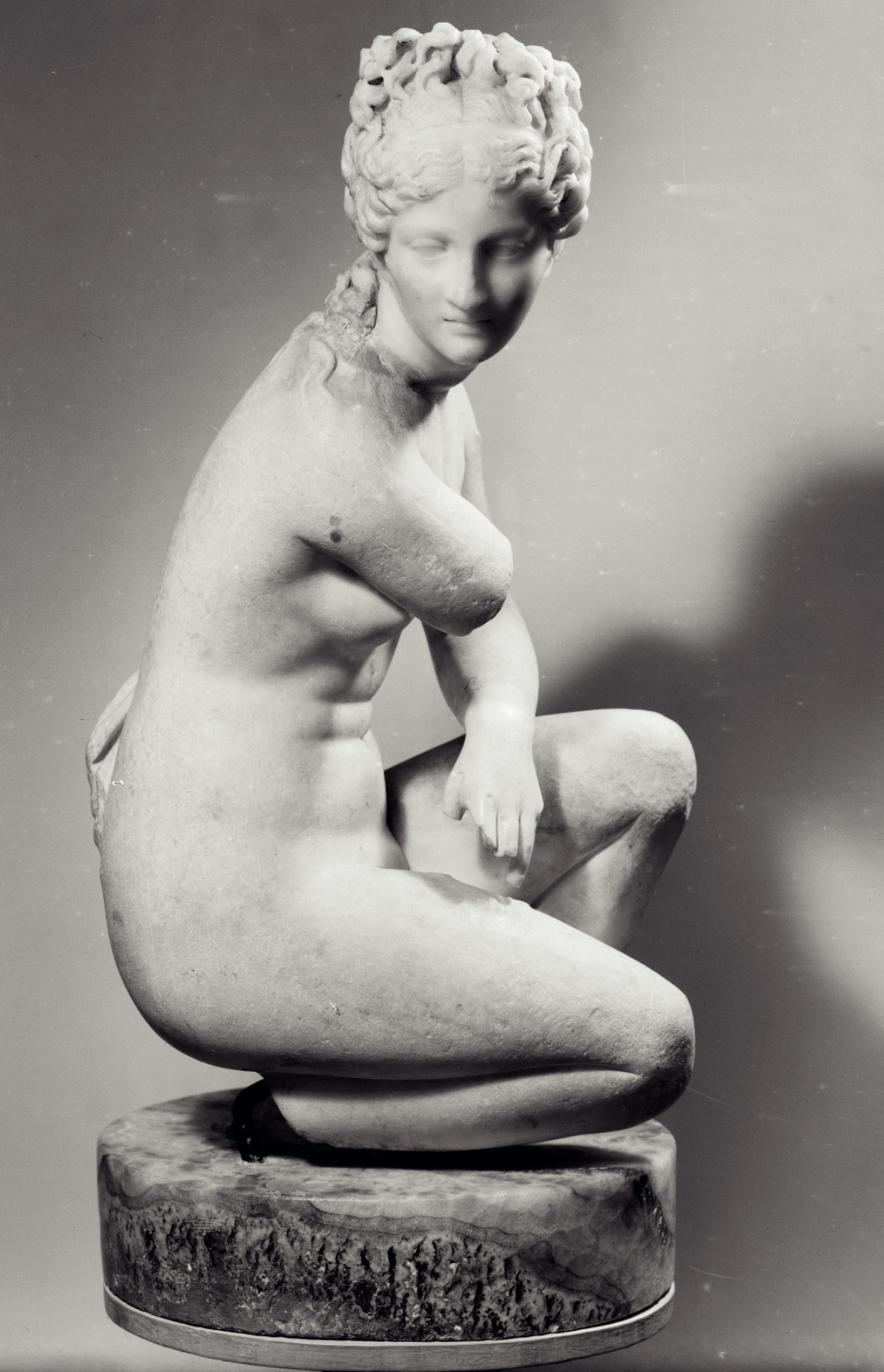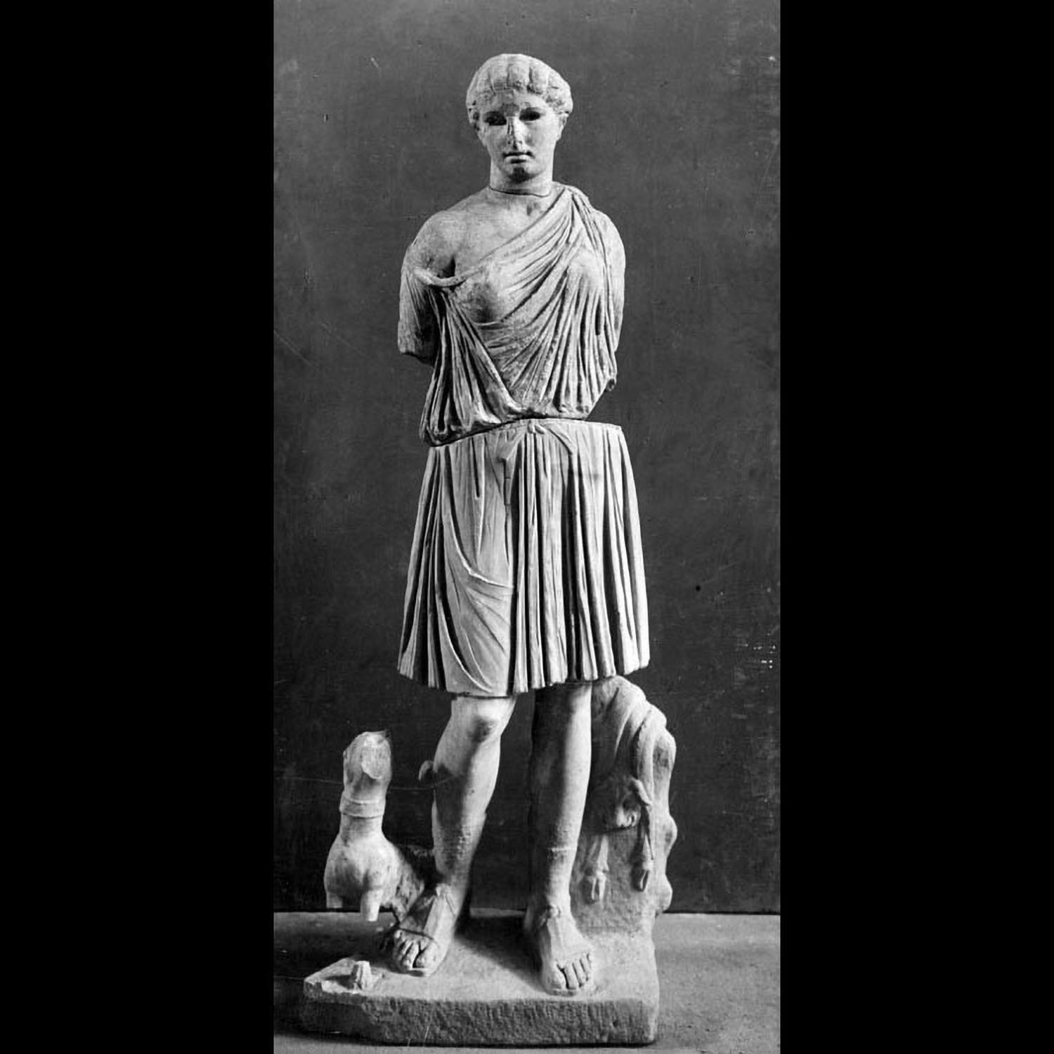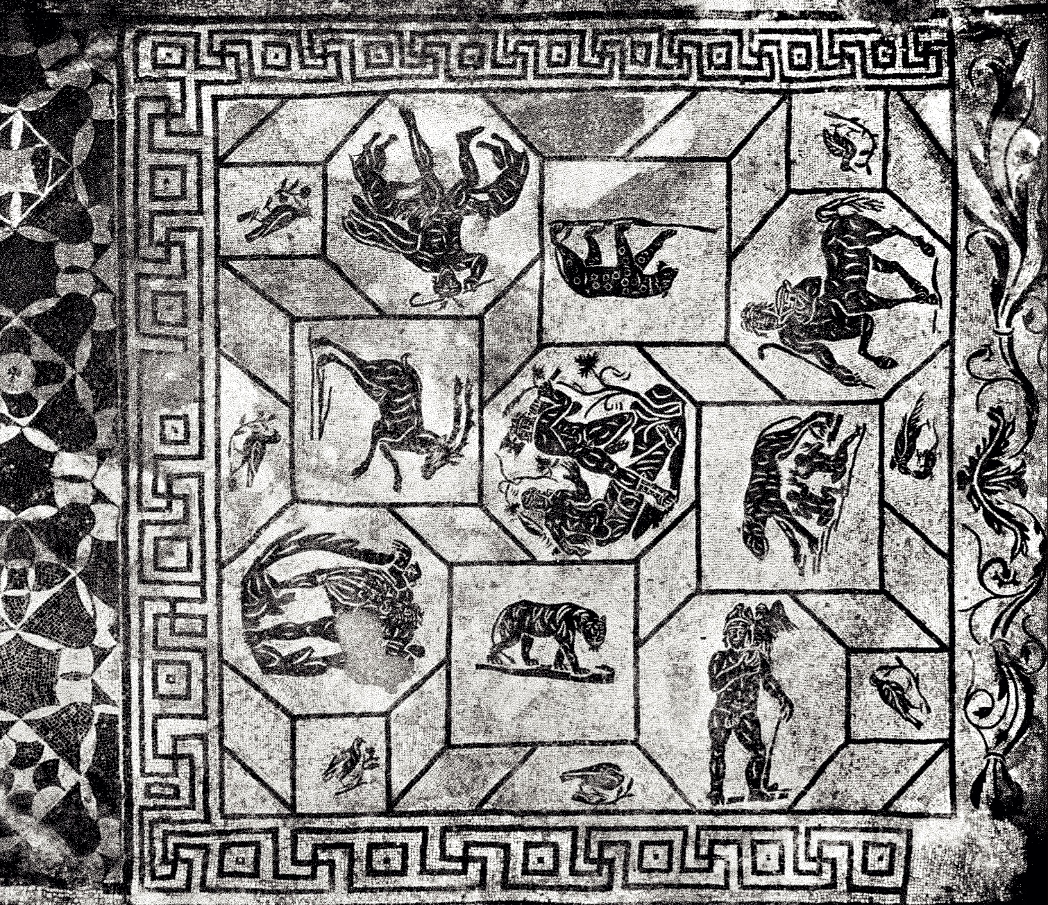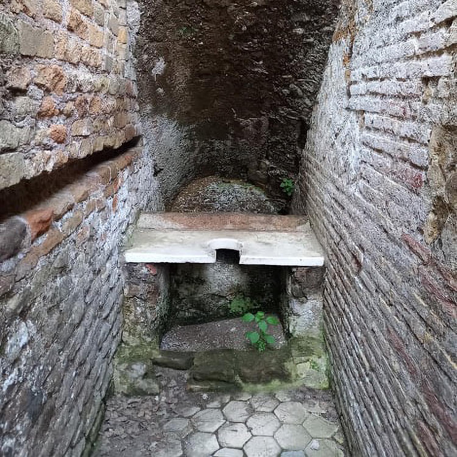 The aristocratic domusth (house), whose current appearance dates to the 4 century AD, was installed inside a house of the mid-2nd century AD of which it preserved the peristyle in the central courtyard. The entrance was monumentalized with a prothyrum (colonnaded entrance) (A) that led into a vestibule (B). This in turn gave access to the large courtyard (C), against the back wall of which is a cast of the statue of a goddess identified as Fortuna Annonaria (the goddess of food supplies) or as a personification of Ostia. The main room (D) was adorned with marbles, a fountain and probably statues; the apse must have hosted the stibadium, the semi-circular triclinium couch on which meals were eaten. A private room of the house (E) was converted into a heated room and paved with a mosaic depicting mythological scenes.