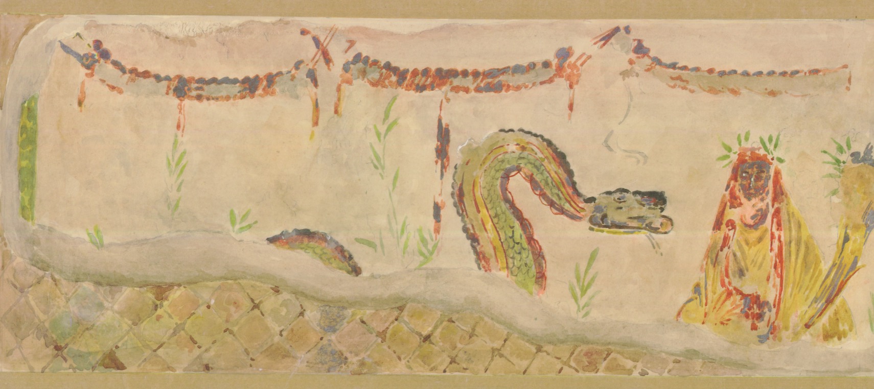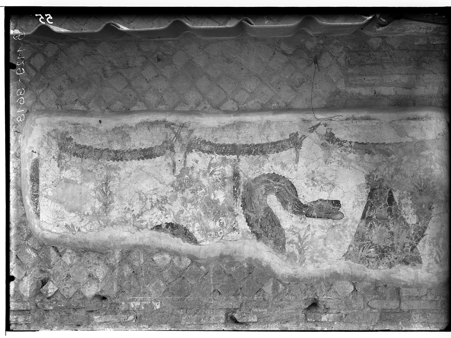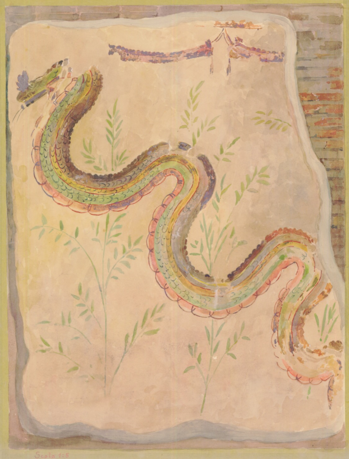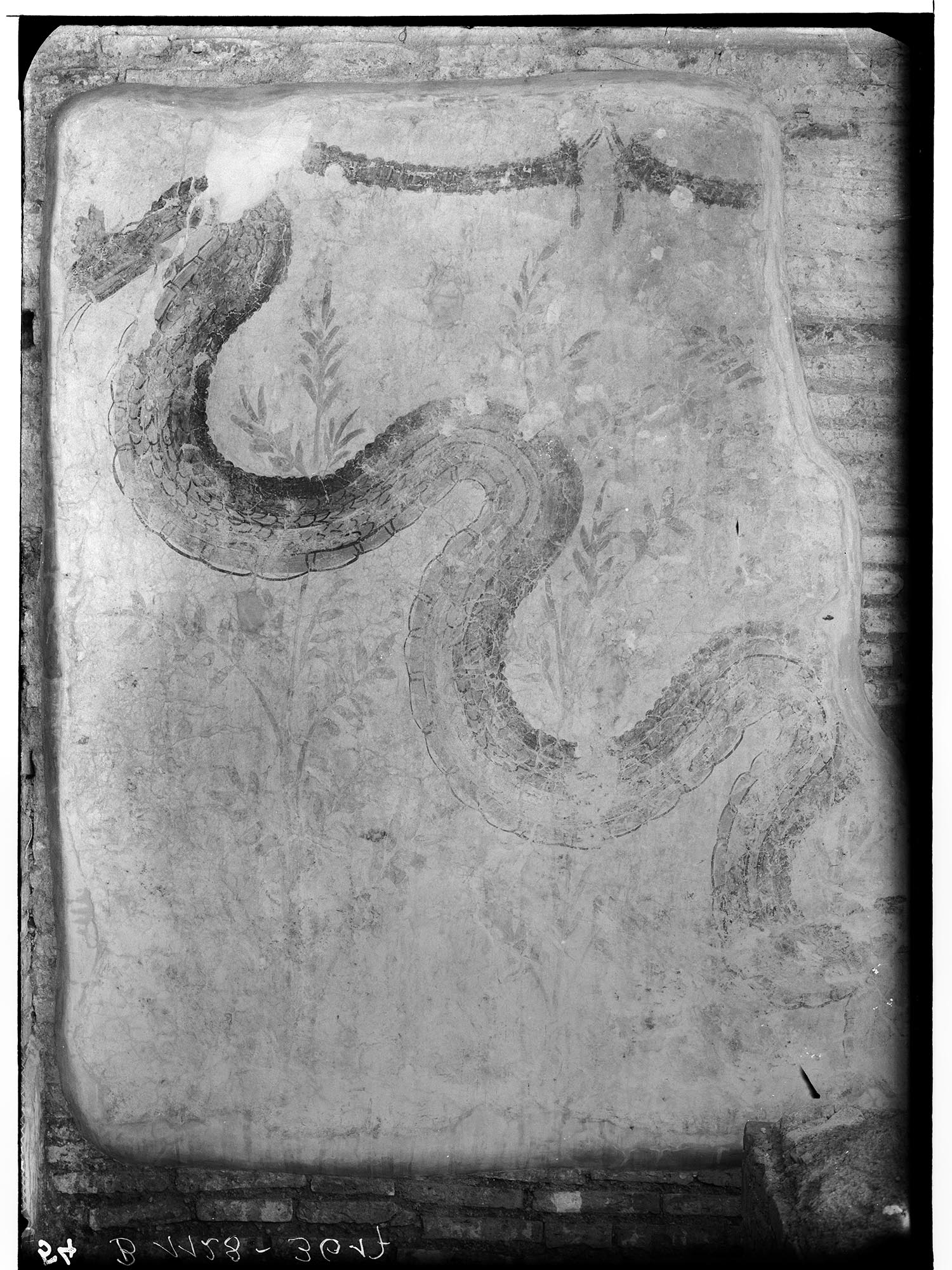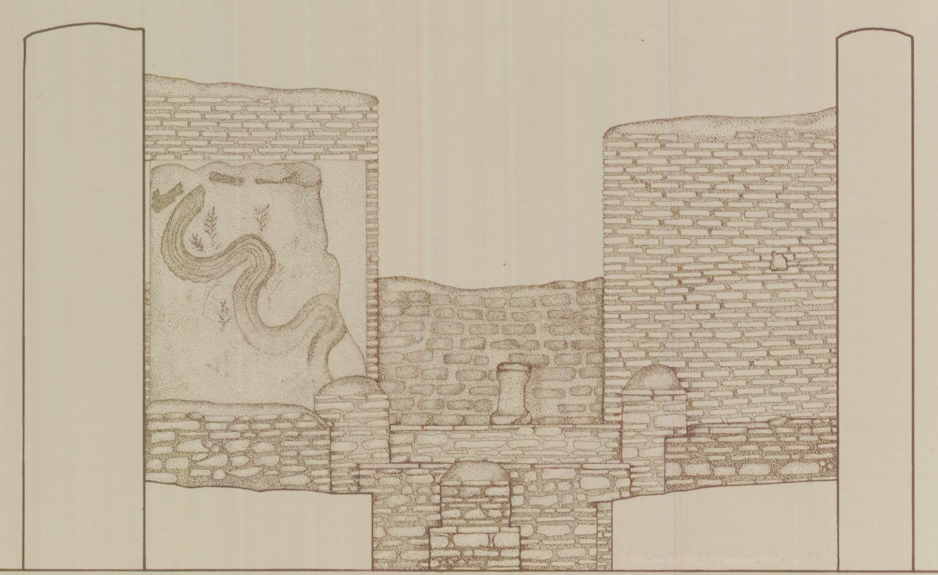 The cult place dedicated to the eastern god Mithras was installed in the second half of the 3rd century AD inside an earlier complex with shops. One of the back rooms of a shop was transformed into a cult space where the podia (side benches) and a small altar were made from reused building materials. The mithraeum retained the painted decorations of the preceding phase (2nd century AD), probably belonging to a lararium (shrine of the household gods), depicting two snakes, a male identified by a crest and a female, on either side of a Genius with a veiled head and a cornucopia in his hand to symbolize abundance. Since they were connected to the earth, snakes also played an important role in Mithraic religion.