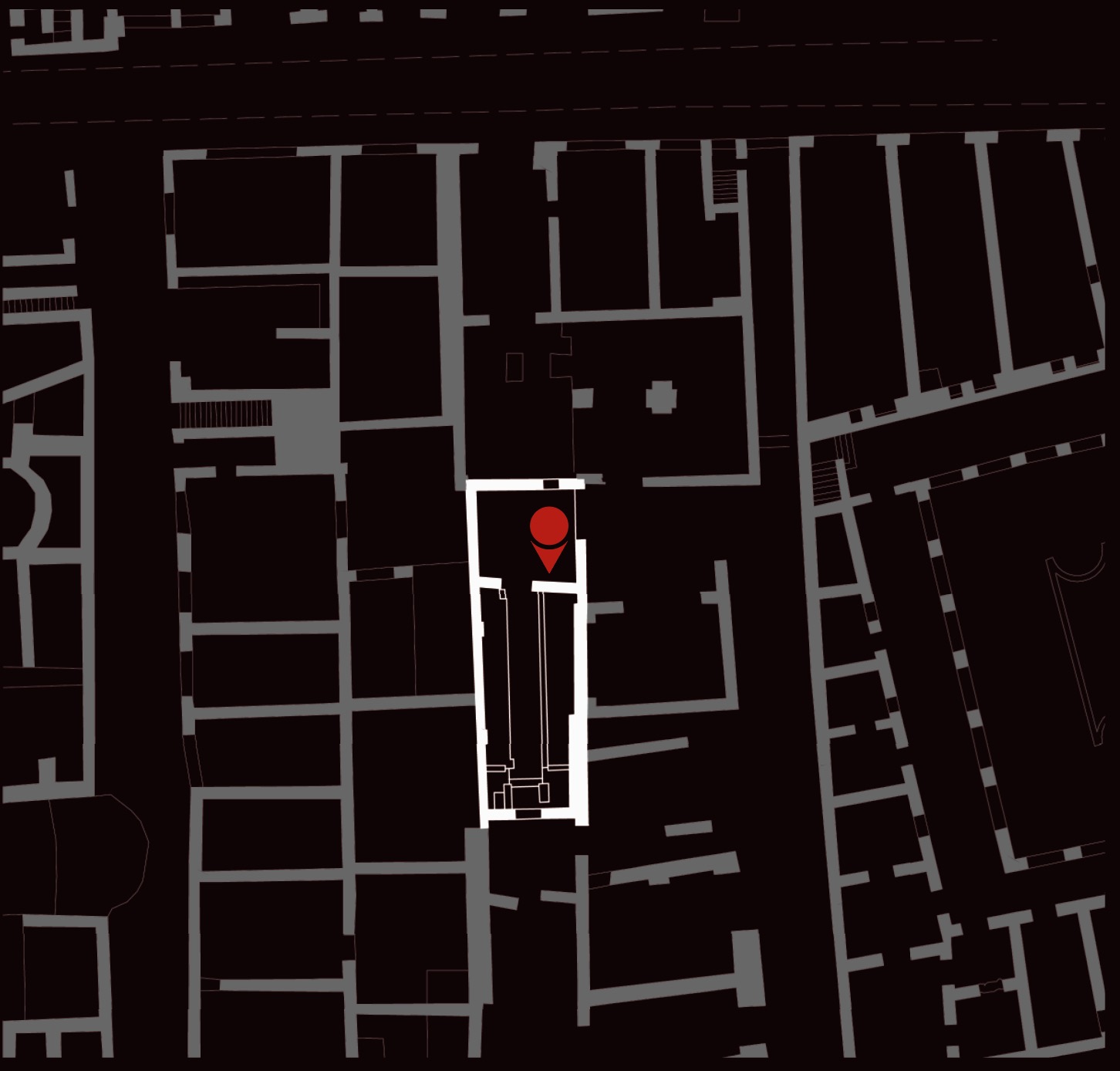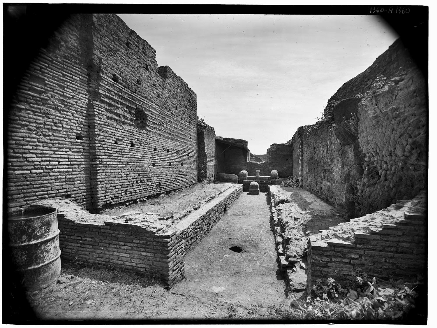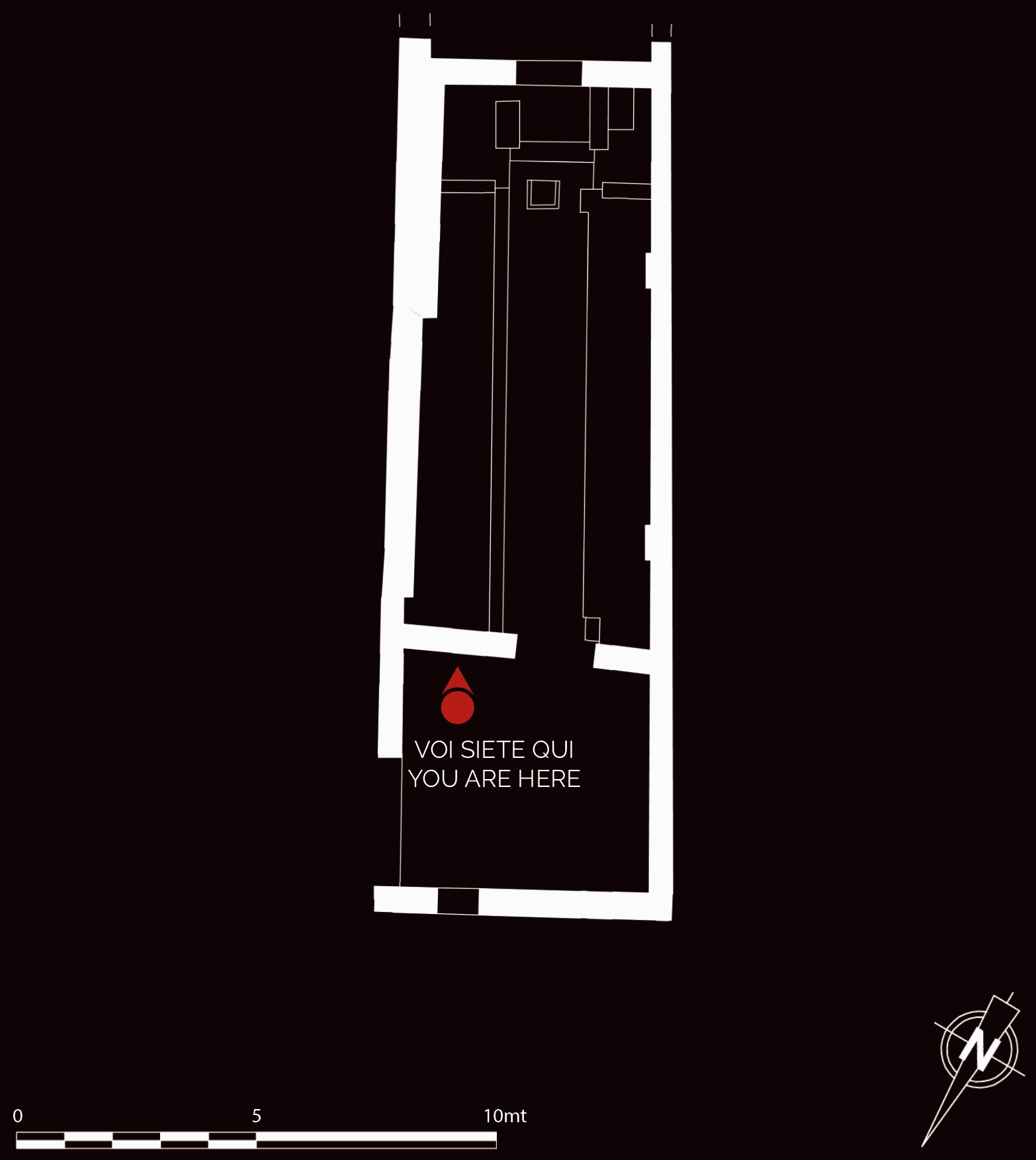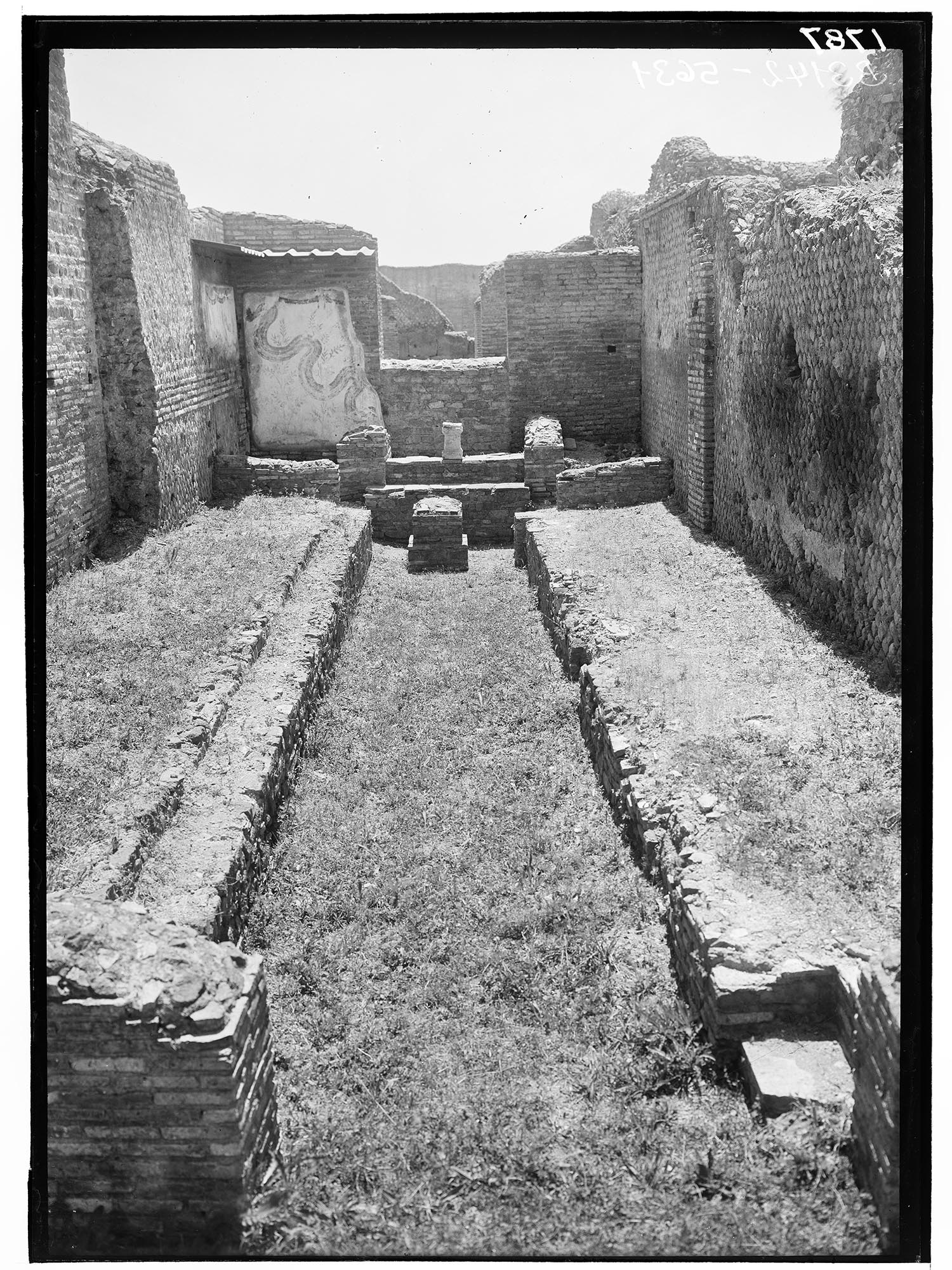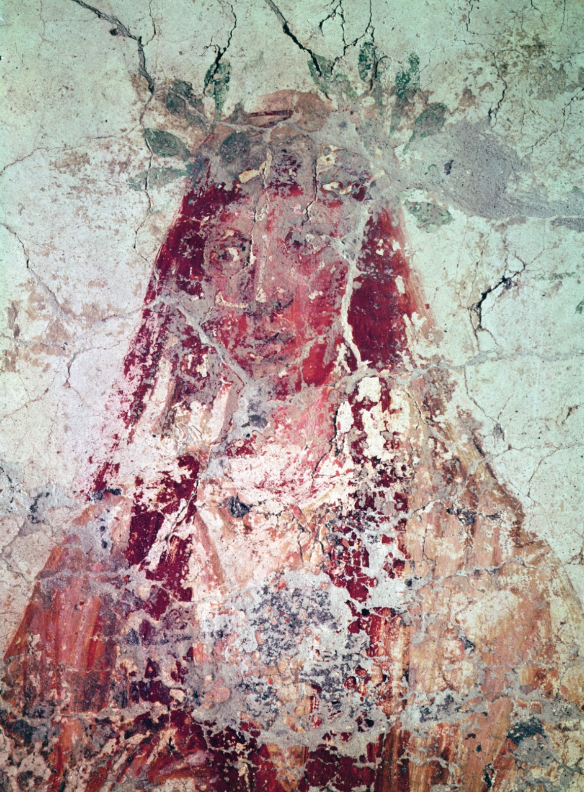The cult place dedicated to the eastern god Mithras was installed in the second half of the 3rd century AD inside an earlier complex with shops. One of the back rooms of a shop was transformed into a cult space where the podia (side benches) and a small altar were made from reused building materials. The mithraeum retained the painted decorations of the preceding phase (2nd century AD), probably belonging to a lararium (shrine of the household gods), depicting two snakes, a male identified by a crest and a female, on either side of a Genius with a veiled head and a cornucopia in his hand to symbolize abundance. Since they were connected to the earth, snakes also played an important role in Mithraic religion.