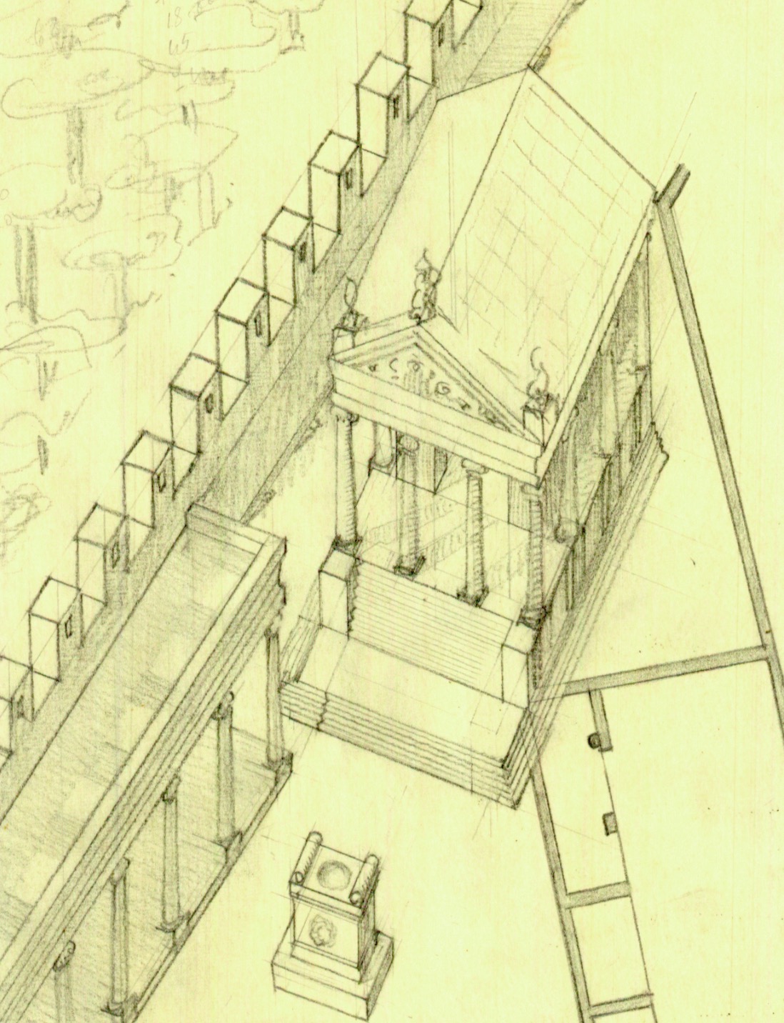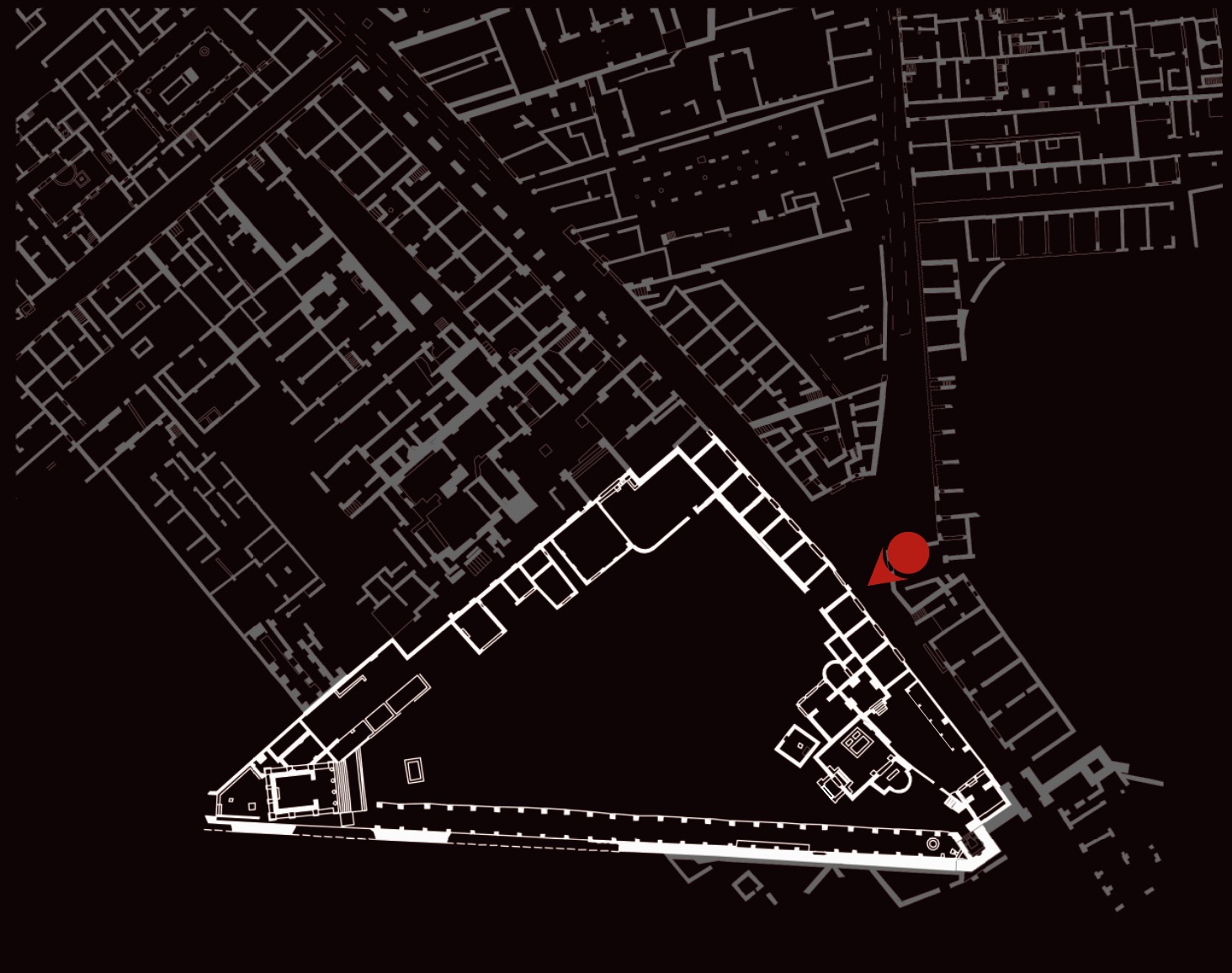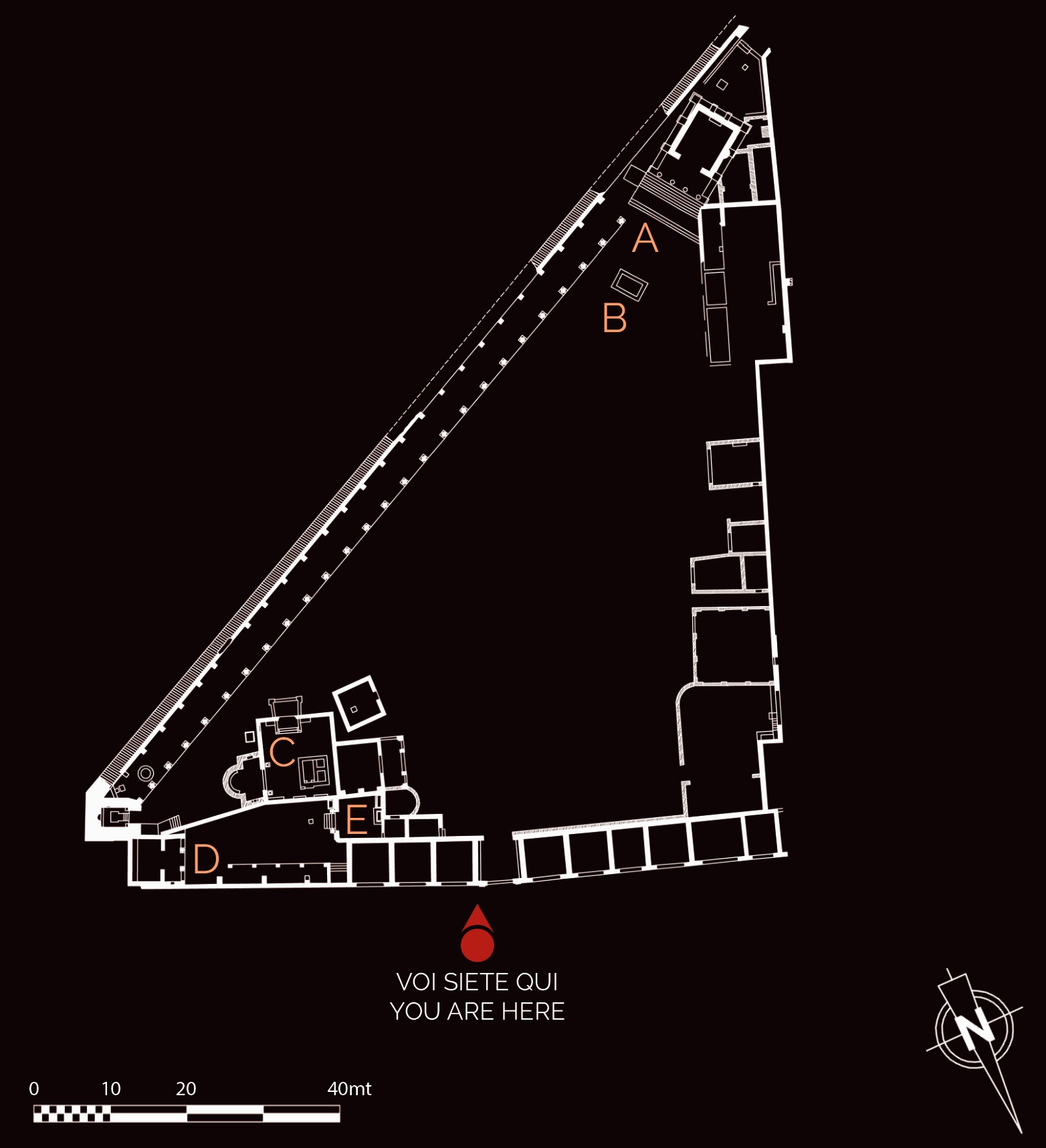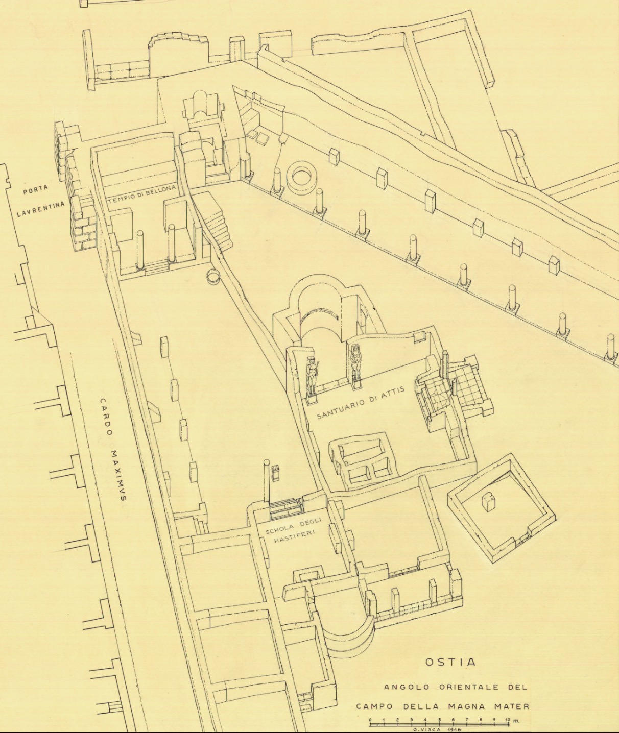 The vast triangular open space is located in the corner between the Cardo Maximus and the walls in an outlying area of the city where eastern cults were practiced. It hosted numerous cult buildings: the temple of Cybele or Magna Mater (a fertility goddess) (A), the shrine of Attis (a mythical shepherd and lover of Cybele) (C), the temple of Bellona (the Italic goddess of war) (D) and the headquarters of the Hastiferi or lance-bearers (E), who performed religious dances during the ceremonies. The cult of Cybele was introduced to Ostia in the 1st century AD, but the sanctuary itself dates to the 2nd century AD. The initiation rituals took place in the open space of the sanctuary; they involved killing a bull and sprinkling the animal’s blood over the worshippers (taurobolia).