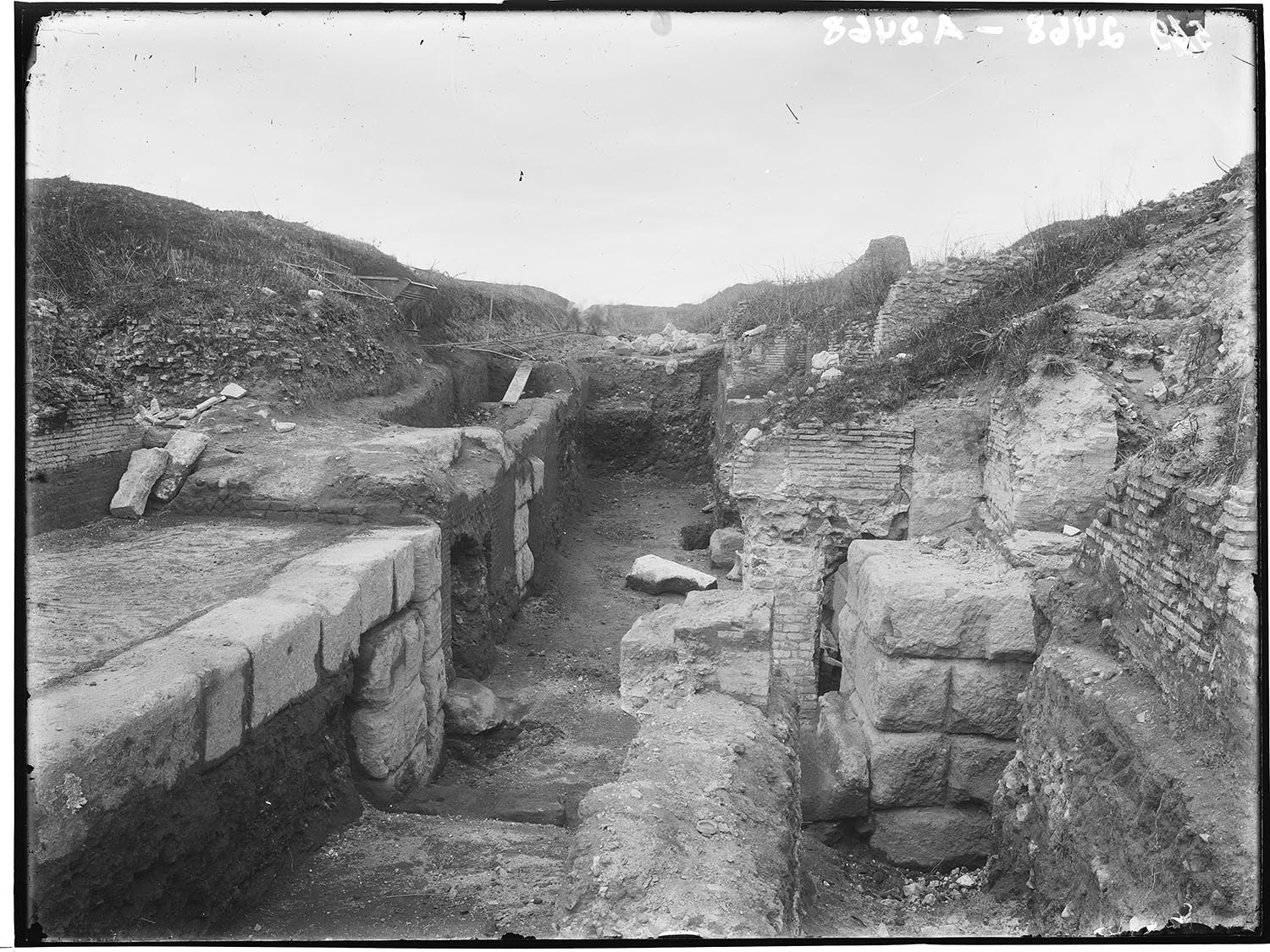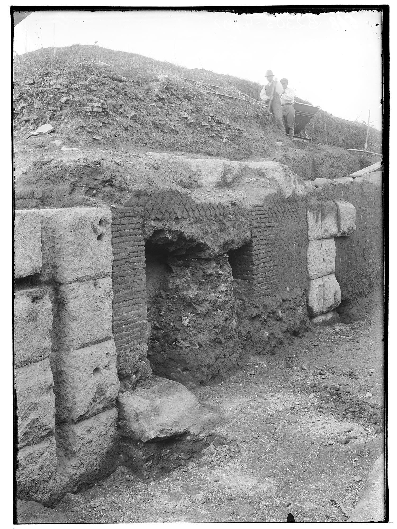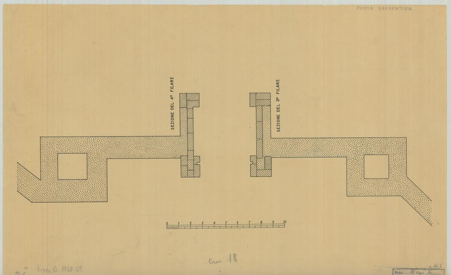 The gate in the Republican walls, built in around the mid-1st century BC, marks the entrance into the city from the Via Laurentina, an ancient road leading from Laurentum (a town in Lazio south of Rome); the stretch of road inside the city was Ostia’s Cardo Maximus. The gate’s modern designation seems to be derived from the name Laurentia, known from Christian sources. The gate, consisting of a single room, was flanked by two square towers and had a facing of tufa blocks. On the south side the sockets for the wooden door can still be seen. In the Imperial period the western tower, having lost its original function, was used for the taurobolia (ritual bull sacrifices) that took place in the nearby sanctuary of the Magna Mater.