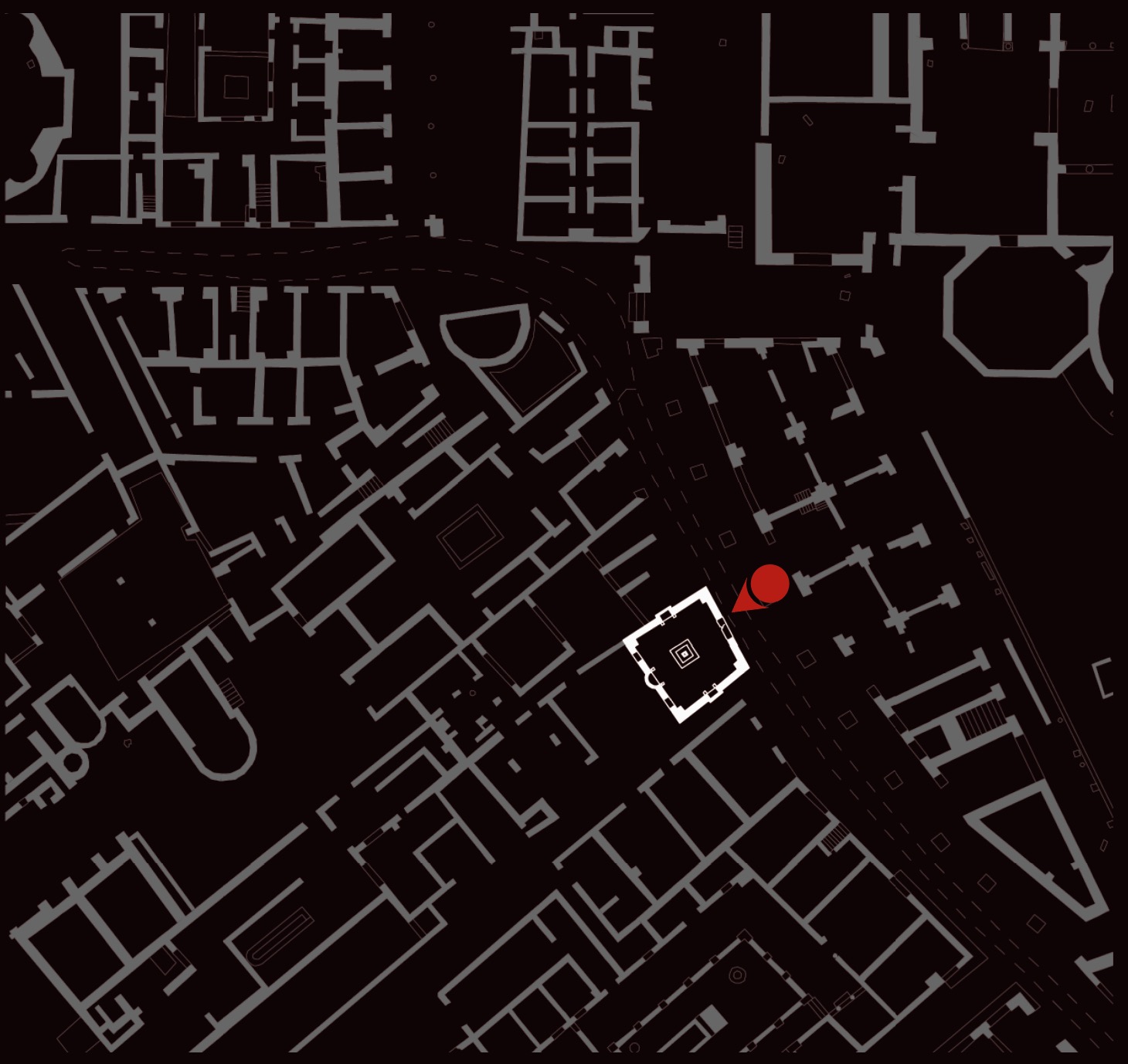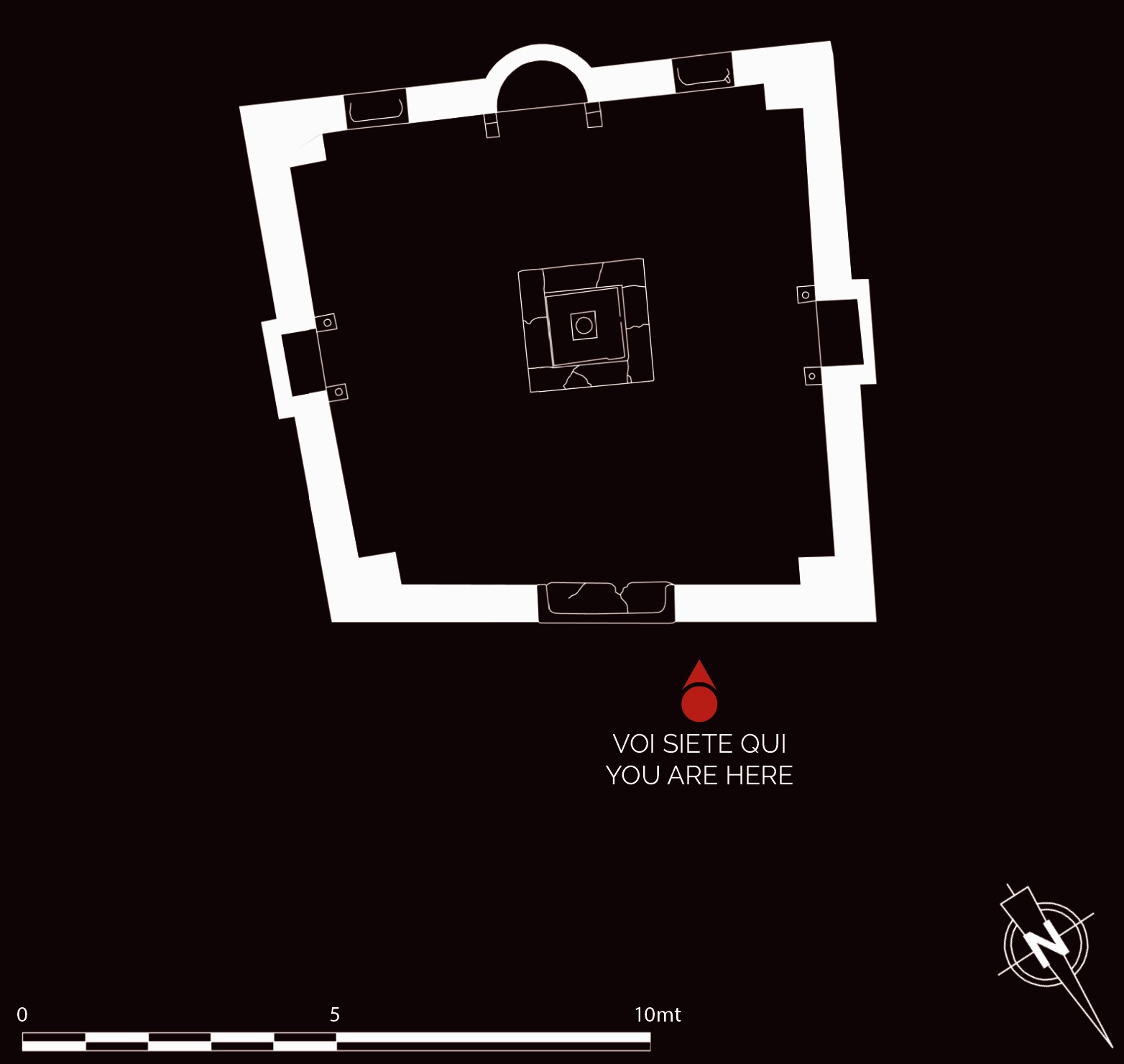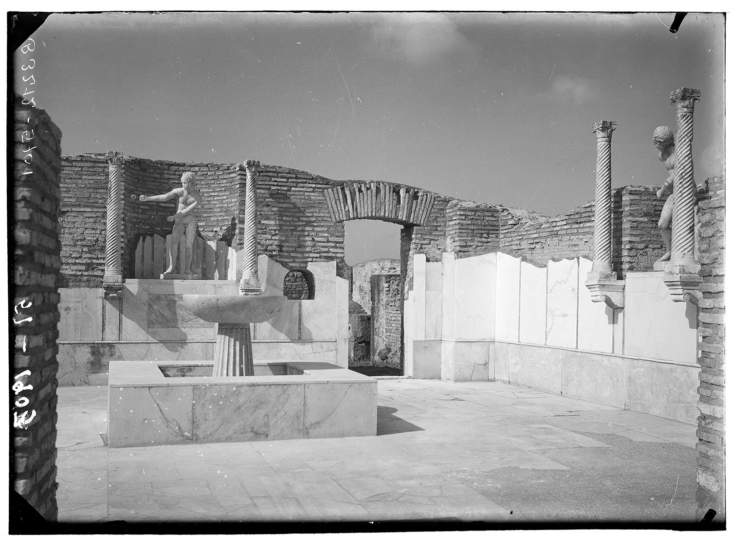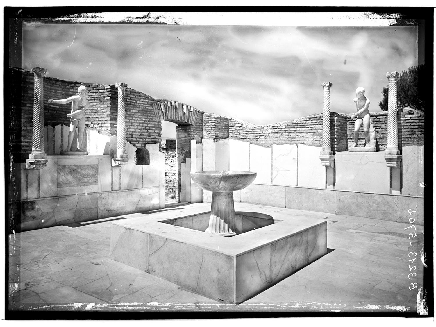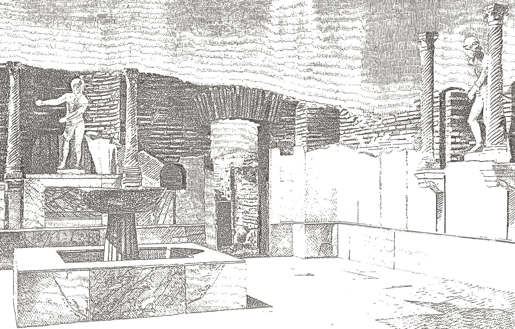 The monumental nymphaeum, built in the 4th century AD, takes the form of a single square room, closed and completely covered in marble panels, which provided a backdrop for the jets of water that gushed from a labrum (basin) set inside a central square pool. The side walls of the nymphaeum had two rectangular niches, each with a marble statue placed inside it. These were Roman copies of a type attributed to the Greek sculptor Lysippus depicting Eros stringing his bow and are now in the Museo Ostiense. In the back wall was a semi-circular niche, perhaps adorned with a statue of Venus.