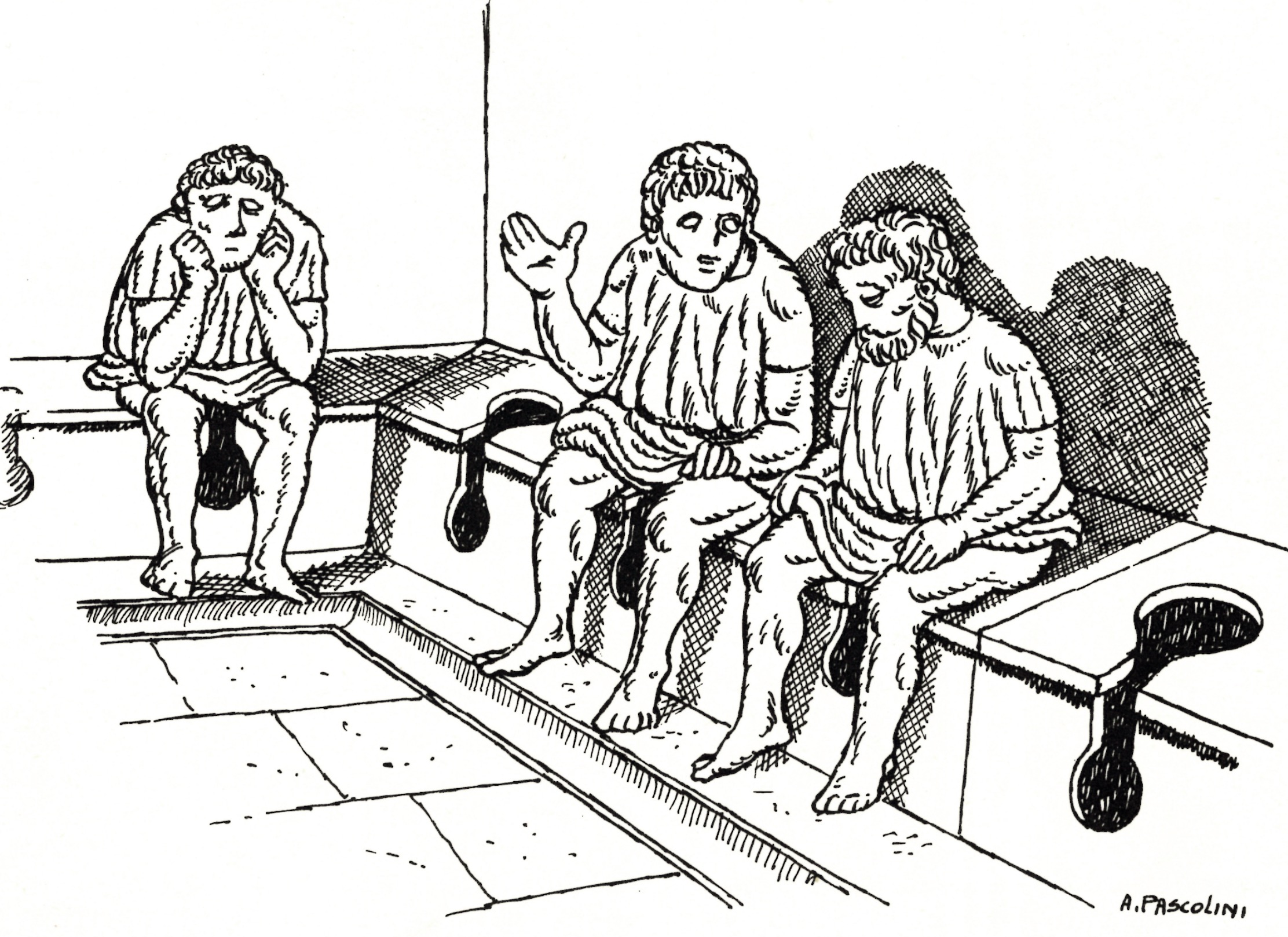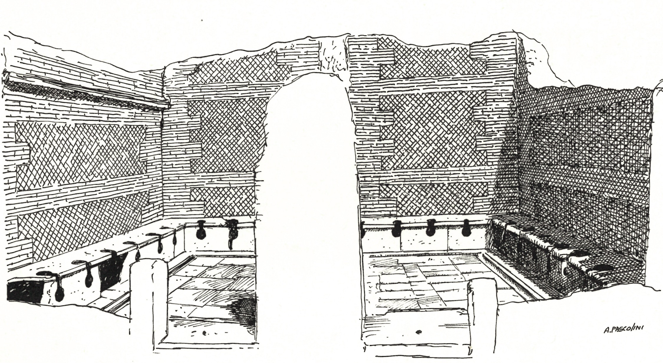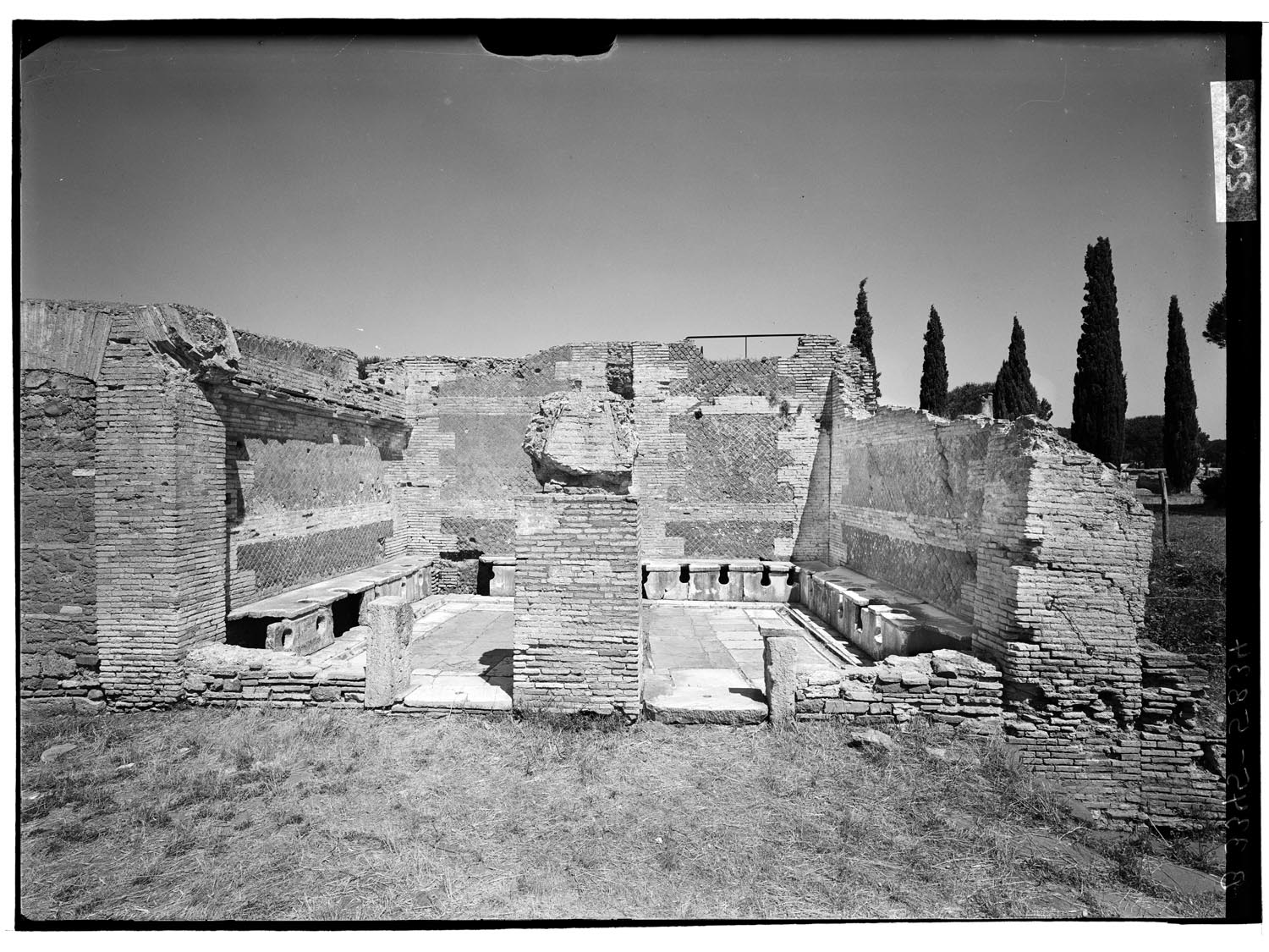 The latrine, one of the best preserved in Ostia, was built inside two shops of the Hadrianic period (AD 117-138). Its current appearance dates to the 4th century AD, as is evident from the presence of reused marble slabs, including some with inscriptions, from earlier abandoned buildings. It preserves a row of twenty marble seats with holes at the centre running around three sides; beneath was a channel along which the water drained away. On the fourth side, the room had a wash basin set against a pillar separating the two entrances: these had revolving doors, as we know from the presence of holes in the marble thresholds that served to hold them in place.