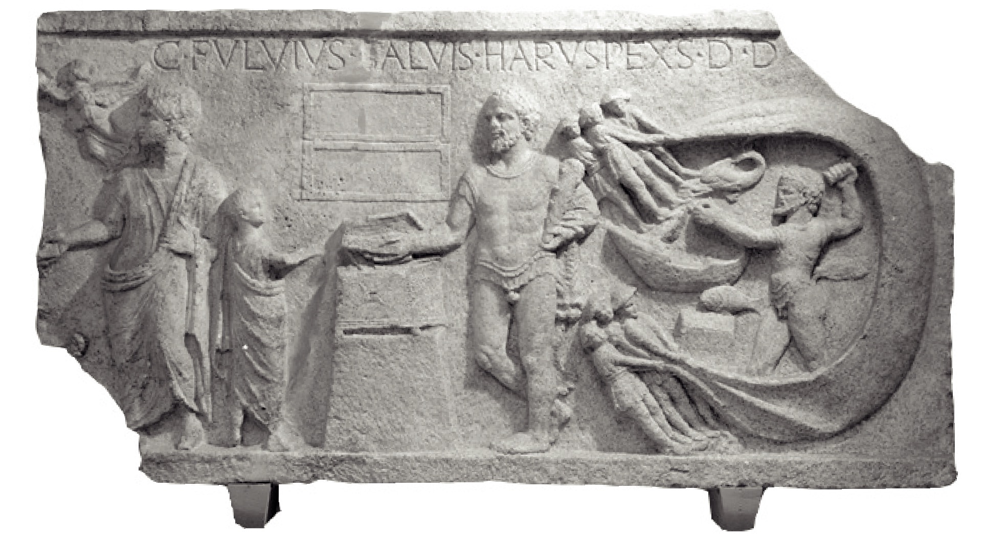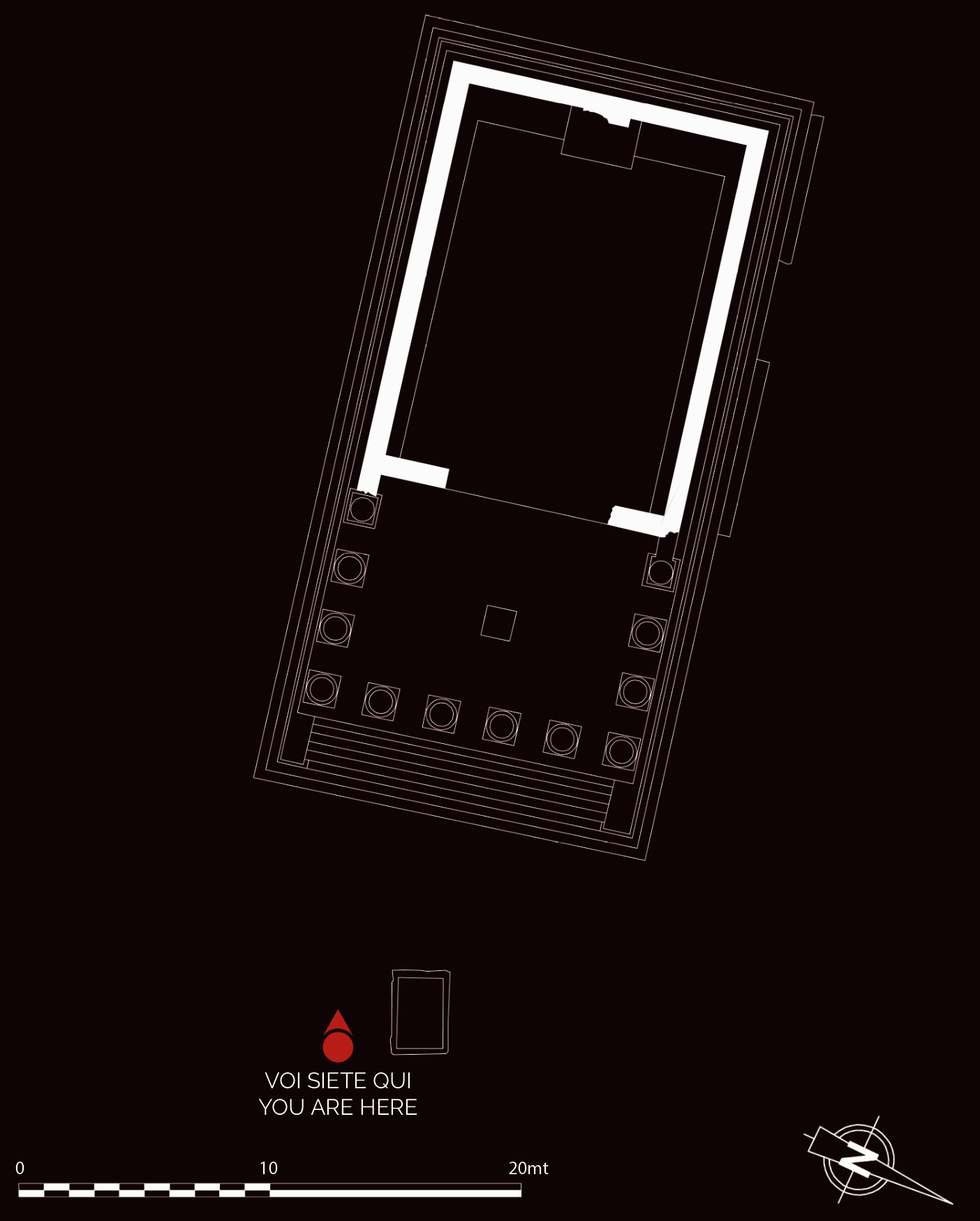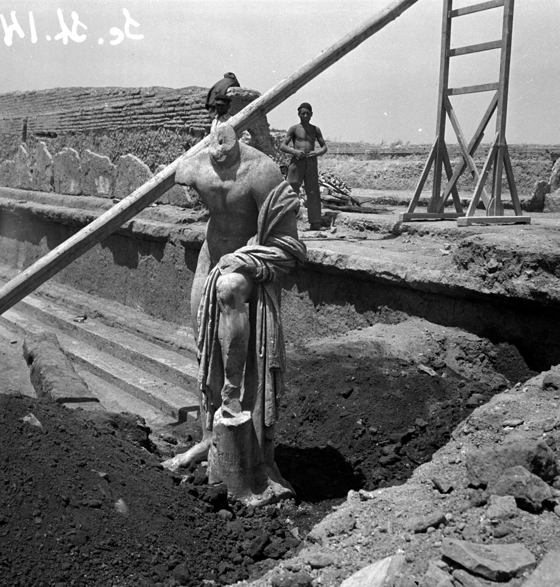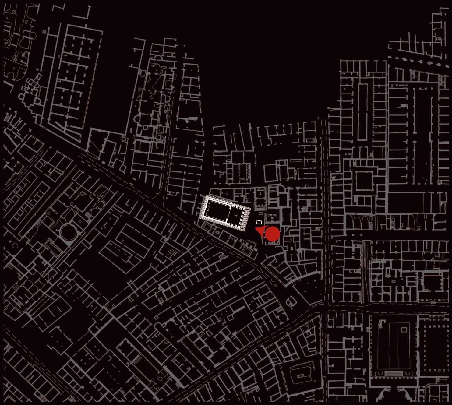 The temple of Hercules, built between the late 2nd and early 1st century BC, stood on a high podium and had a porch with six columns along the front, accessed by a staircase. Inside the porch stands a copy of a votive statue of Cartilius 23 Poplicola, a leading figure in Ostia’s history during the 1st century BC, depicted as a resting athlete. The cult was oracular in nature, as we know from the marble relief found near the temple and dedicated by a haruspex (priest), depicting the miraculous discovery in the sea of a statue of the armed Hercules, and a subsequent scene of divination: the god’s iconography and the reference to an event of war suggest that the cult had military as well as commercial connotations. The cult’s importance is evidenced by its remarkable persistence, documented by the restorations of the temple until the 4th century AD.
