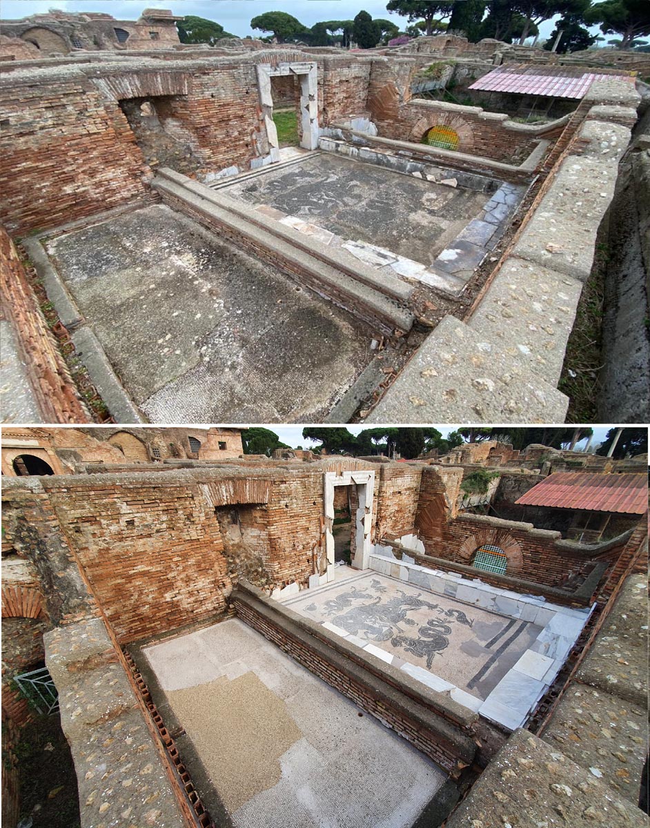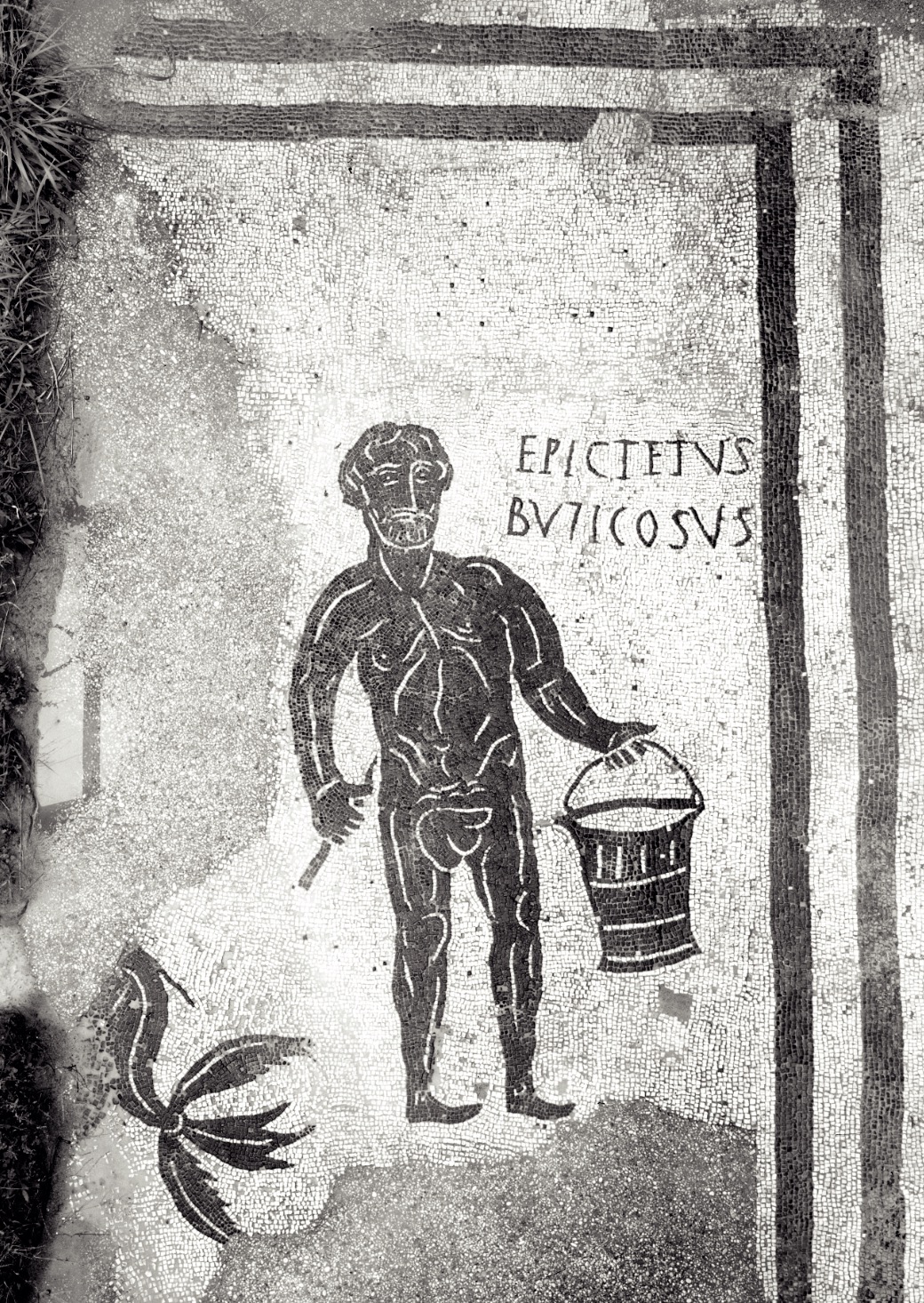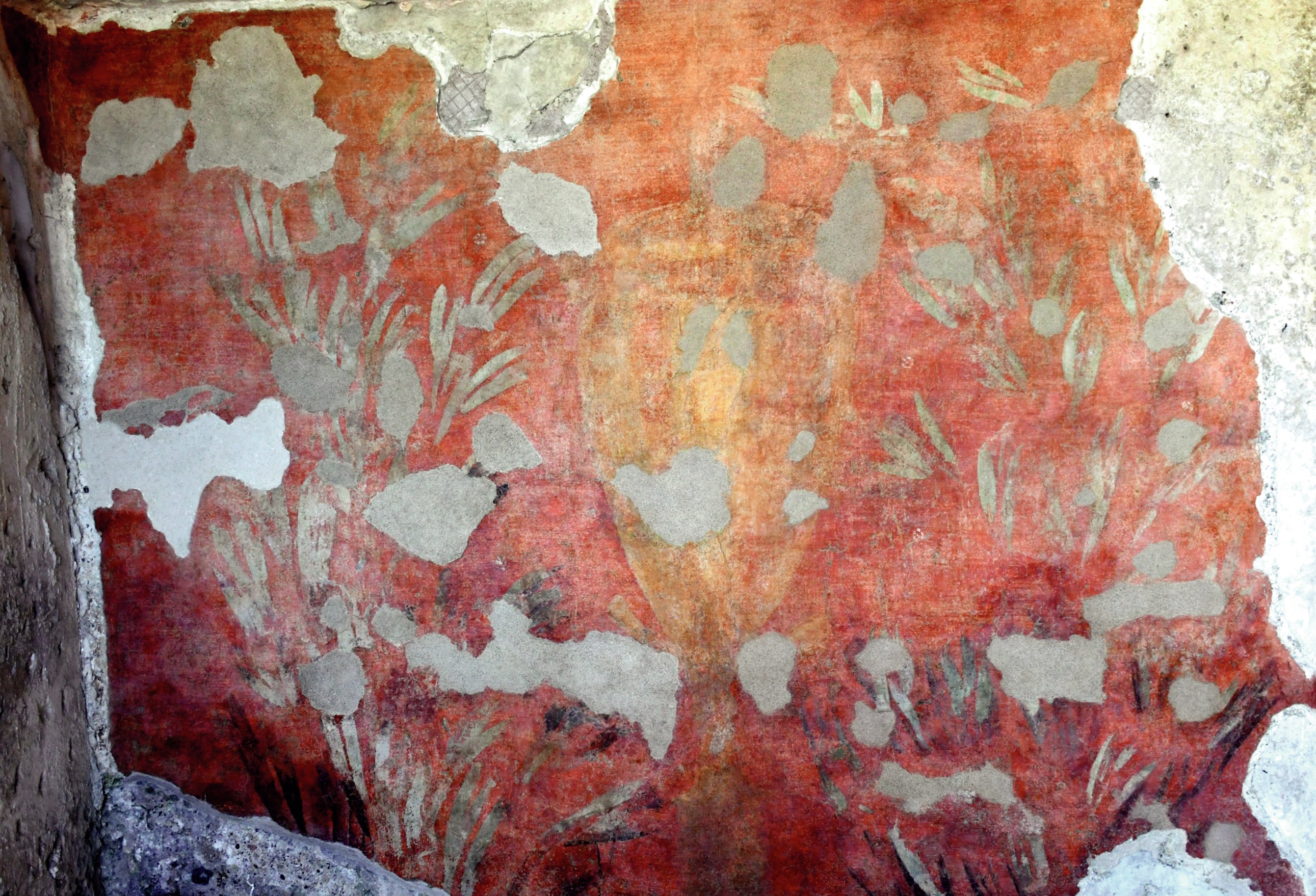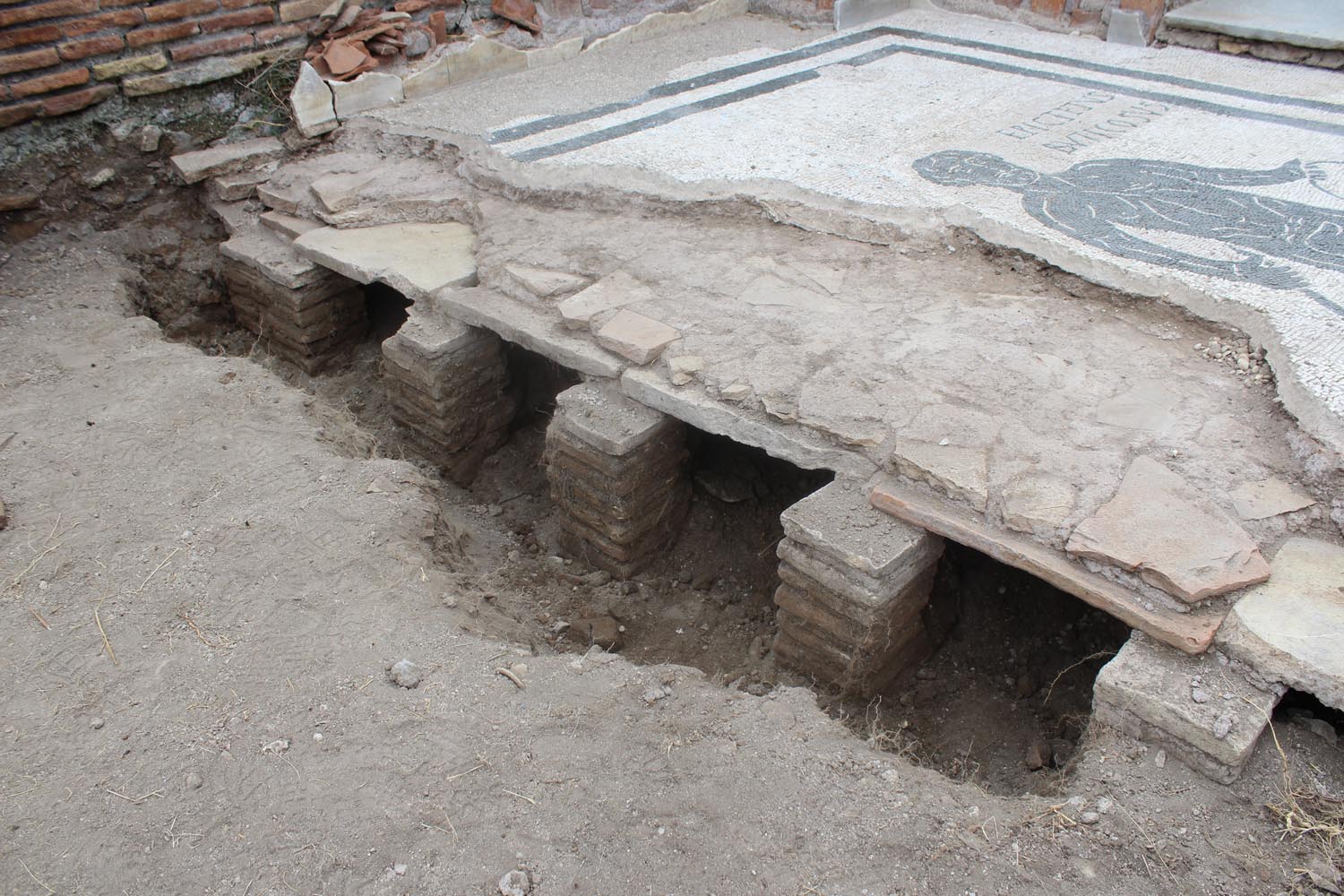 This privately-owned bath complex was built in around AD 110 and renovated a few decades later. It was accessed through a long entrance hall with benches (A), decorated with paintings with plant motifs, which are repeated in the back room (B). The heated rooms were in the western part: the mosaic floor of one of the hot rooms (C) depicts a nude male figure accompanied by an inscription with the name Epictetus Buticosus, who can be identified as the manager of the baths. The calidarium (room for hot baths) preserves a mosaic with a sea scene (a Triton and a Nereid) and two marble-clad basins (E). The water supply was guaranteed by a cistern equipped with a noria (water wheel), located in the adjacent Republican Sacred Area.