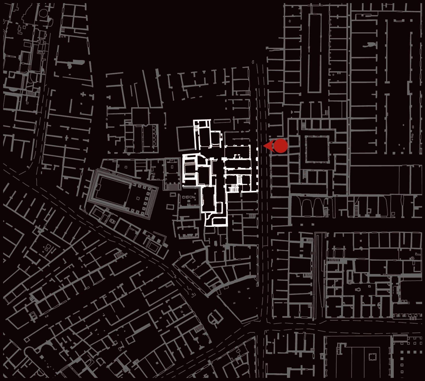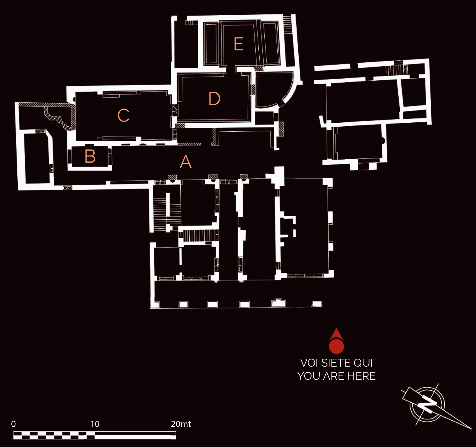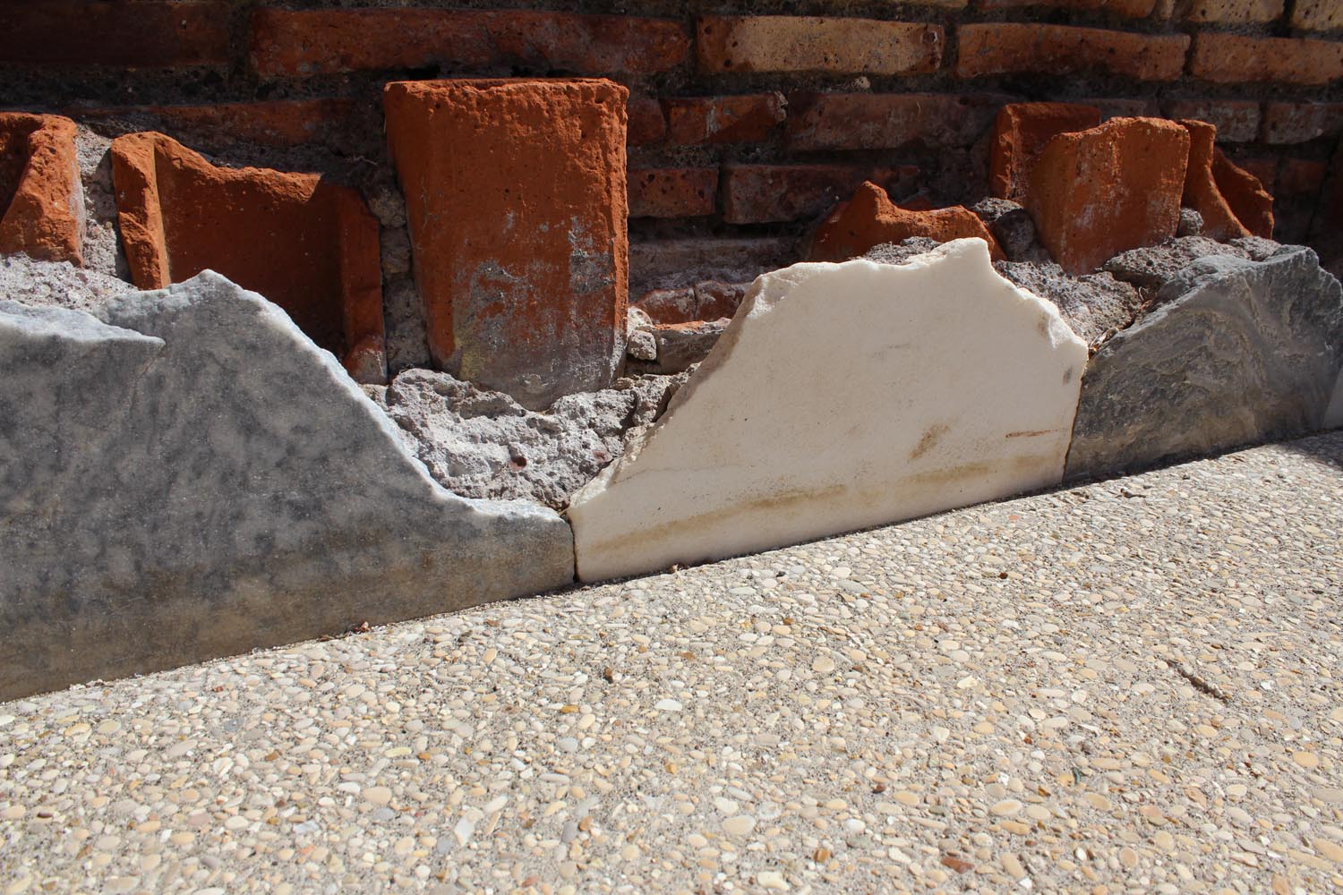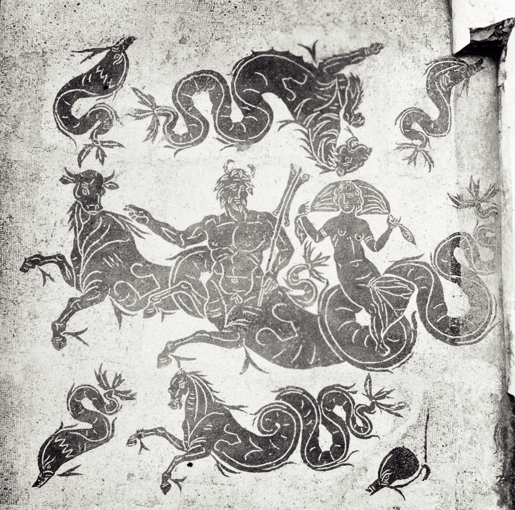 This privately-owned bath complex was built in around AD 110 and renovated a few decades later. It was accessed through a long entrance hall with benches (A), decorated with paintings with plant motifs, which are repeated in the back room (B). The heated rooms were in the western part: the mosaic floor of one of the hot rooms (C) depicts a nude male figure accompanied by an inscription with the name Epictetus Buticosus, who can be identified as the manager of the baths. The calidarium (room for hot baths) preserves a mosaic with a sea scene (a Triton and a Nereid) and two marble-clad basins (E). The water supply was guaranteed by a cistern equipped with a noria (water wheel), located in the adjacent Republican Sacred Area.