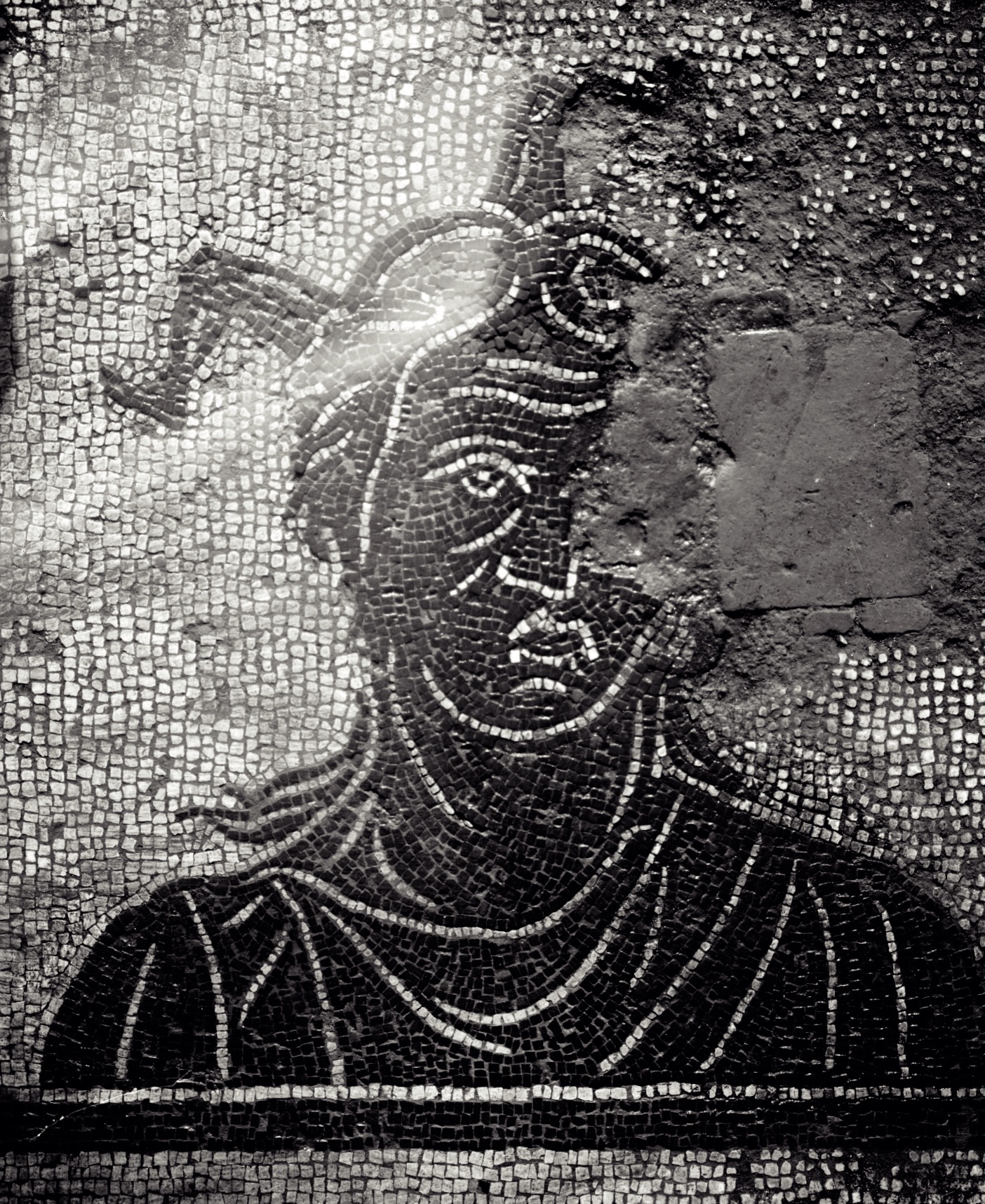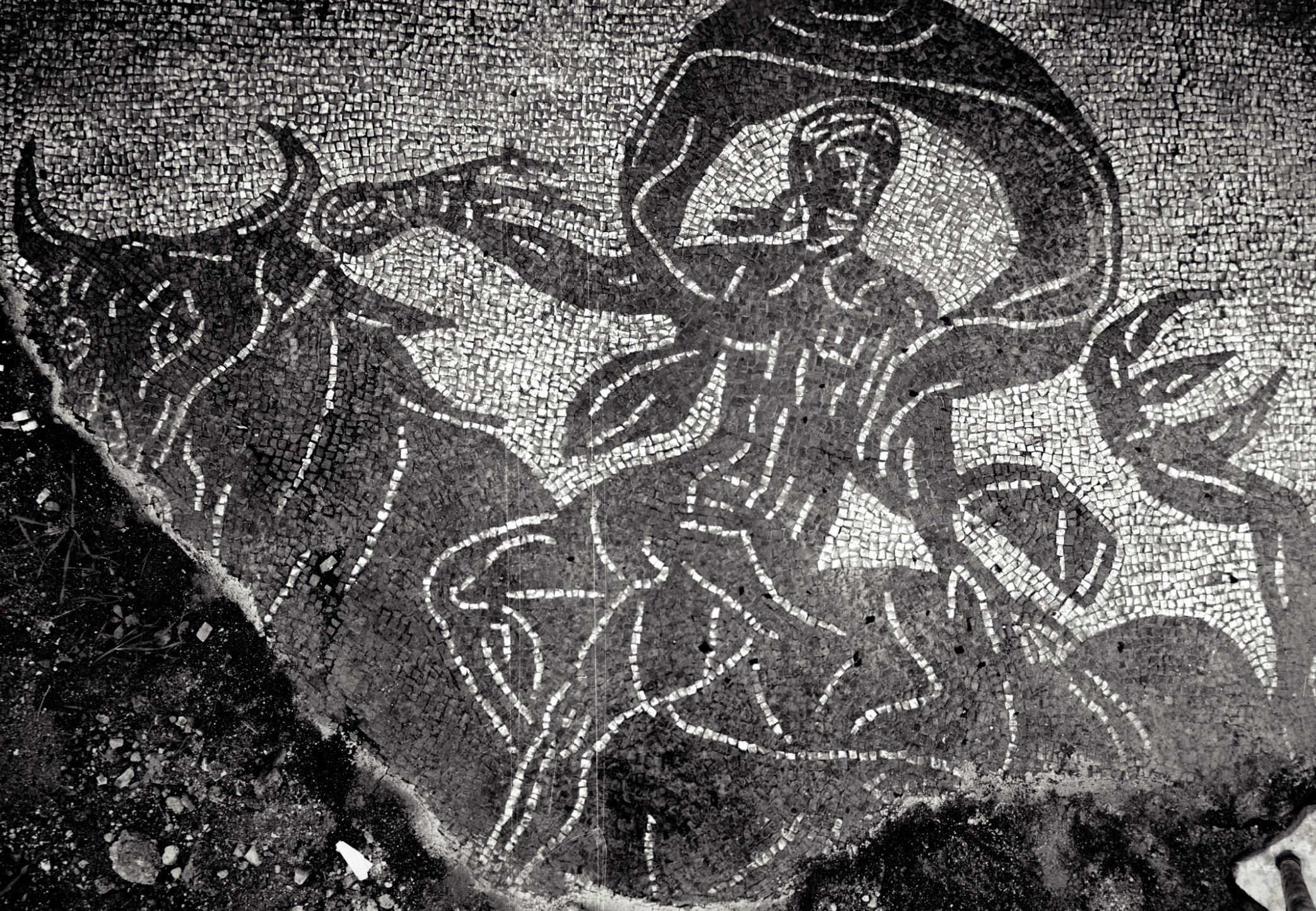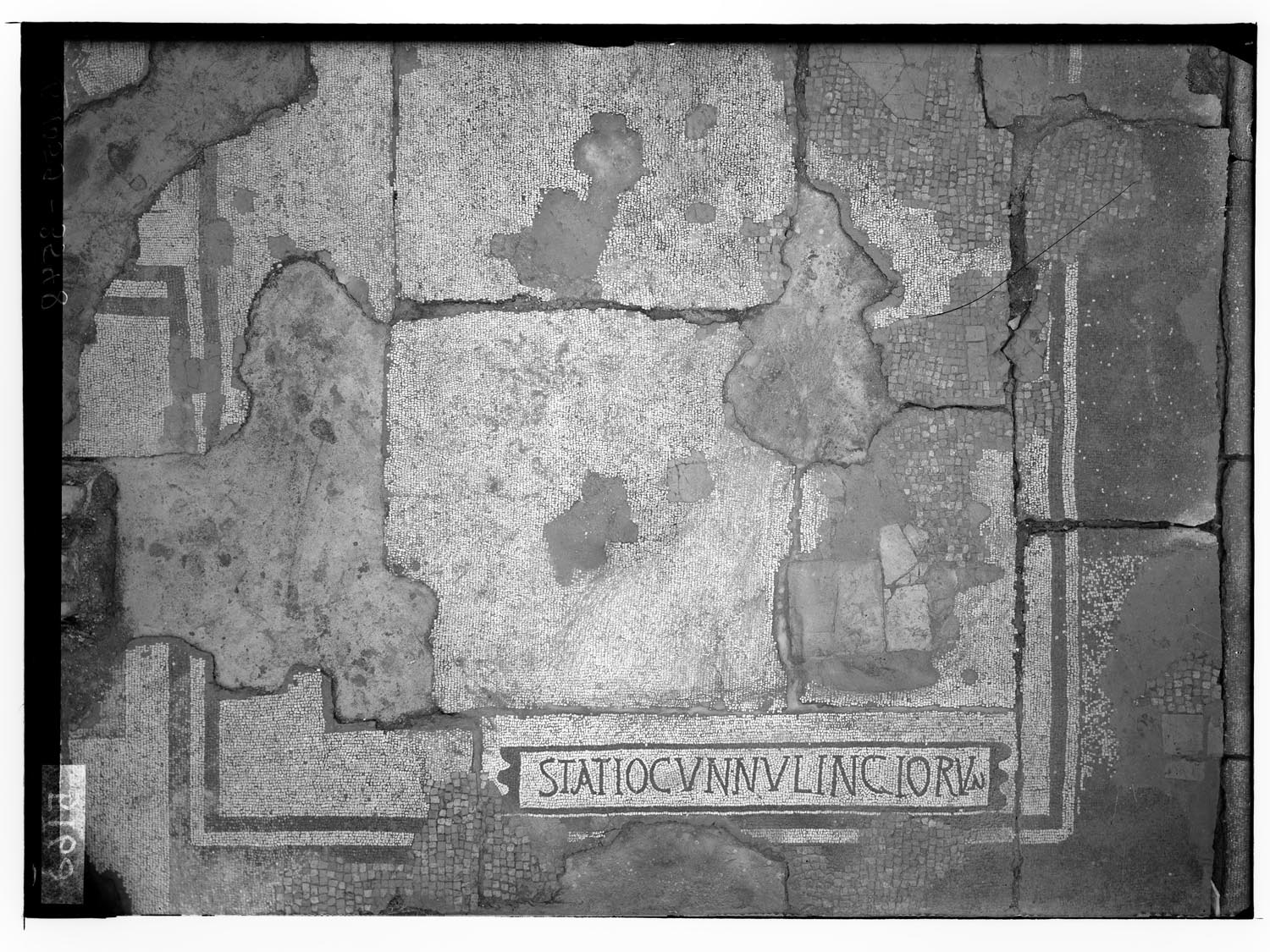 View of the mosaic of the room providing a passageway between the frigidarium and the heated environments, with erotic writing