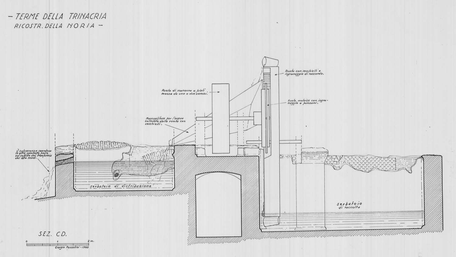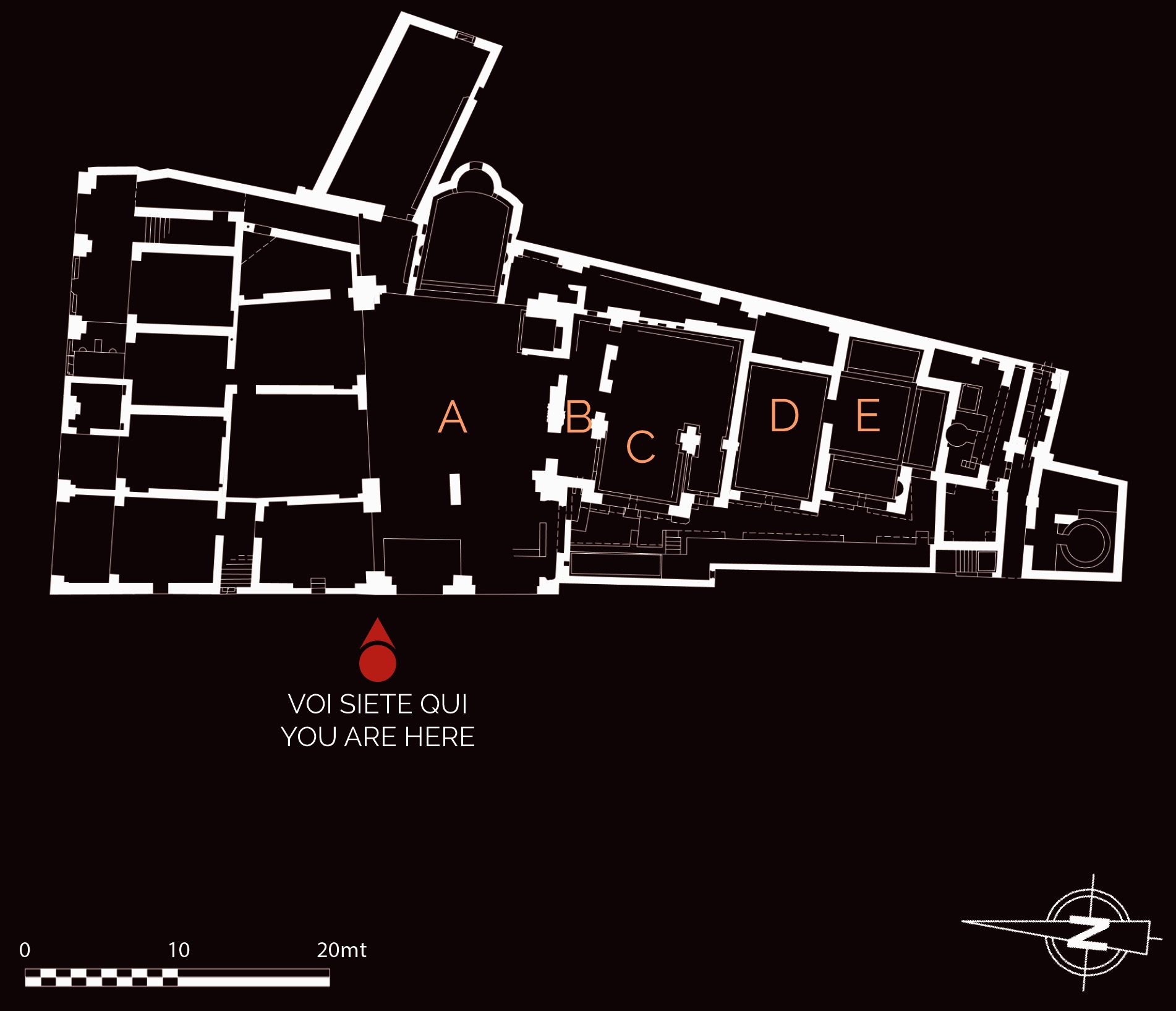 The baths were built in the Hadrianic period (AD 117-138) and transformed in the late 2nd century AD. A service corridor leads into a large courtyard that also functioned as a frigidarium (room for cold baths) (A). Another corridor (B), connected to the courtyard, has a mosaic floor with a personification of Sicily, or Trinacria, represented as a female bust with three legs on her head. It gives access to the heated rooms, which are in the south part of the complex. One of the rooms has a mosaic floor with marine motifs (C), whilst it is thought that the adjacent room was used by male sex workers given the presence of an inscription on the mosaic floor. Finally, the tepidarium (room for warm baths) has a mosaic with a scene of athletes receiving prizes (D).