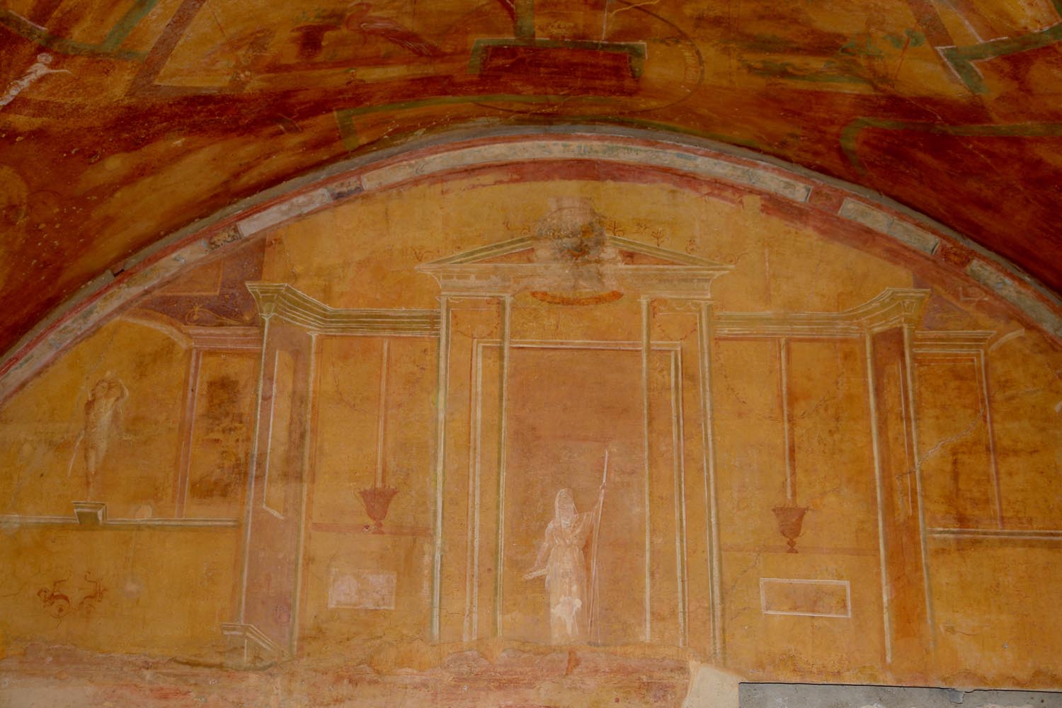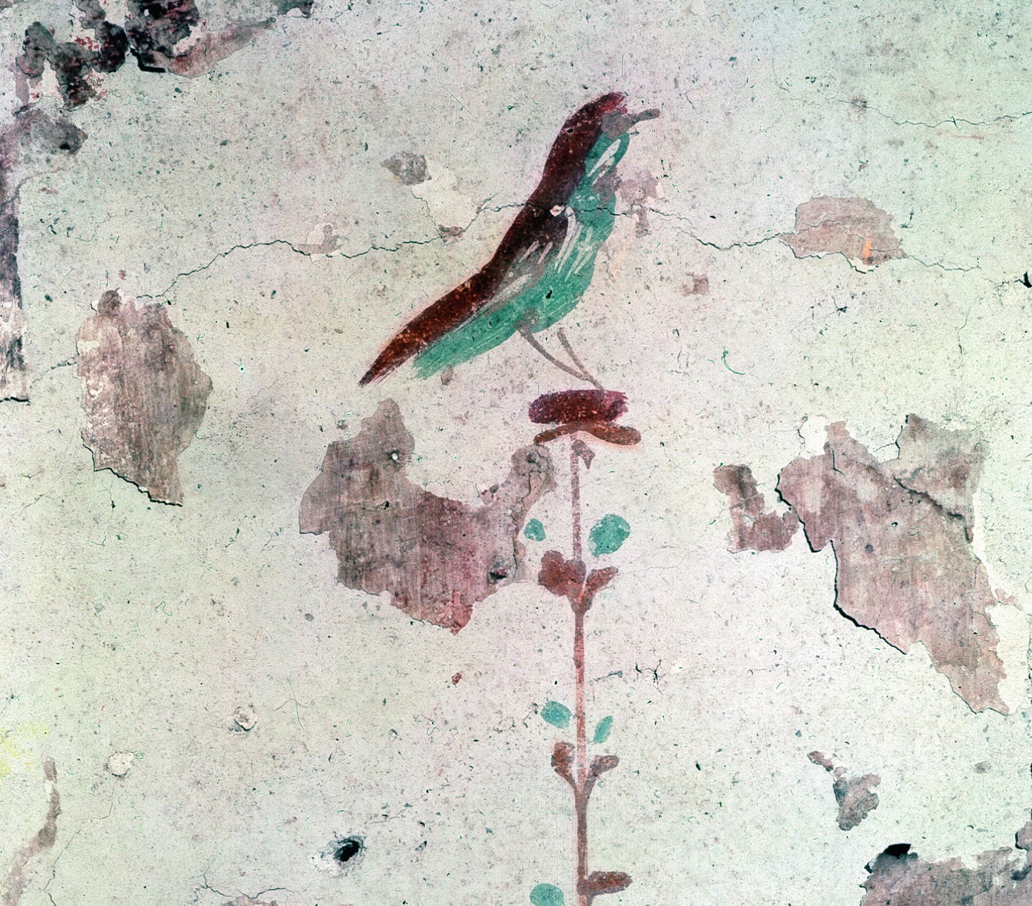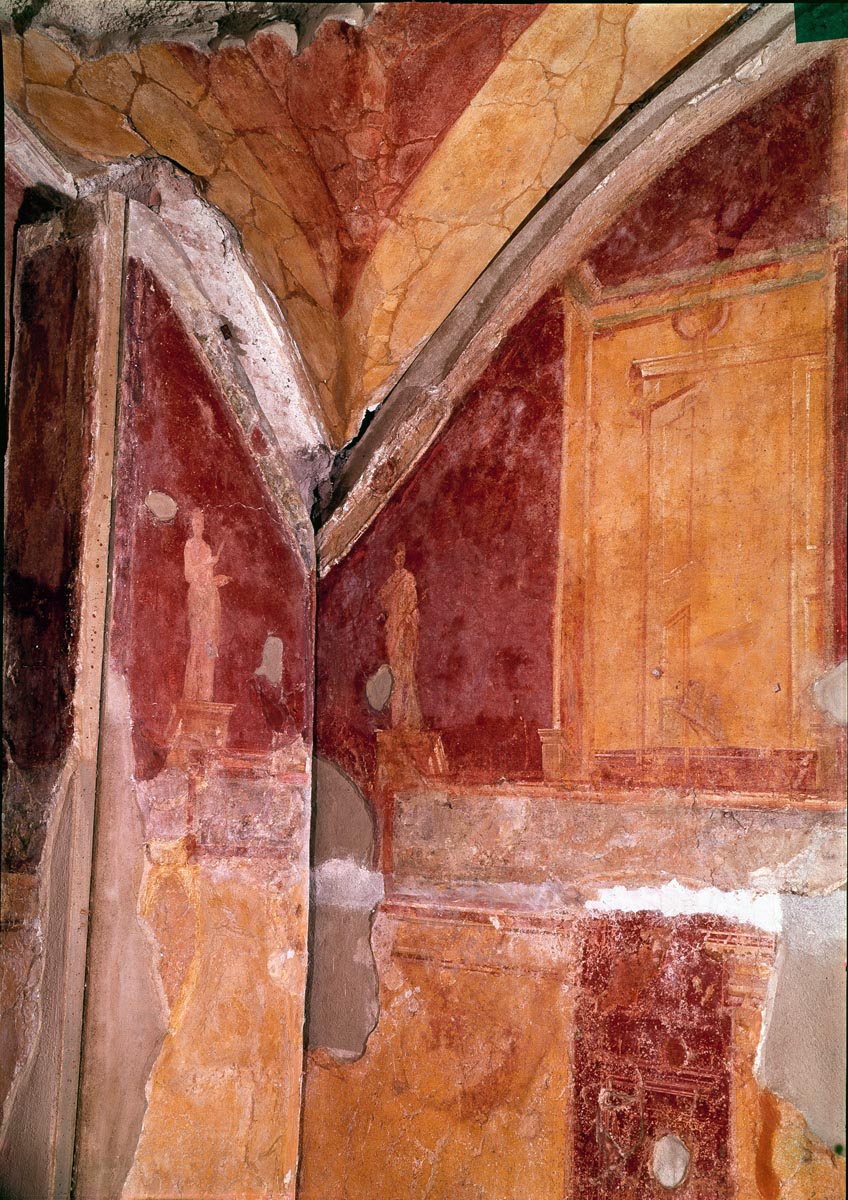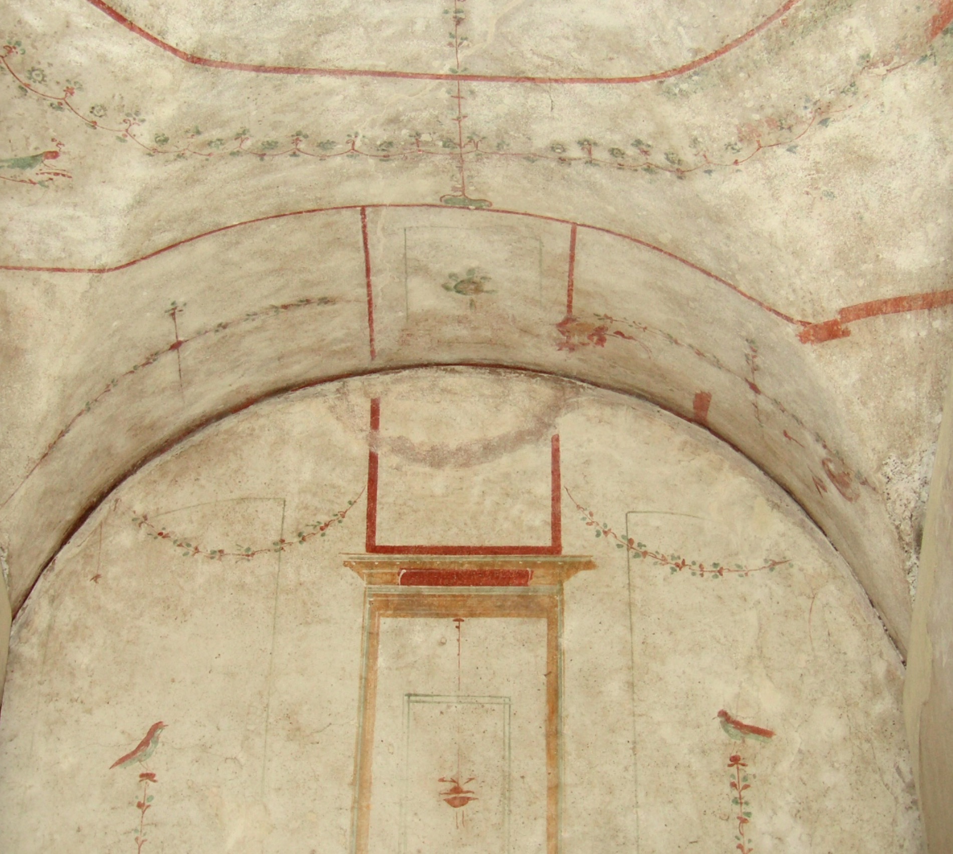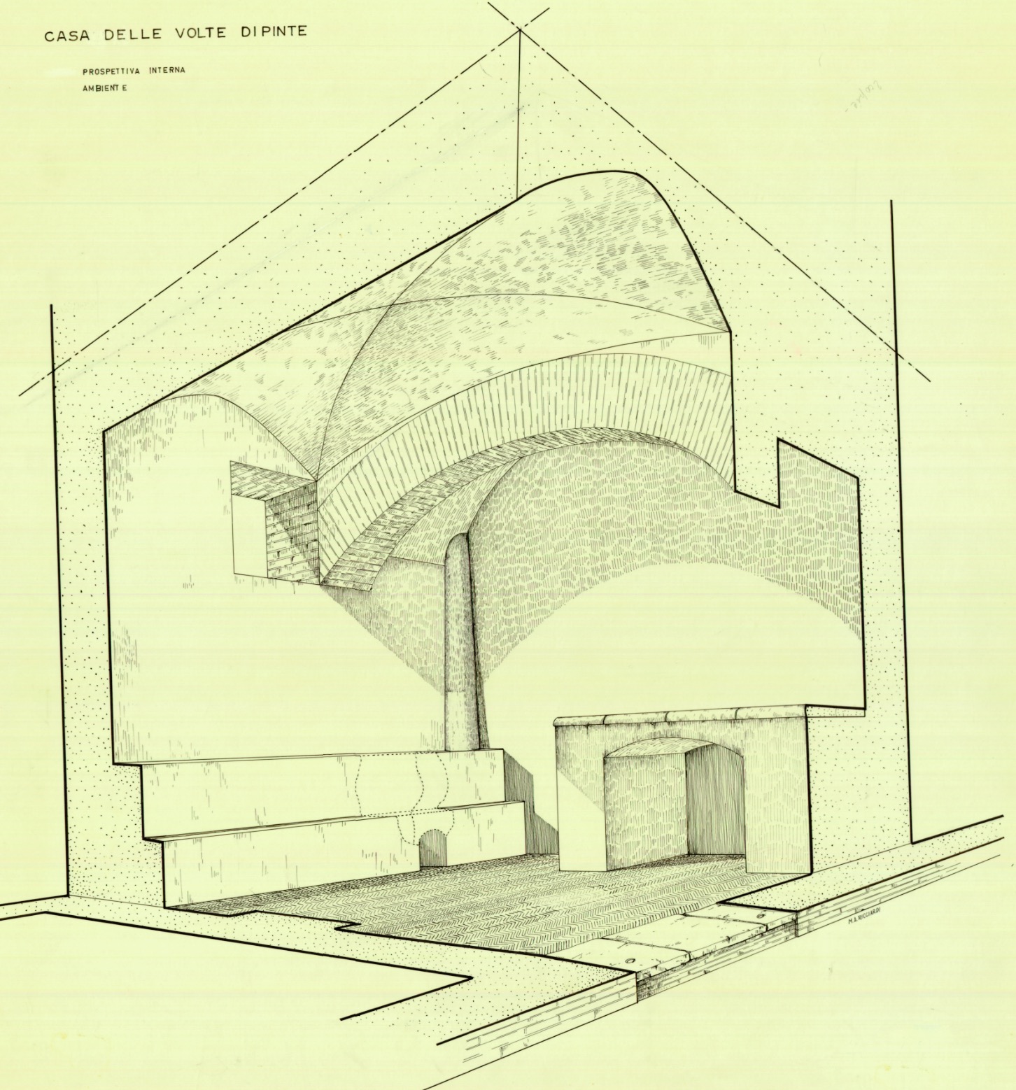 Built in around AD 120, the insula (residence) has an unusual layout: the rooms are arranged on either side of a central corridor (B). The public rooms (C-E) face the Case a Giardino, whilst the private (F-H) and service rooms, including the kitchen (I), look in the opposite direction. The mosaics can generally be assigned to the original phase of the building; the paintings dating to between the late 2nd and early 3rd century AD have a white ground in the private rooms and a yellow and red ground in the public rooms. In the 3rd century AD, one of the corner rooms in the house was turned into a wine bar (thermopolium) (J); its presence, together with the arrangement of the rooms, has suggested that the building may have been used as a hotel.