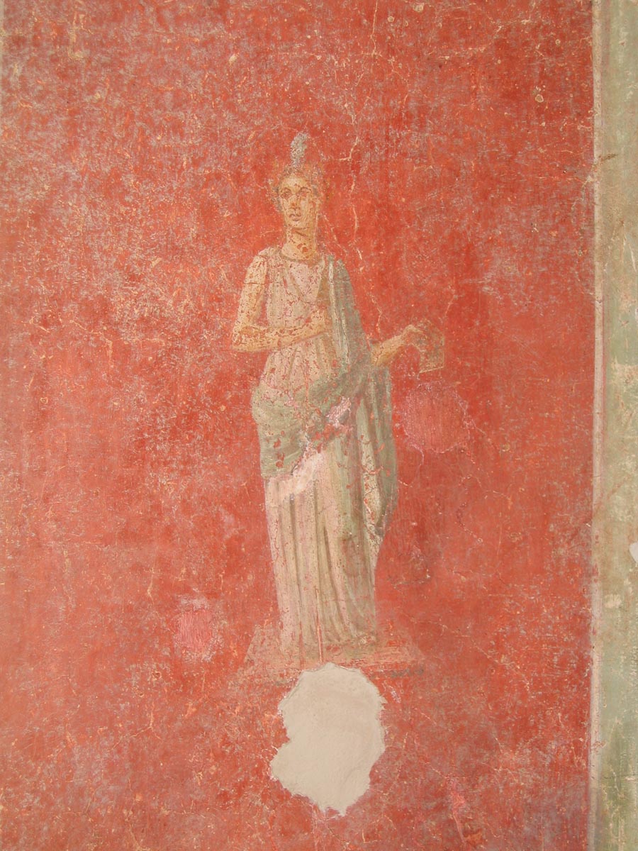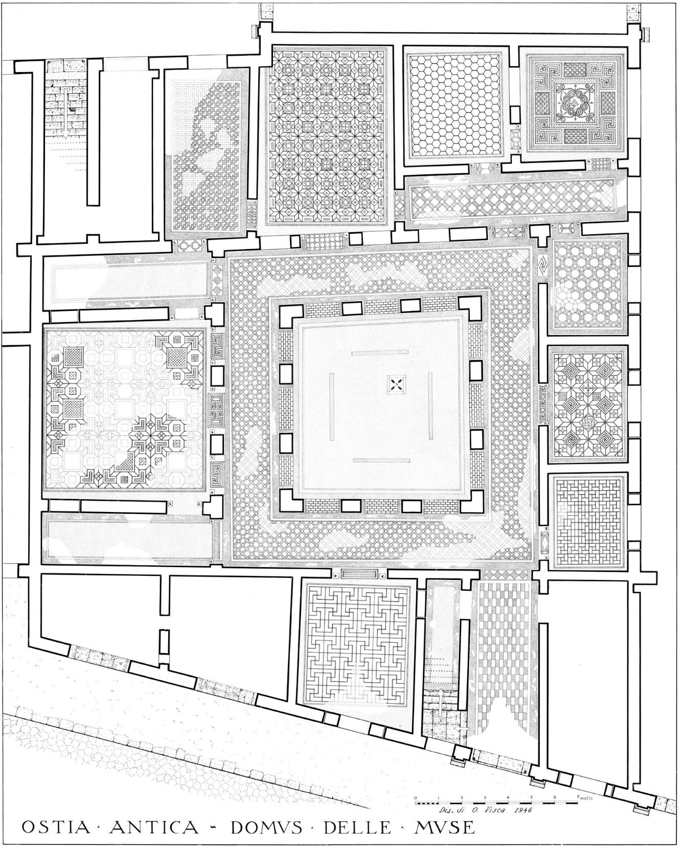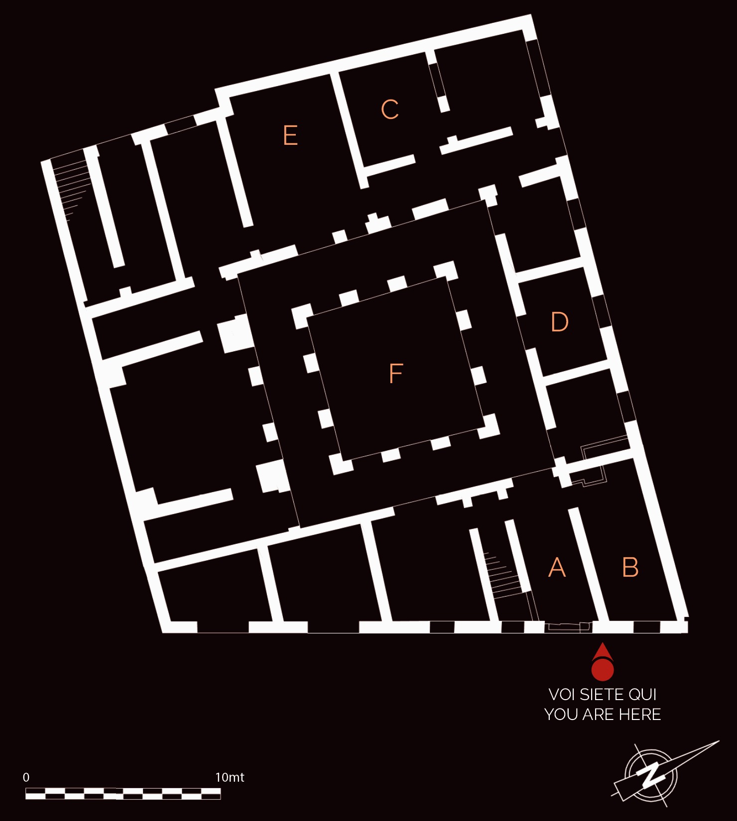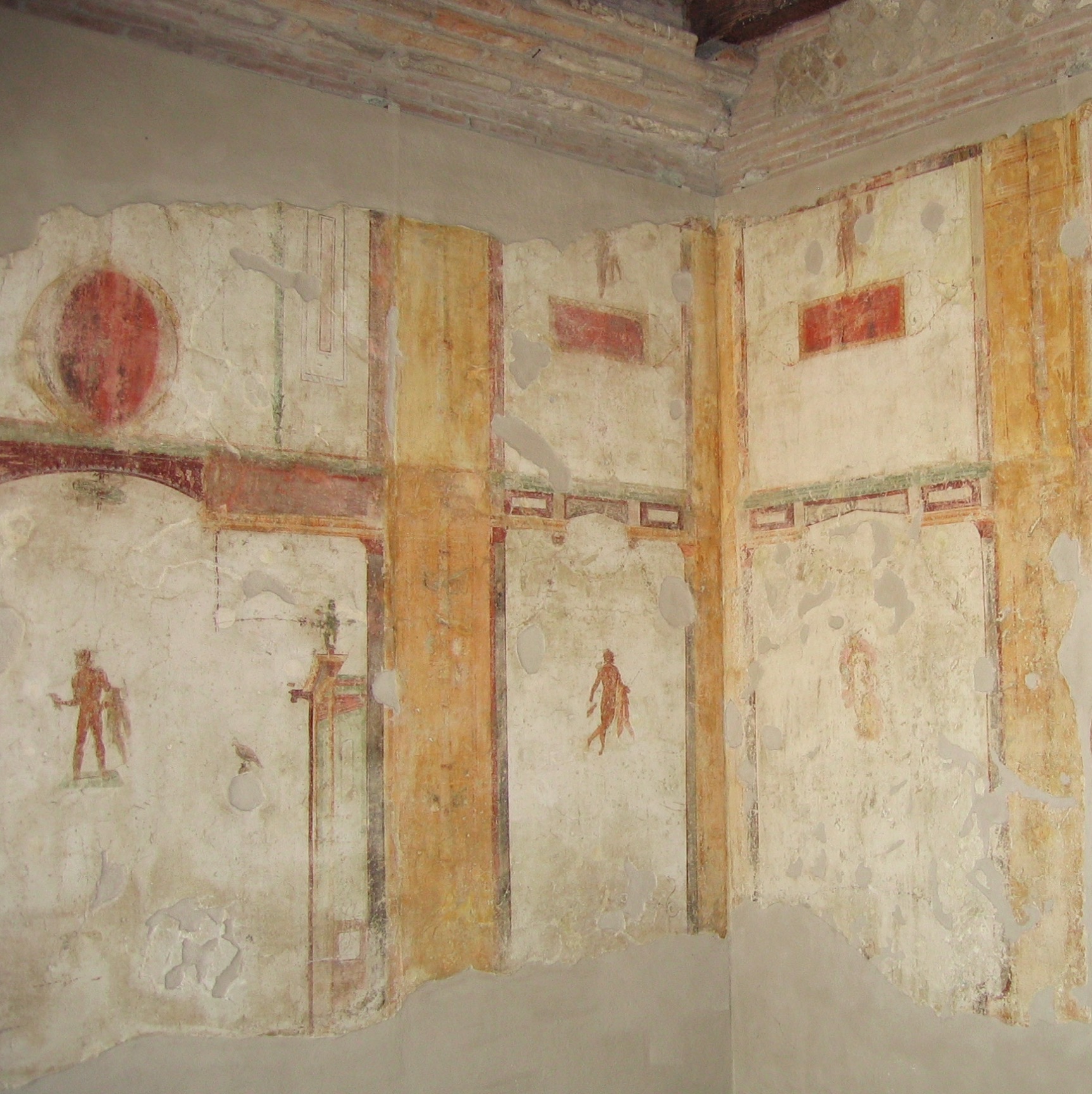 The only residence among those belonging to the complex of the Case a Giardino to have a porticoed courtyard, this building also stands out from the others for its large size and the quality of the decorative programme. The building still preserves the mosaic floors of the Hadrianic phase (AD 130), with geometrical and figurative motifs chosen to reflect the importance of each room, and a set of wall paintings that are among the city’s most important. Belonging to the original phase are the paintings with the cycle of Apollo and the Muses in the sitting room near the entrance (D), the decorations of the huge banqueting hall (triclinium) (E) and, in one of the private rooms (C), the paintings on a white ground with images linked to the god Dionysus. The later renovations of part of the wall decorations indicate that the house remained in use at least until the 4th century AD.