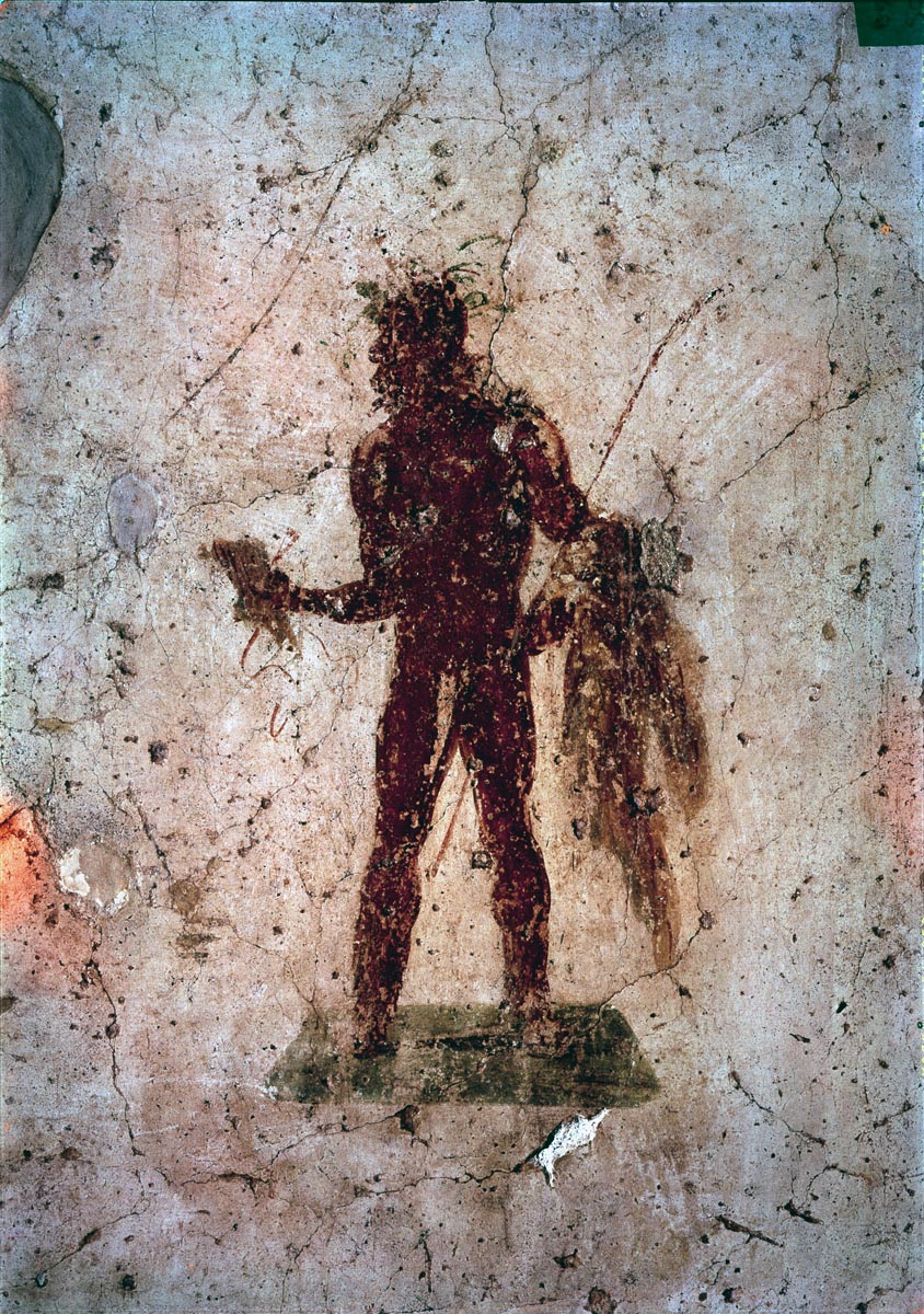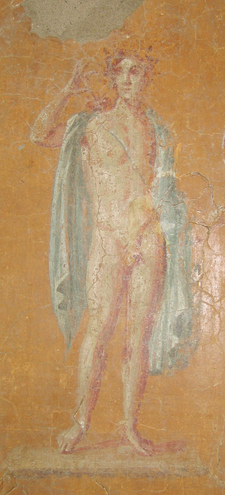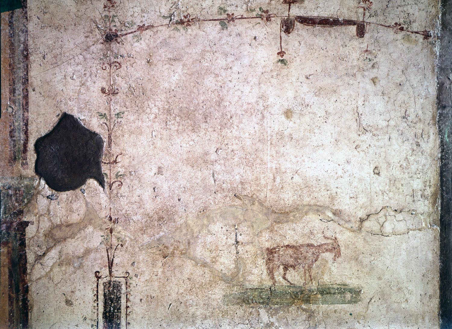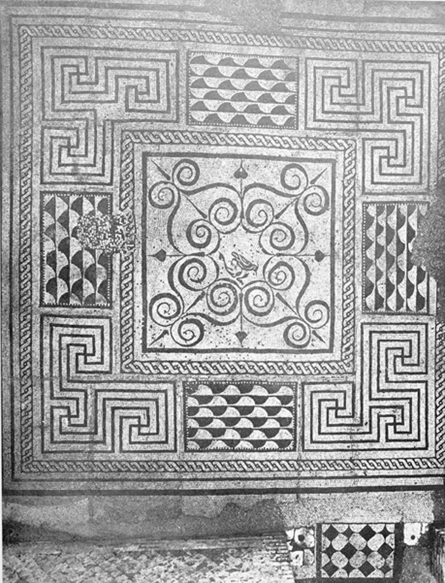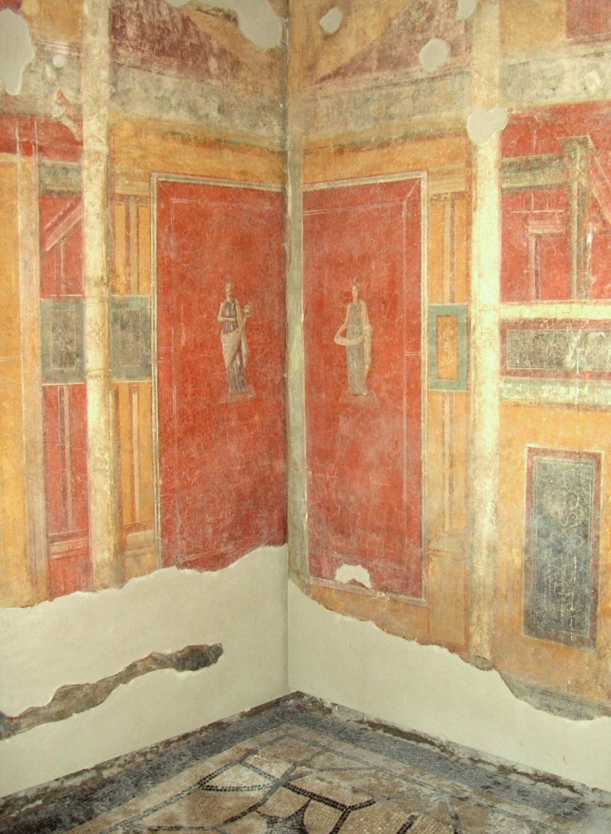 The only residence among those belonging to the complex of the Case a Giardino to have a porticoed courtyard, this building also stands out from the others for its large size and the quality of the decorative programme. The building still preserves the mosaic floors of the Hadrianic phase (AD 130), with geometrical and figurative motifs chosen to reflect the importance of each room, and a set of wall paintings that are among the city’s most important. Belonging to the original phase are the paintings with the cycle of Apollo and the Muses in the sitting room near the entrance (D), the decorations of the huge banqueting hall (triclinium) (E) and, in one of the private rooms (C), the paintings on a white ground with images linked to the god Dionysus. The later renovations of part of the wall decorations indicate that the house remained in use at least until the 4th century AD.