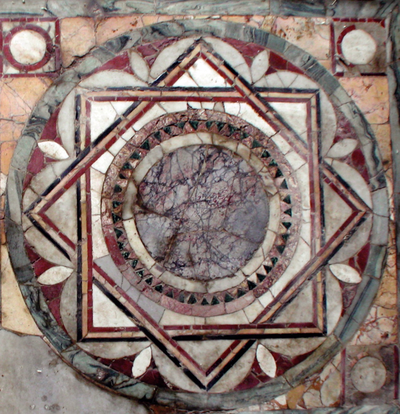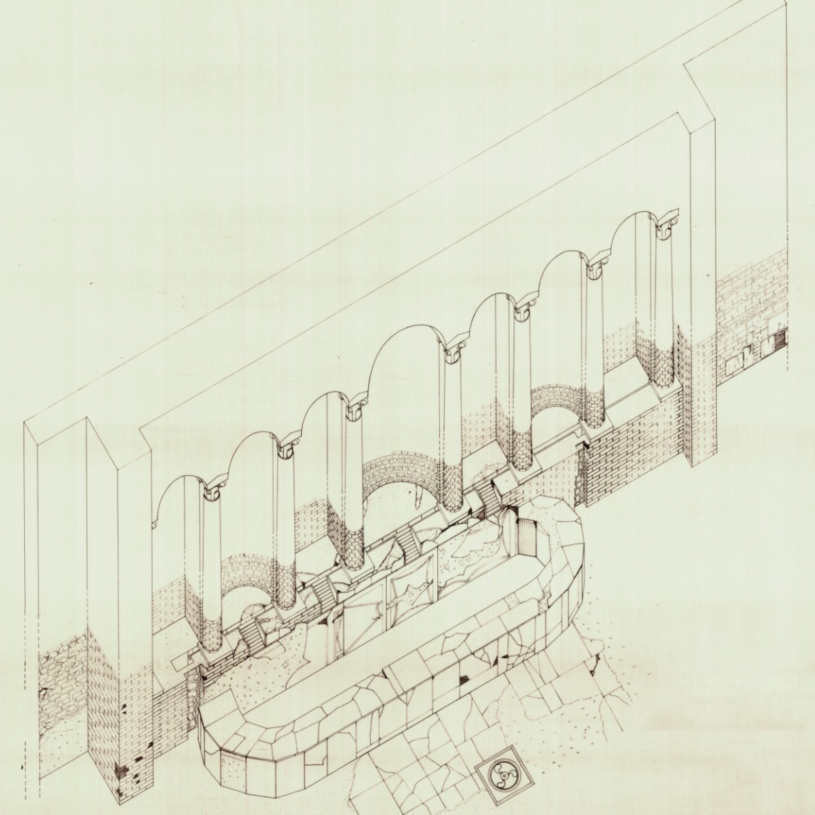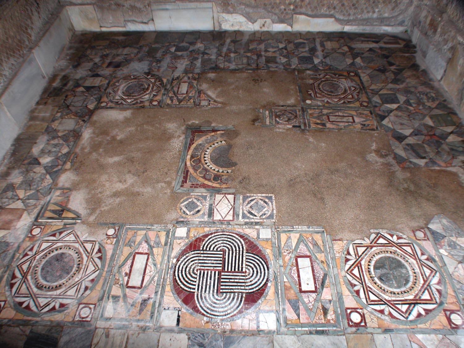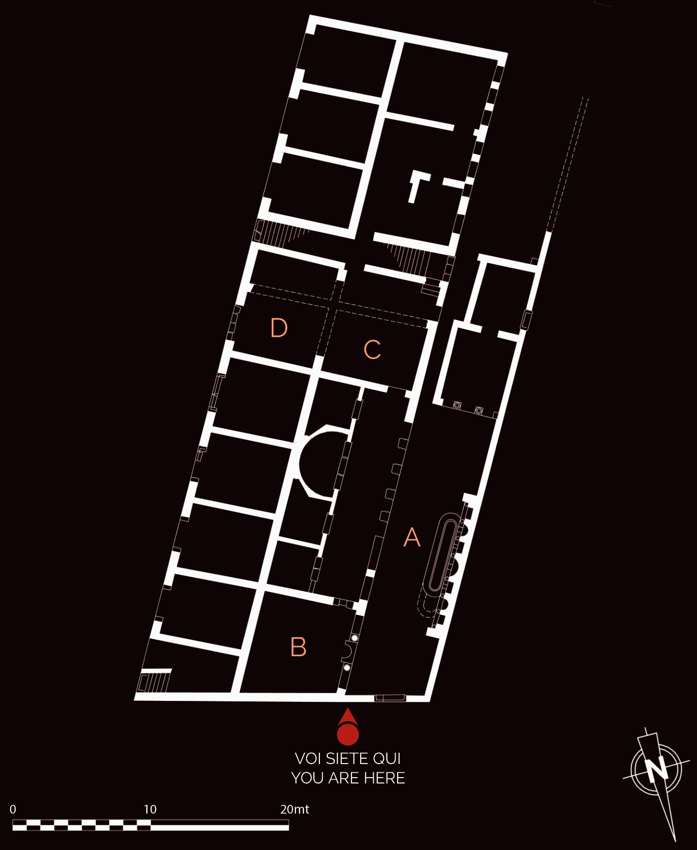 This wealthy domus (residence) was constructed in the second half of the 4th century AD, in an area previously occupied by two building complexes of the early 2nd century AD. It was entered through a courtyard (A), which provided light to the residence, embellished with a marble nymphaeum decorated with niches. Opening onto the courtyard through a tripartite aperture was a huge room (B) decorated on the floor and walls with opus sectile inlays, also preserved in other rooms of the domus; a porticoed corridor leads to the innermost rooms of the house. The façade overlooking the Decumanus is enhanced by the presence of a large vestibule, divided into two rooms (C-D), originally decorated with wall paintings showing scenes of rural life.