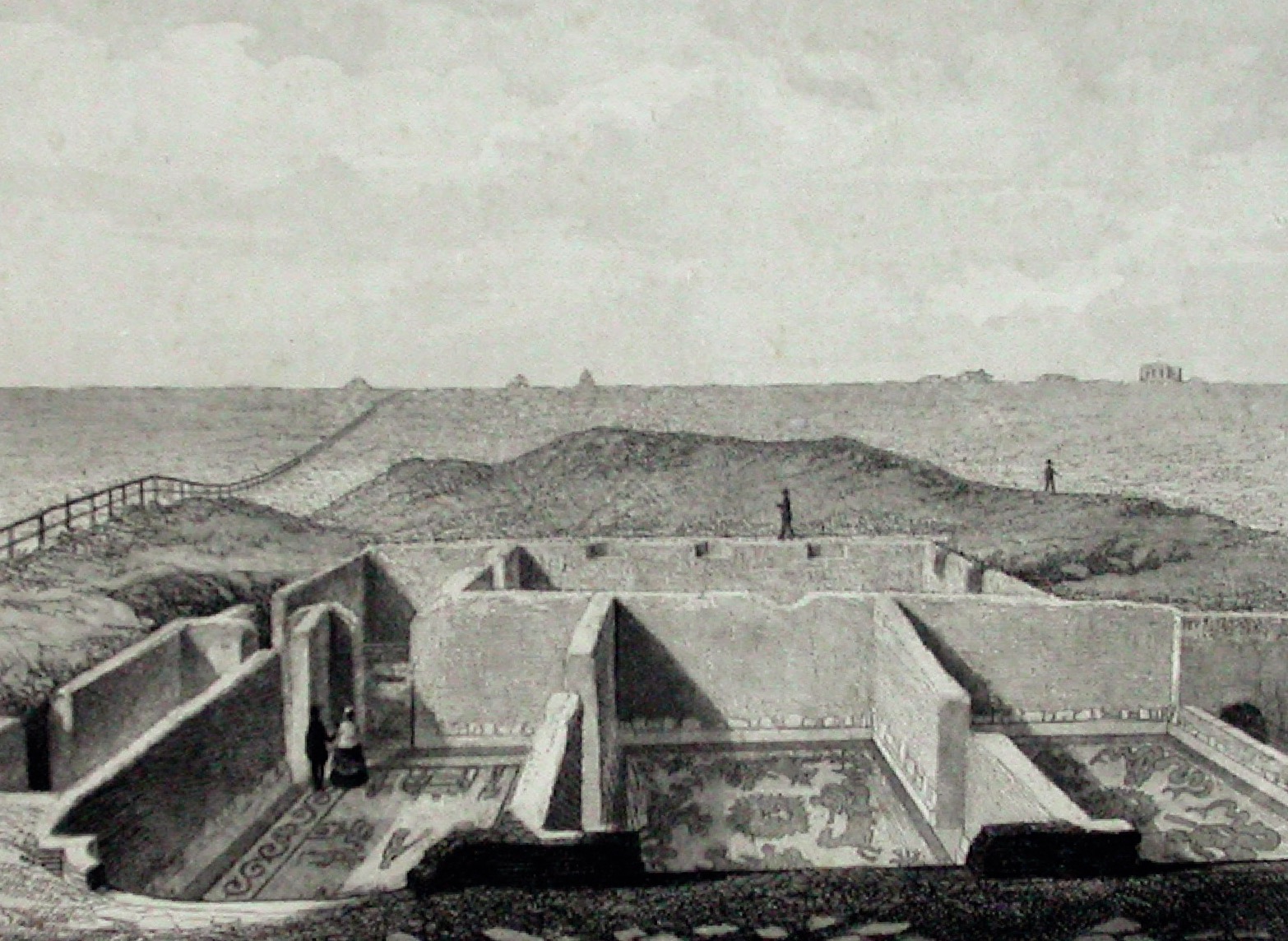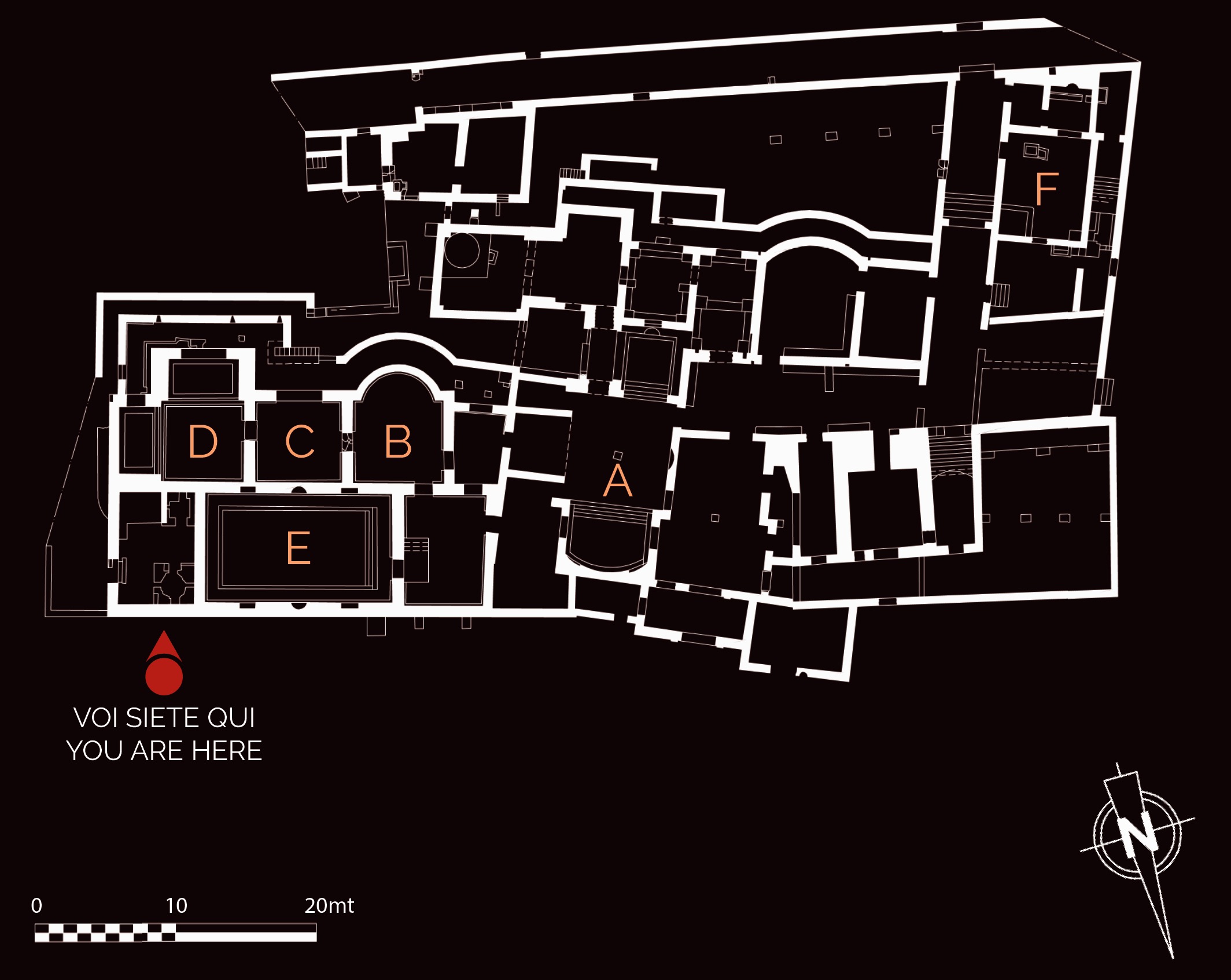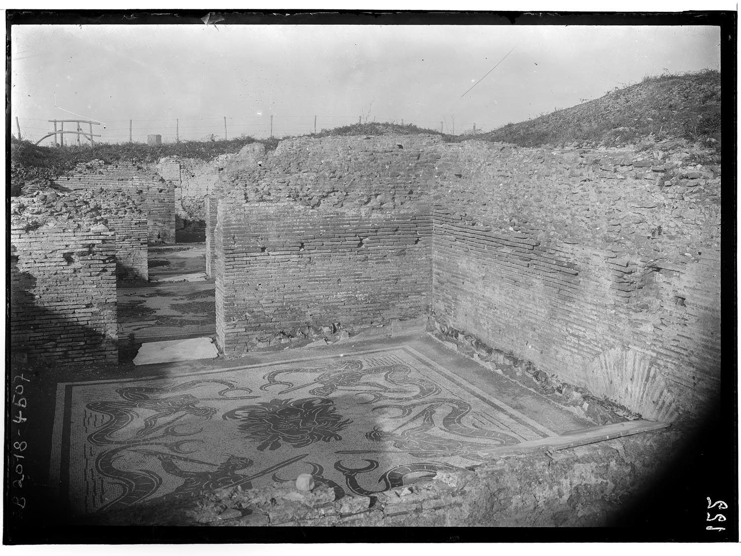 The bath complex, which has only been partially investigated, was built in around AD 130 during the Hadrianic period, in connection with the nearby Case a Giardino, constructed at the same time. The structure, with terraces descending towards the sea, was built on top of a stretch of the Republican walls, which were no longer in use. The baths had a frigidarium (room for cold baths) with marble basins and a marble floor (A); in the east sector were the warm rooms with mosaic floors depicting athletes (B), sea creatures and masks of the god Oceanus (C-D), and a heated natatio (pool) (E). The building underwent various transformations between the 3rd and 4th centuries AD; later, after its abandonment, lime kilns (F) were installed inside.
