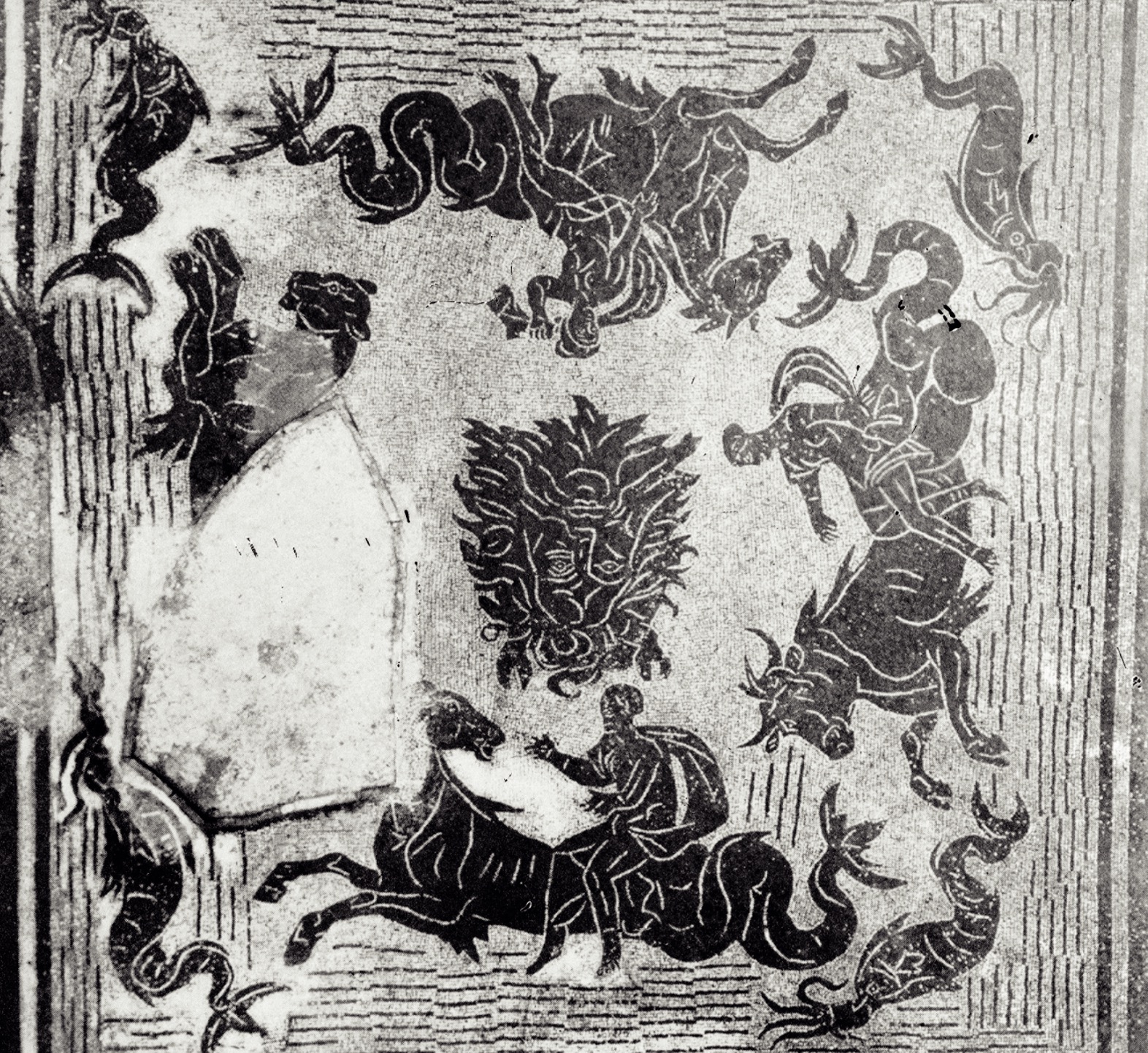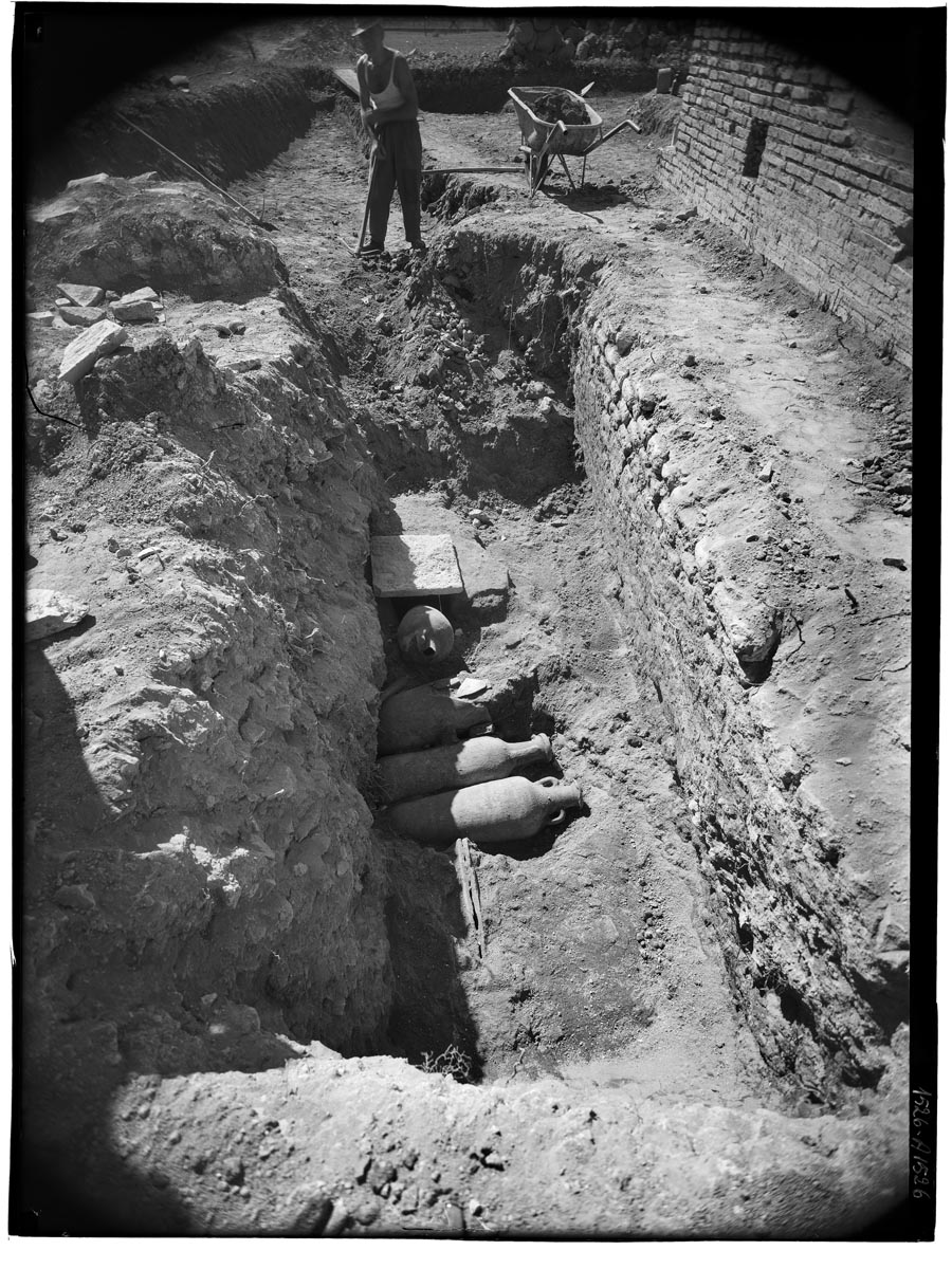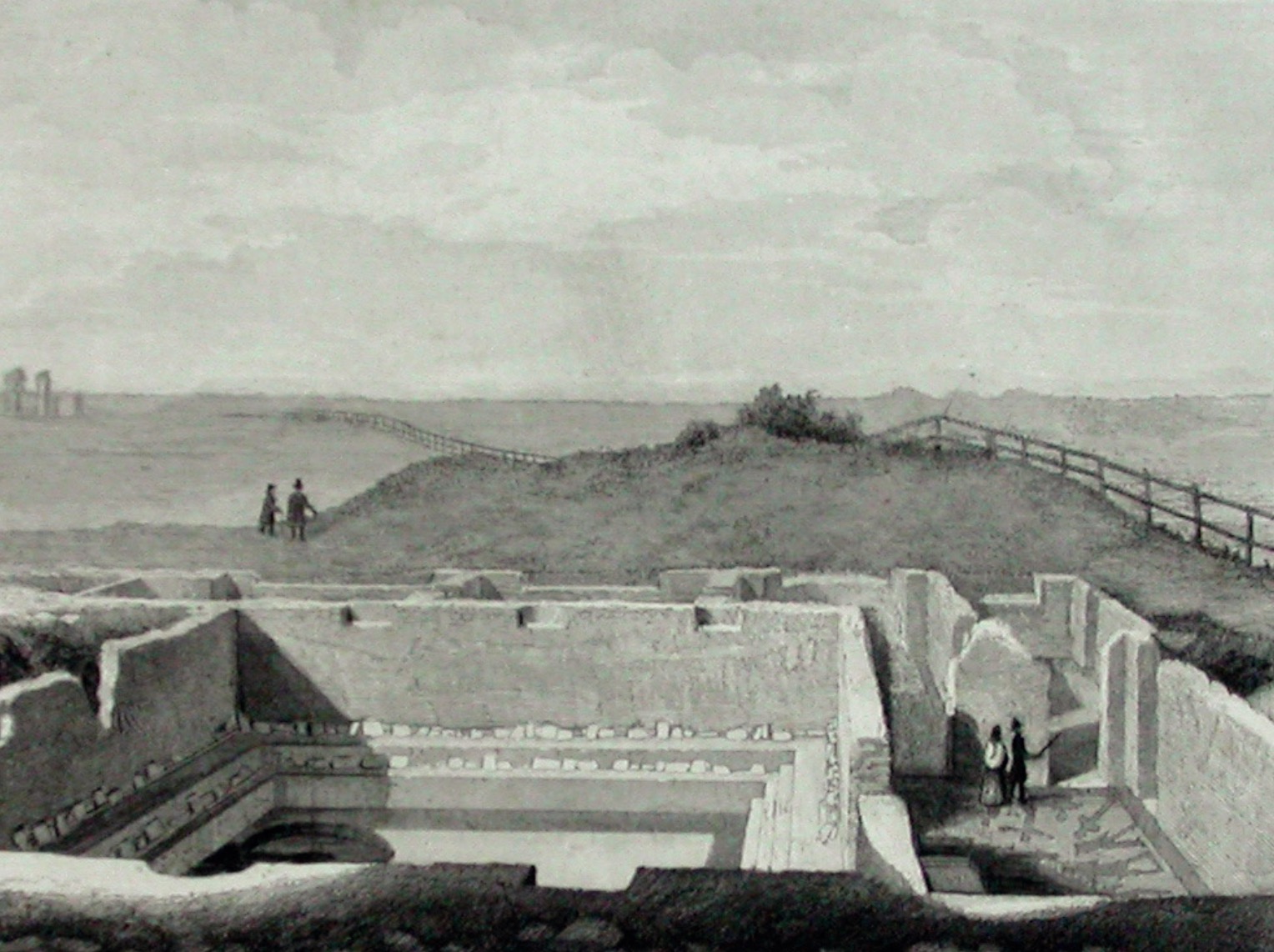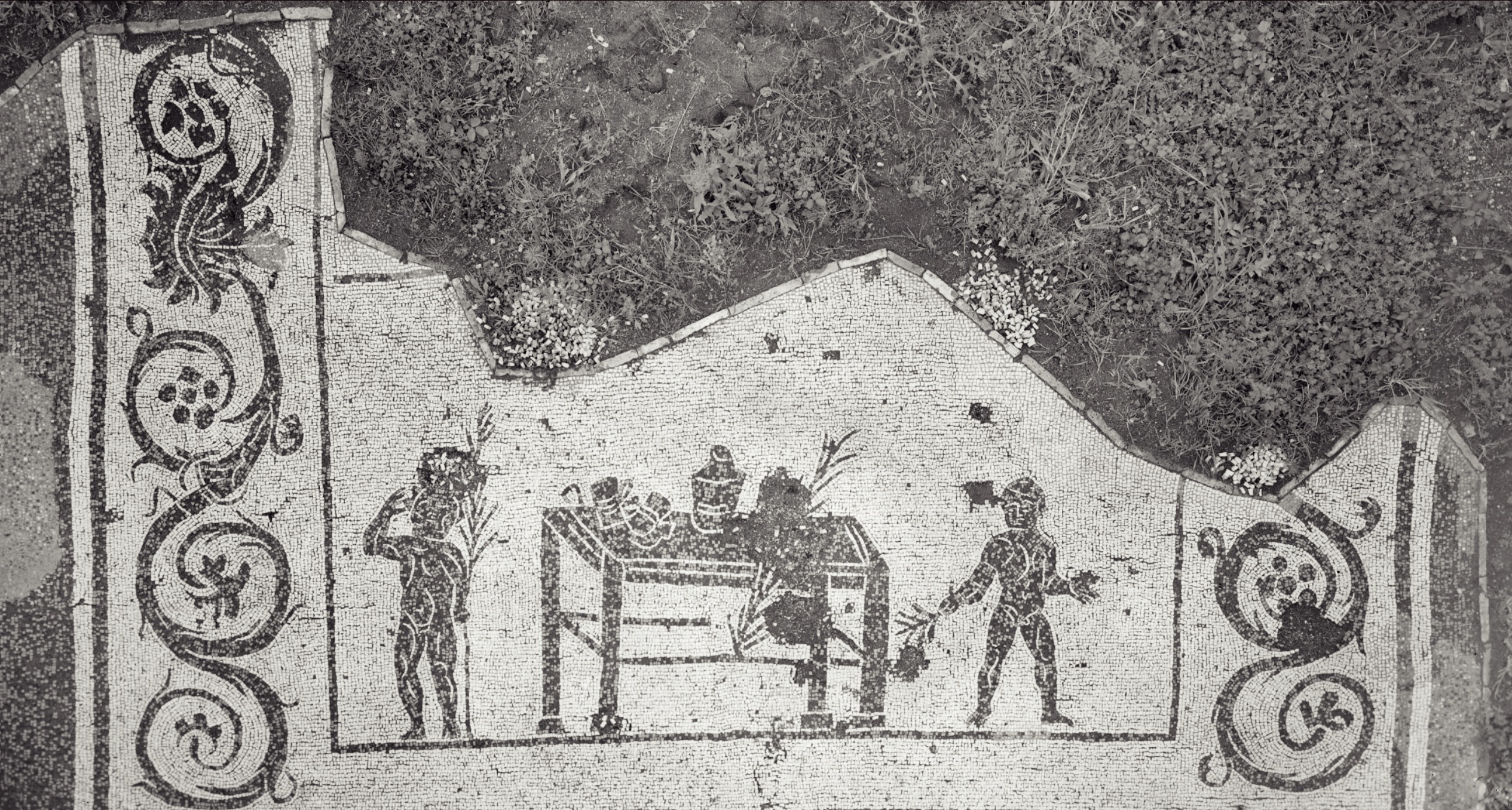 The bath complex, which has only been partially investigated, was built in around AD 130 during the Hadrianic period, in connection with the nearby Case a Giardino, constructed at the same time. The structure, with terraces descending towards the sea, was built on top of a stretch of the Republican walls, which were no longer in use. The baths had a frigidarium (room for cold baths) with marble basins and a marble floor (A); in the east sector were the warm rooms with mosaic floors depicting athletes (B), sea creatures and masks of the god Oceanus (C-D), and a heated natatio (pool) (E). The building underwent various transformations between the 3rd and 4th centuries AD; later, after its abandonment, lime kilns (F) were installed inside.