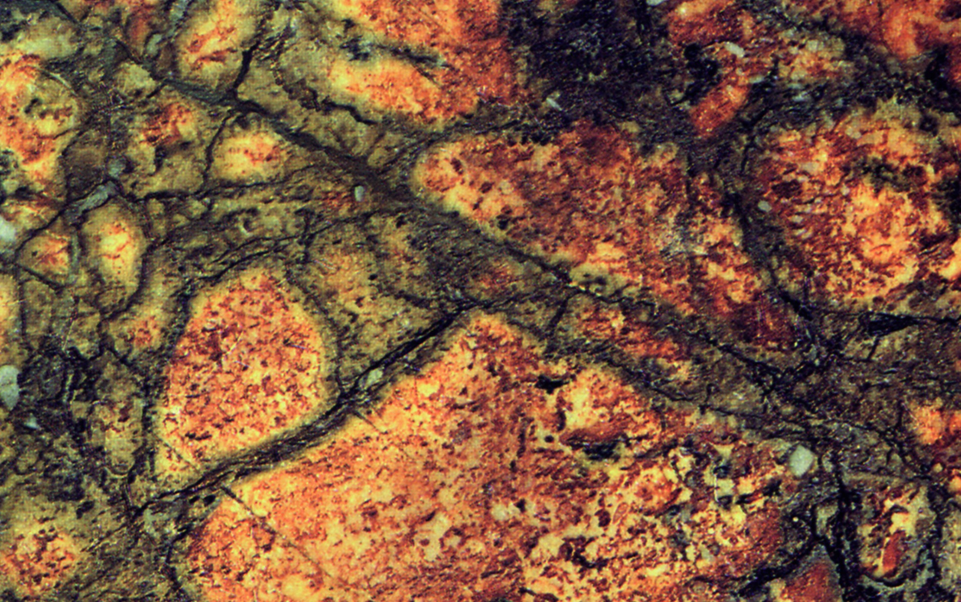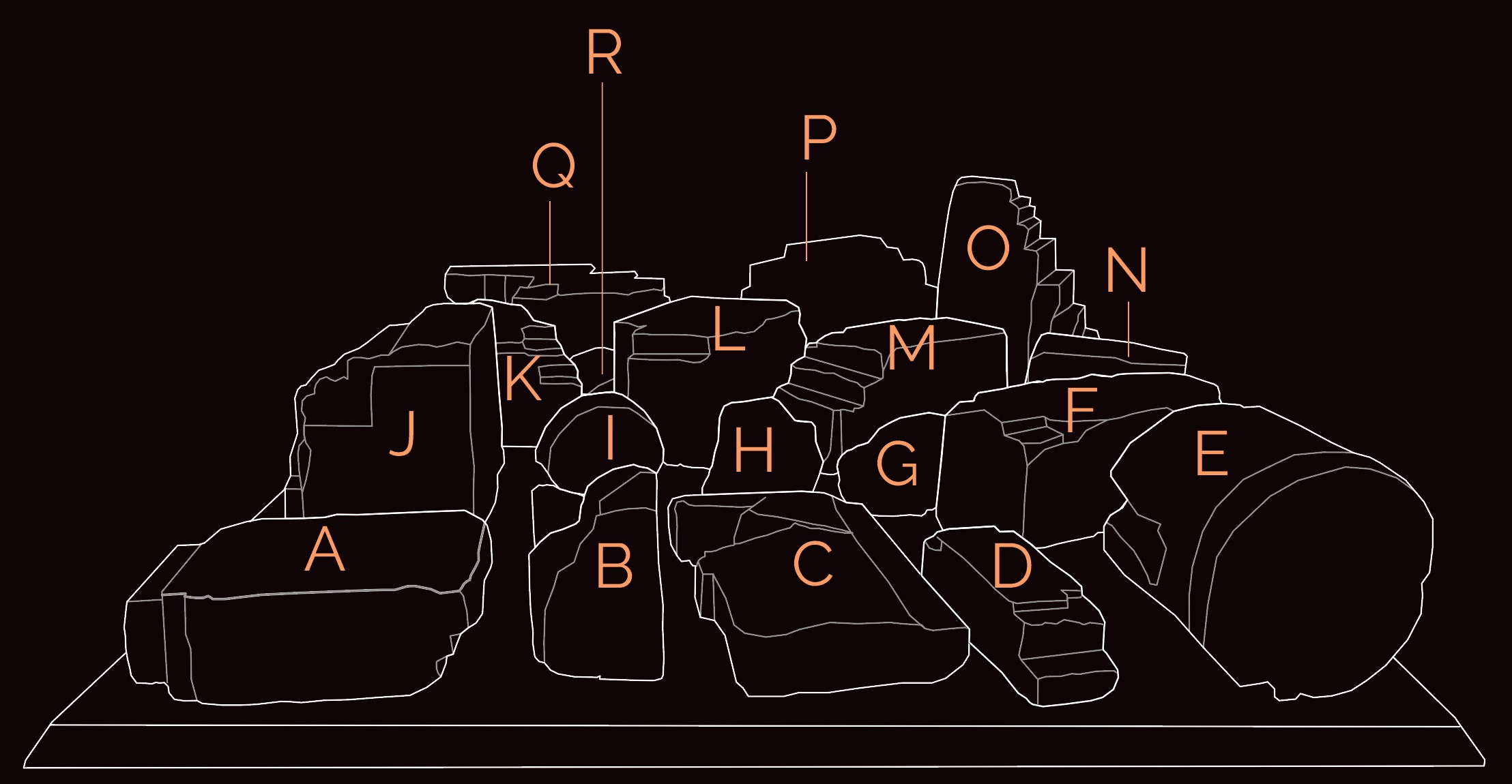 Lucullan marble was quarried at various sites in the vicinity of Teos in Asia Minor and was introduced to Rome during the 1st century BC. This is one of the coloured marbles most typical of Augustan architecture (late 1st century BC – early 1st century AD), but the two large thresholds of the Pantheon in Rome and of the Capitolium in Ostia show that it was still used in particularly important buildings during the Hadrianic period (first half of the 2nd century AD), when the quarries must already have been exhausted for some time. The stepped blocks (A-D, F, J-Q) were destined for the production of revetment panels, whilst the depressions for metal brackets on the large roughly carved column shaft (E) clearly document ancient repairs made to pieces damaged during extraction.