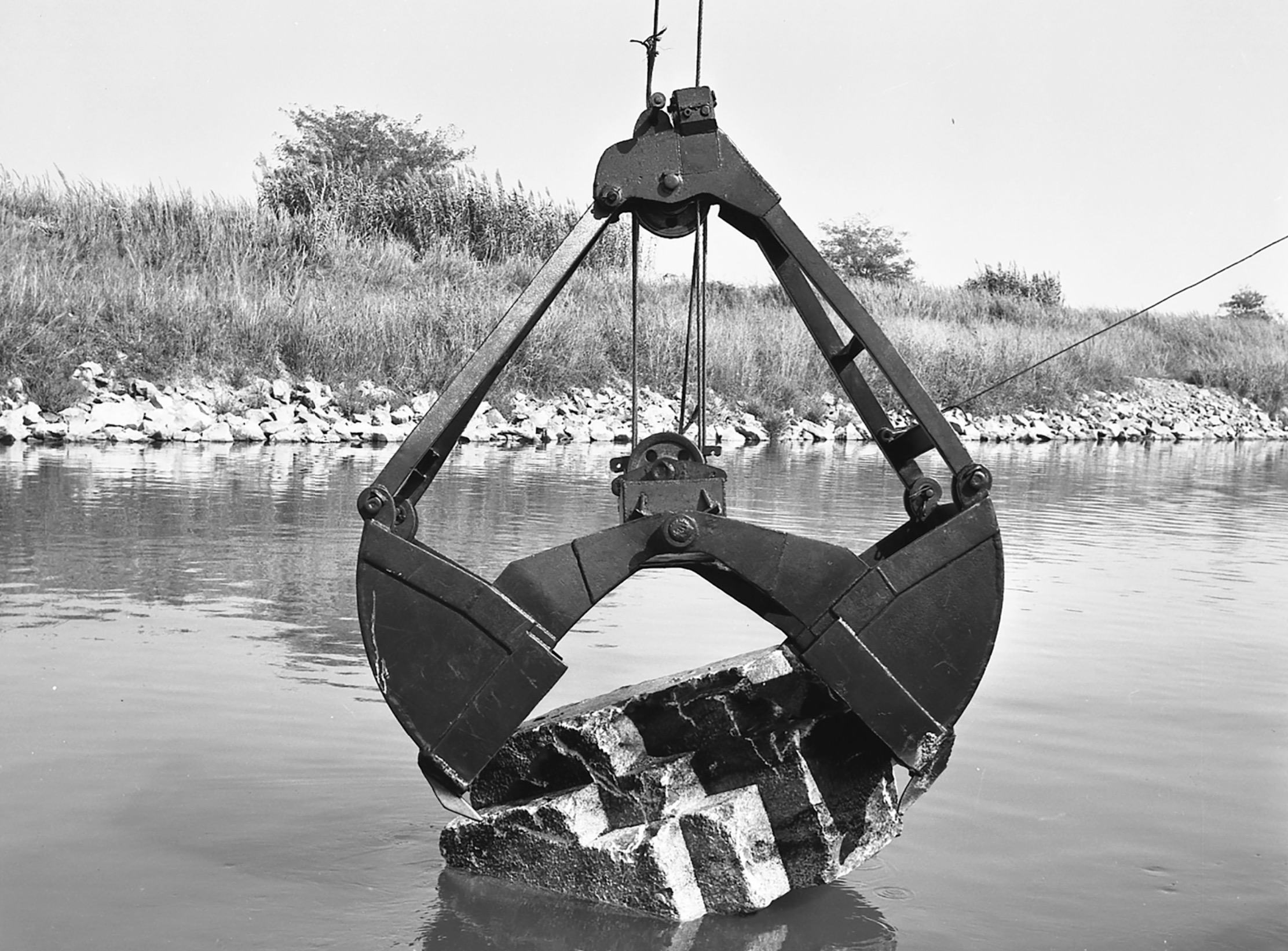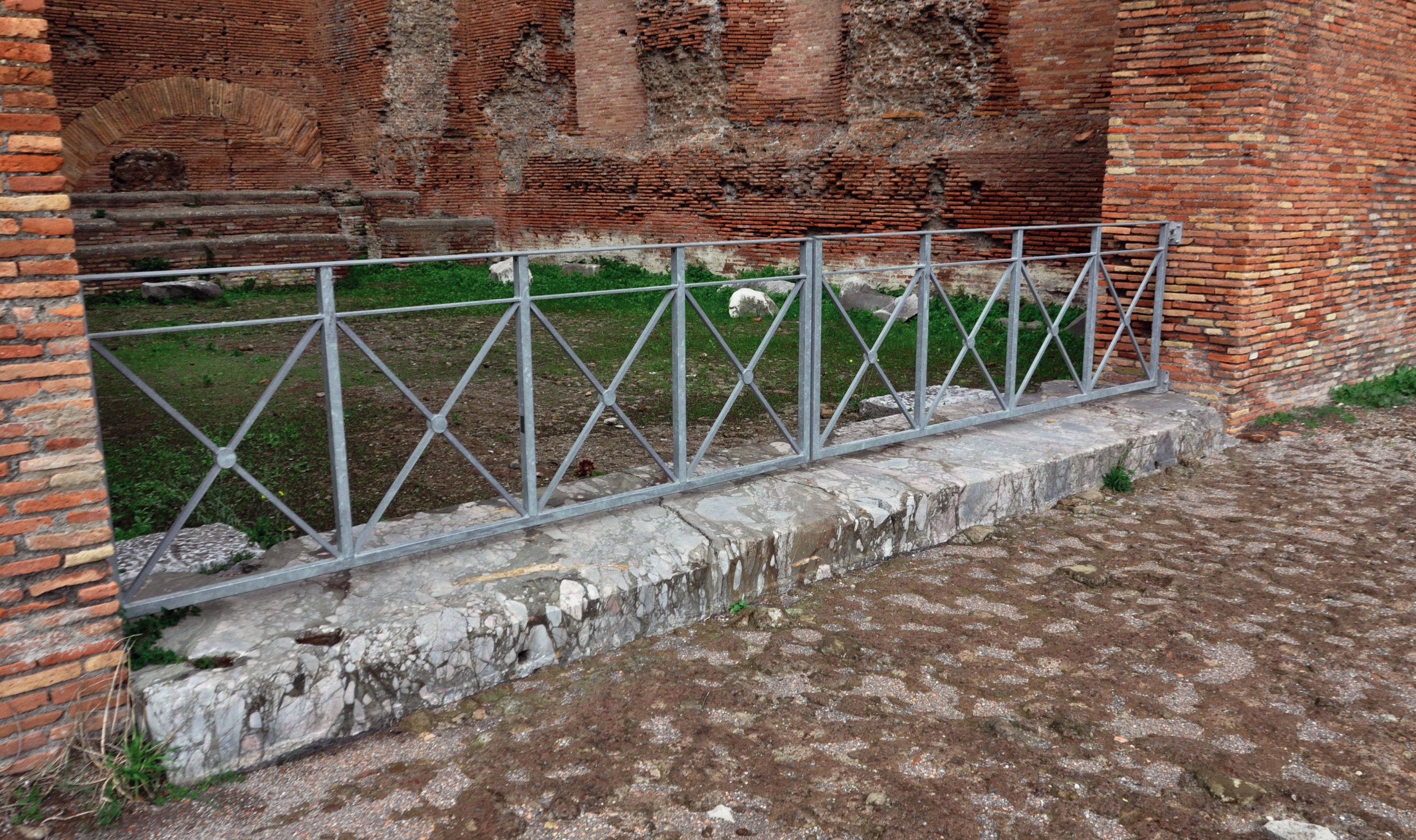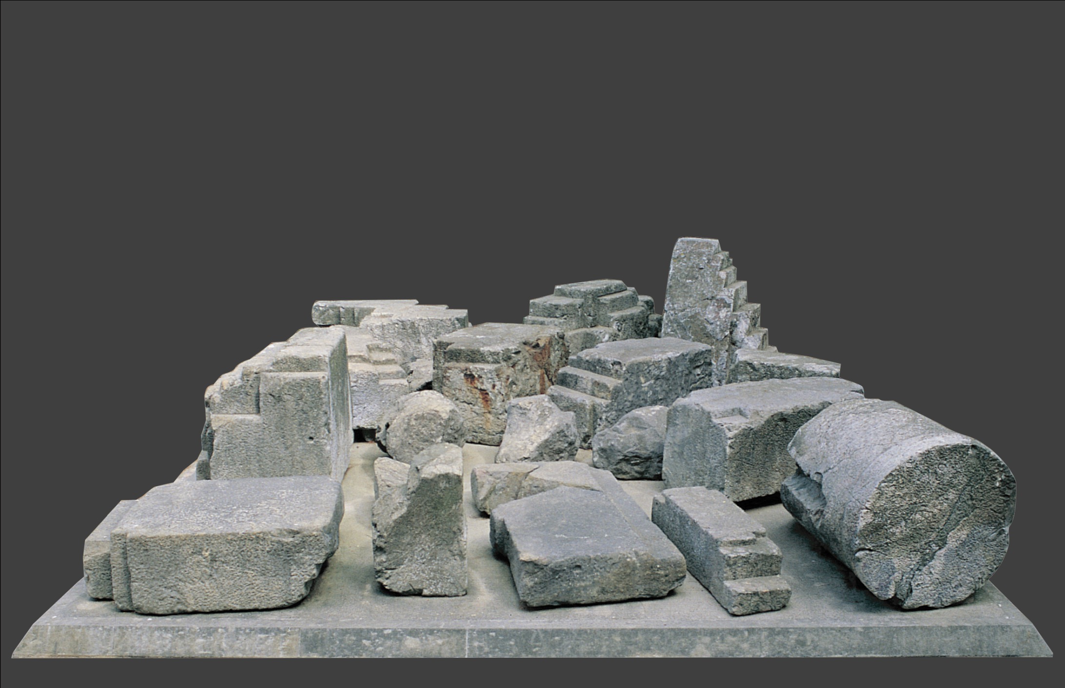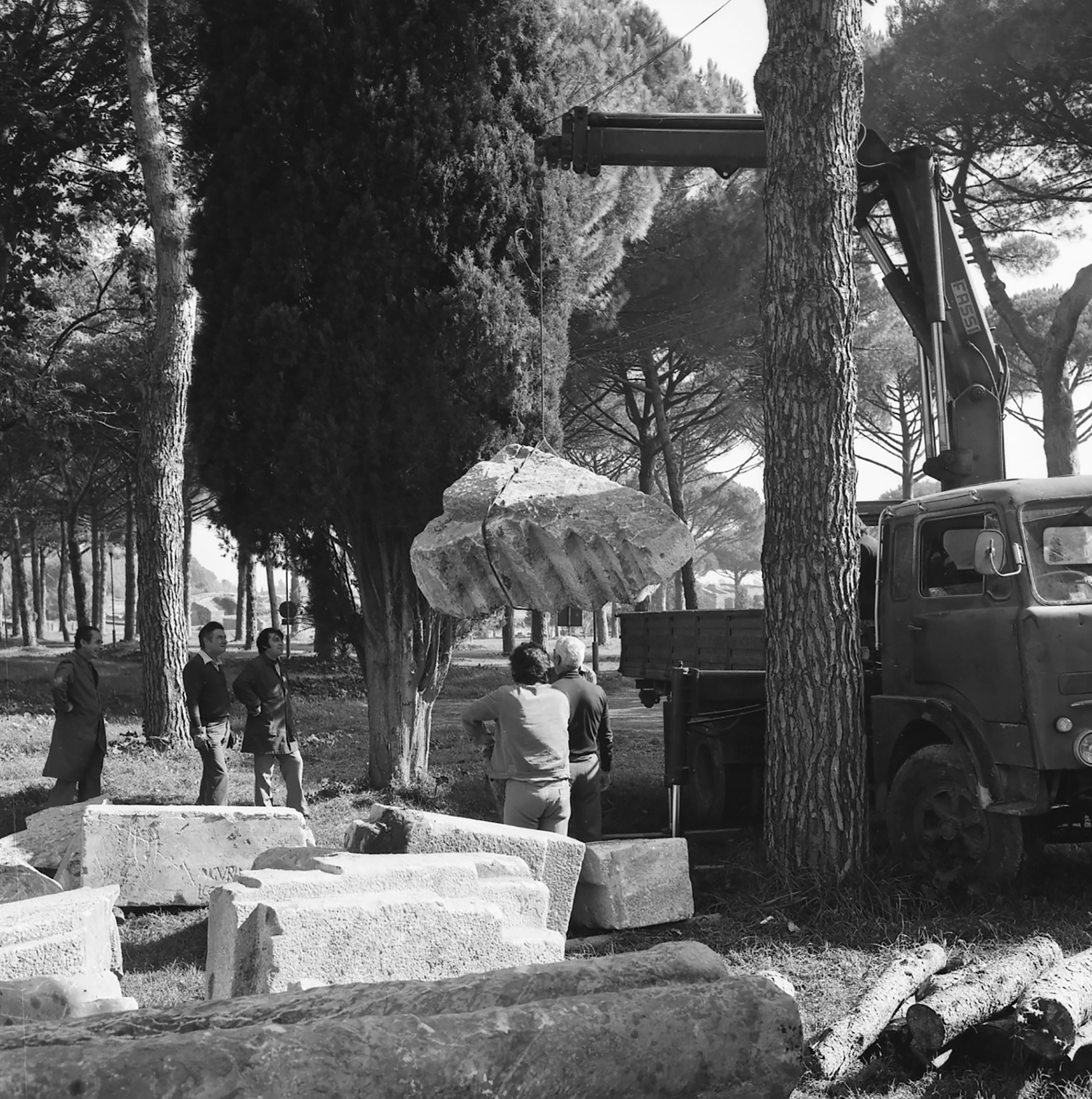 Positioning of a stepped block of africano marble in the gardens of the archaeological site of ancient Ostia in 1977