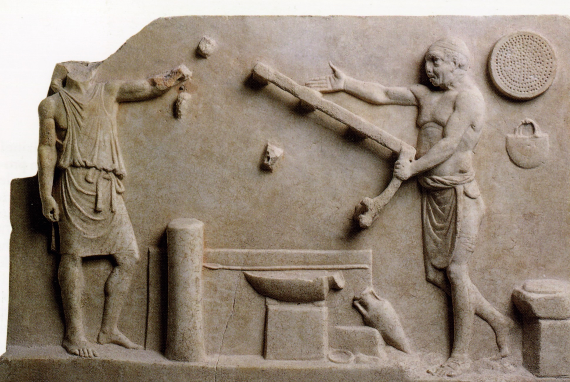 Rilievo della bottega di marmista con sega per tagliare le pietre in primo piano, dall’Isola Sacra