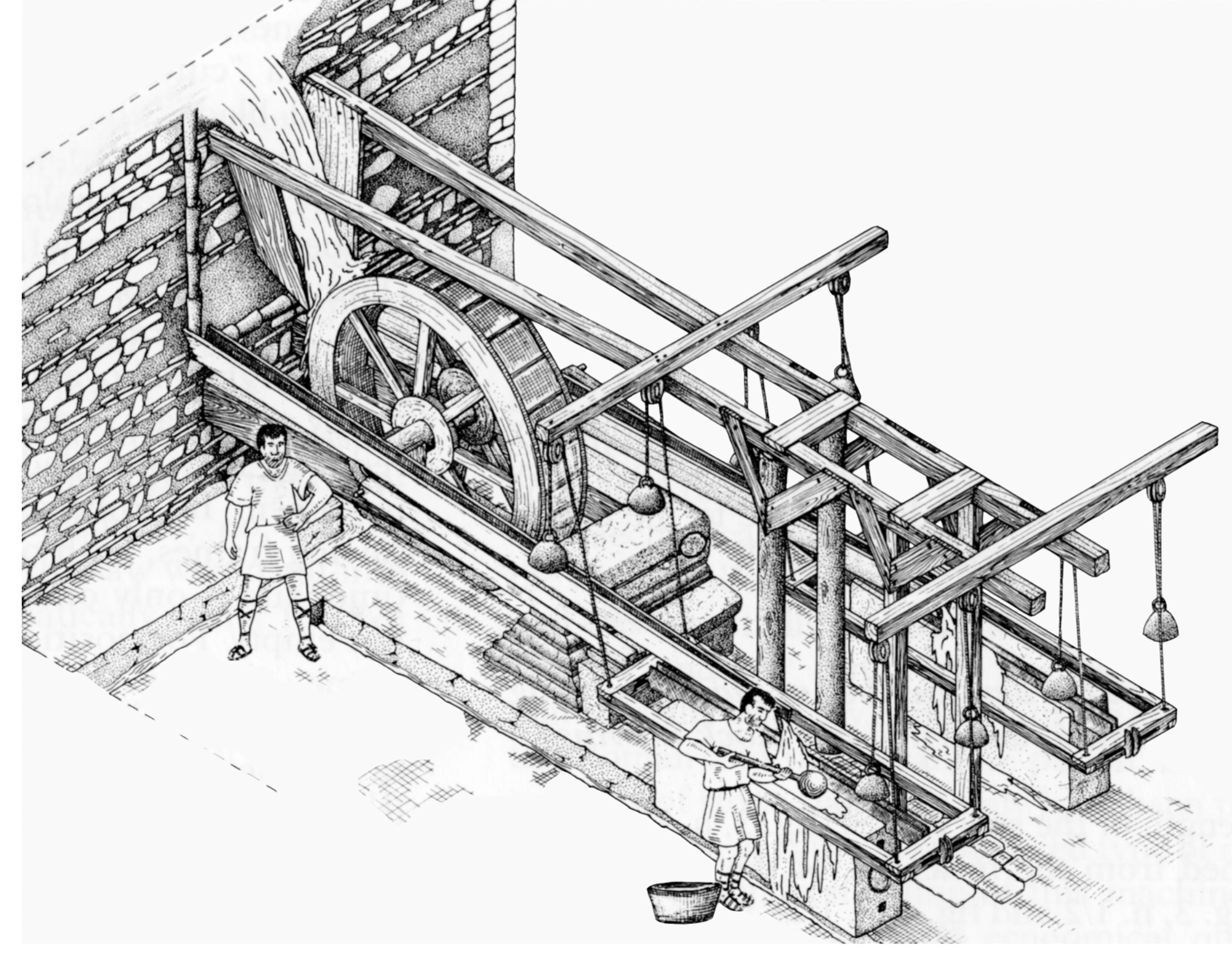 Ricostruzione della sega idraulica per tagliare marmi nella bottega dei marmisti nelle case a pendio a Efeso