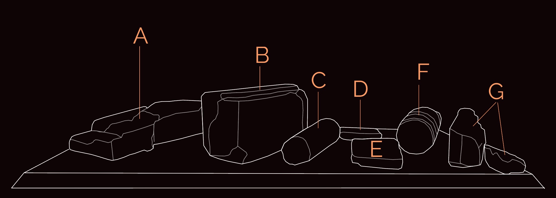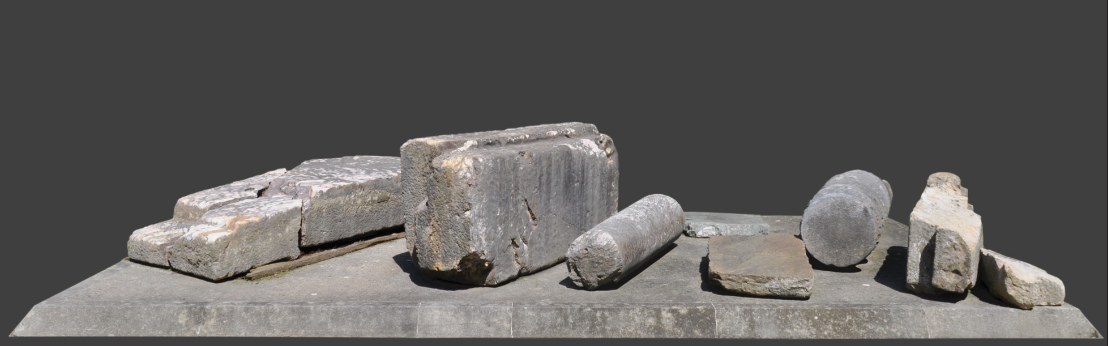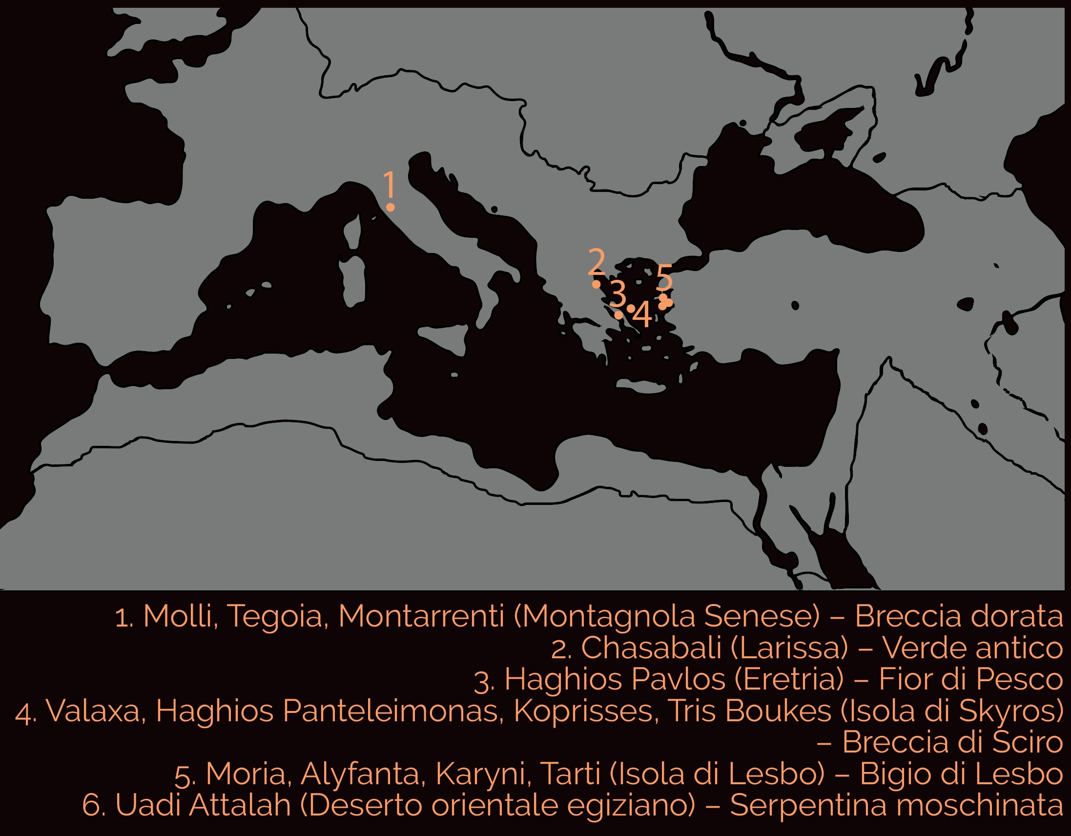 Sono qui esposti alcuni marmi rari e pregiati di origine italica, greca ed egiziana: un blocco in breccia dorata dalla Montagnola senese, due grandi blocchi in breccia di Sciro, provenienti dall’omonima isola, e un fusto di colonna in fior di pesco da Eretria, in Eubea. Il lastrone di verde antico di Tessaglia e quello in serpentina moschinata dallo Uadi Attalah in Egitto sono resti di segagione di lastre marmoree, mentre il fusto sbozzato in marmo bigio di Lesbo con anelli incisi testimonia una fase intermedia del processo di lavorazione.