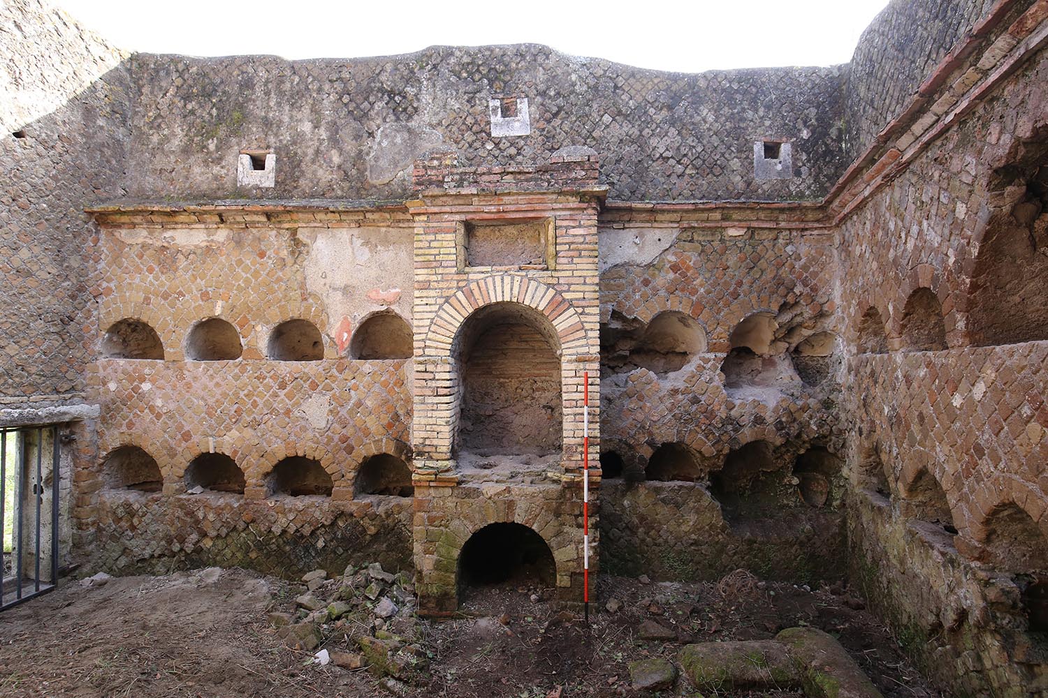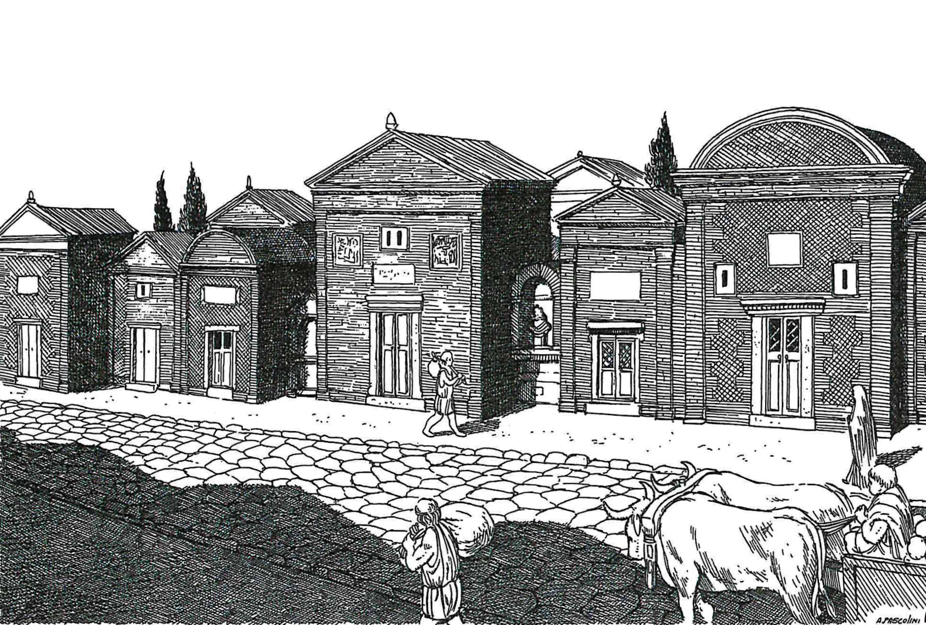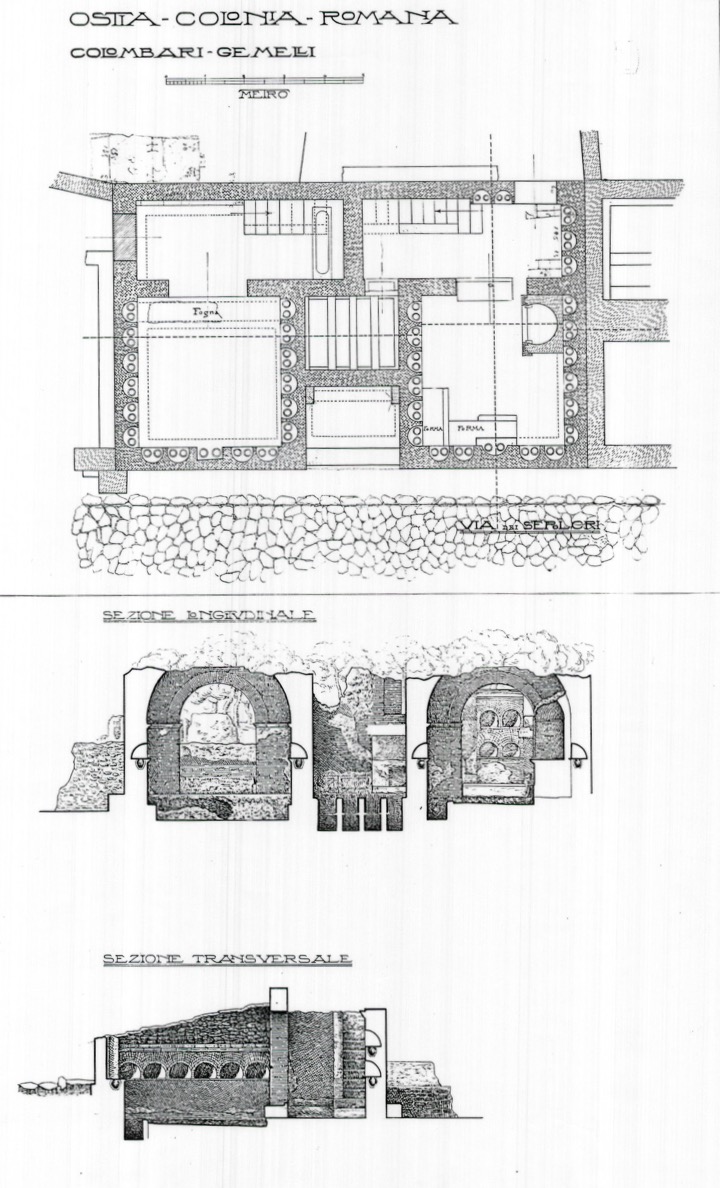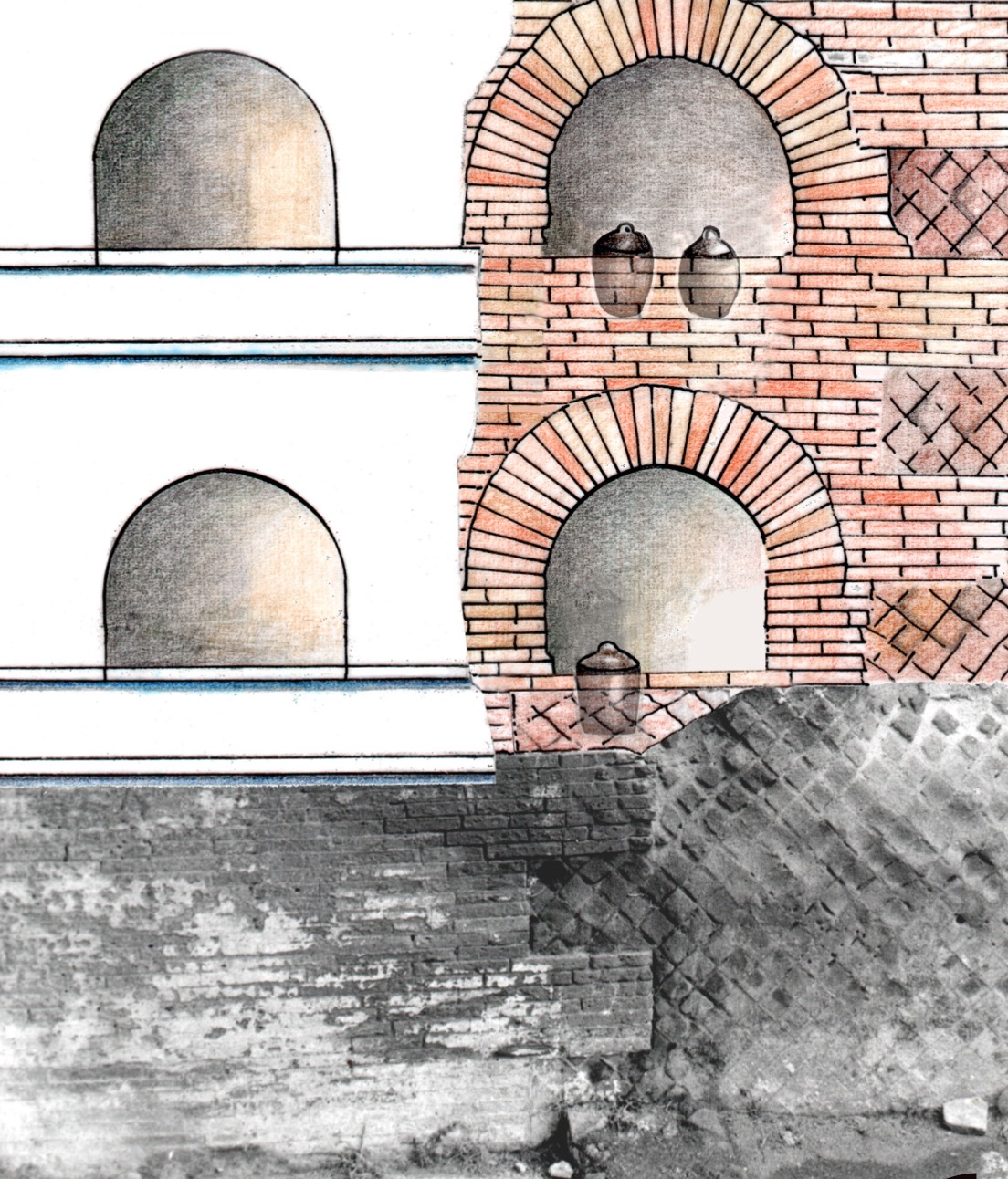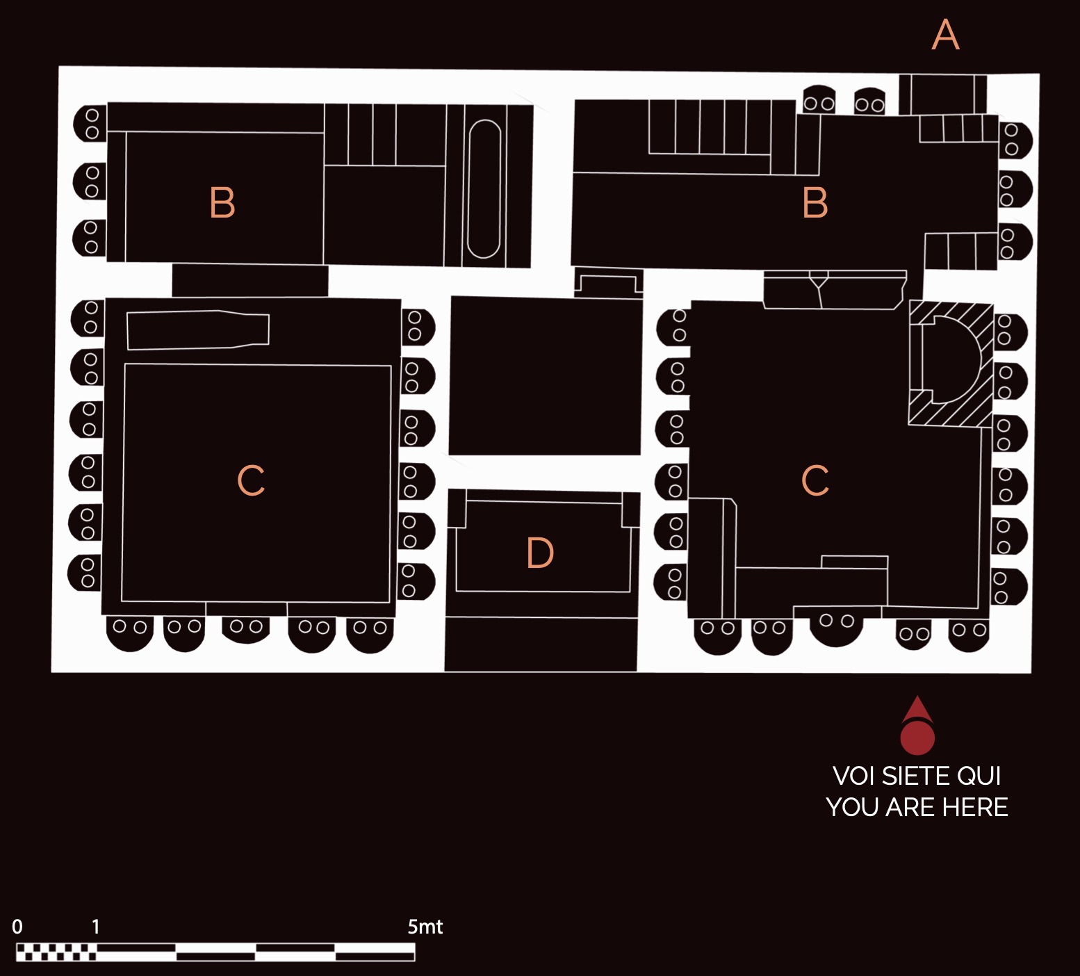 Costruite nella prima metà del I secolo d.C., queste due tombe indipendenti, originariamente con ingresso rivolto verso nord (A), presentano la medesima pianta. Entrambe erano caratterizzate da un vestibolo scoperto (B) e da una camera funeraria coperta (C), con nicchie per le urne cinerarie lungo le pareti. Sui tetti a terrazza, accessibili mediante scale, si potevano svolgere banchetti funerari. In uno spazio ricavato tra le due tombe era posto l’ustrinum (D), area in cui venivano cremati i corpi dei defunti; nel II secolo d.C., questo spazio fu occupato da una tomba a inumazione.