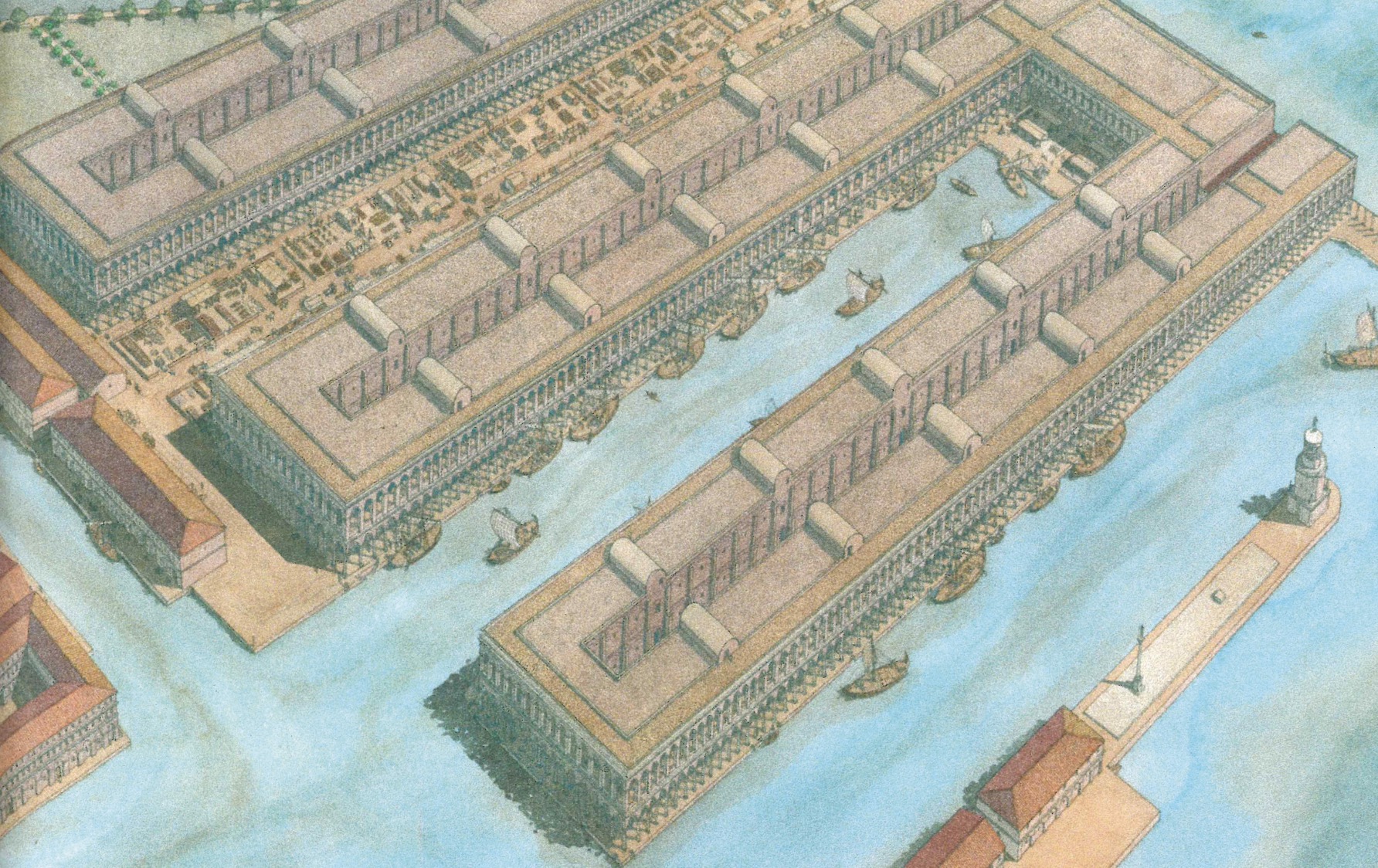 Con un’estensione superiore a 3,5 ettari, i Magazzini Traianei costituiscono il più grande complesso di stoccaggio dell’impero romano e presentano una planimetria estremamente innovativa, organizzata intorno a un asse centrale in parte monumentalizzato da una doppia fila di colonne in travertino di stile bugnato rustico, noto come Strada Colonnata. Il complesso è formato da quattro corpi di fabbrica distinti: il primo costituisce la facciata marittima dell'edificio e corre dietro l'imponente colonnato del Portico di Claudio, gli altri tre si articolano perpendicolarmente ad esso. Le celle dei magazzini, previste in numero di 400 nel progetto iniziale, avevano un volume di stoccaggio pari a circa 400 m3 ciascuna.