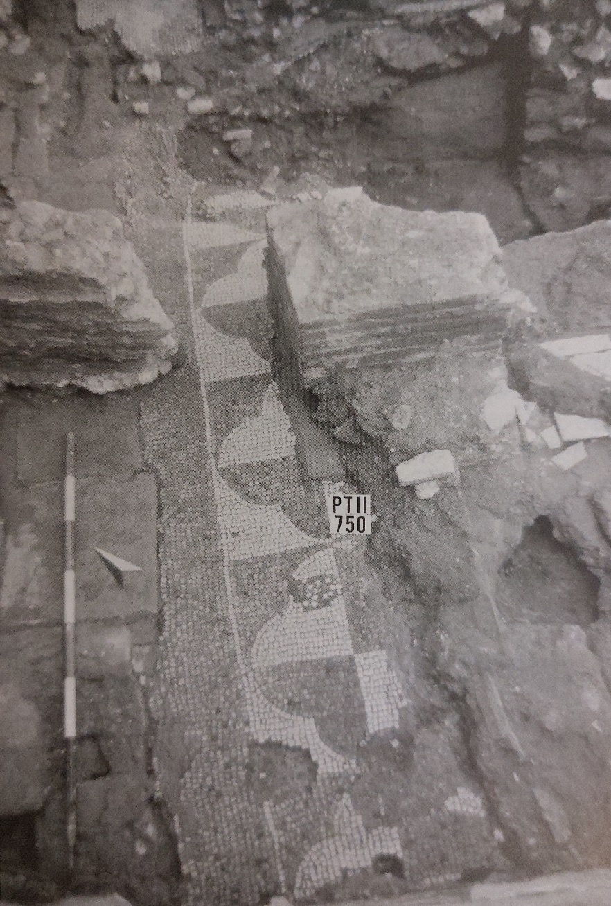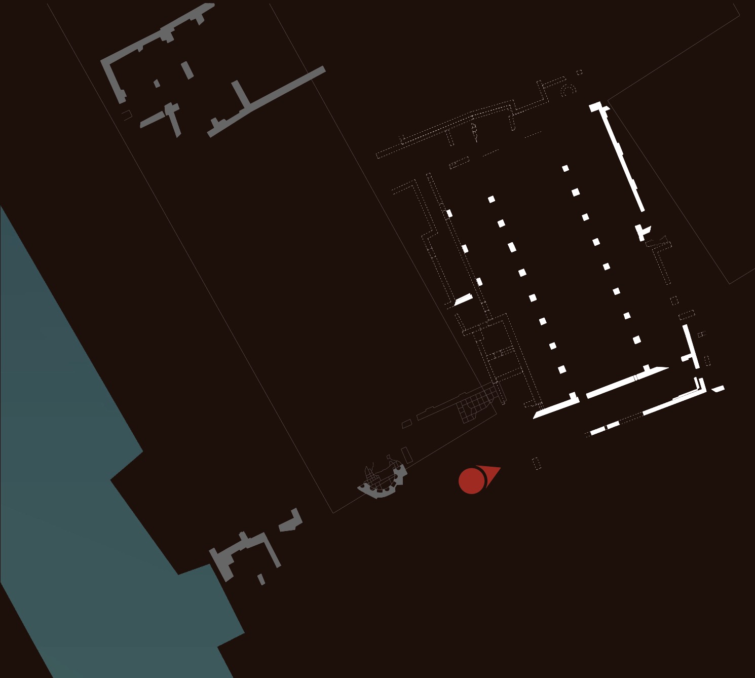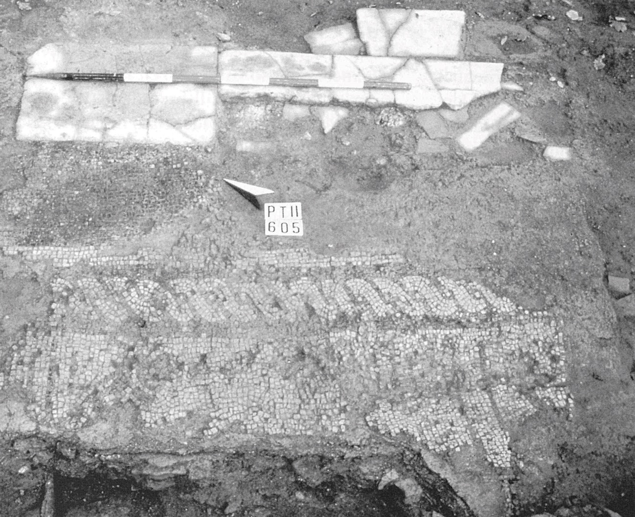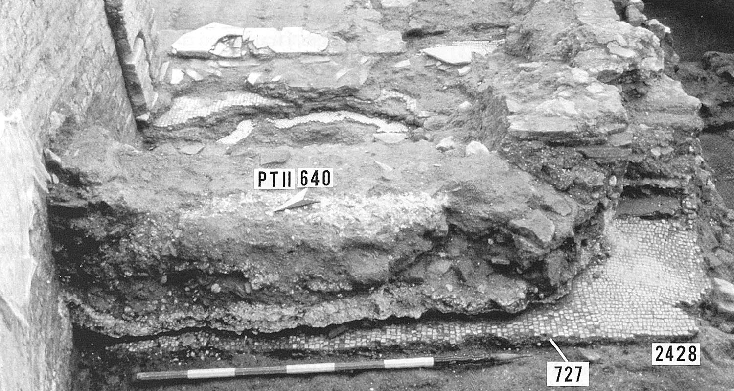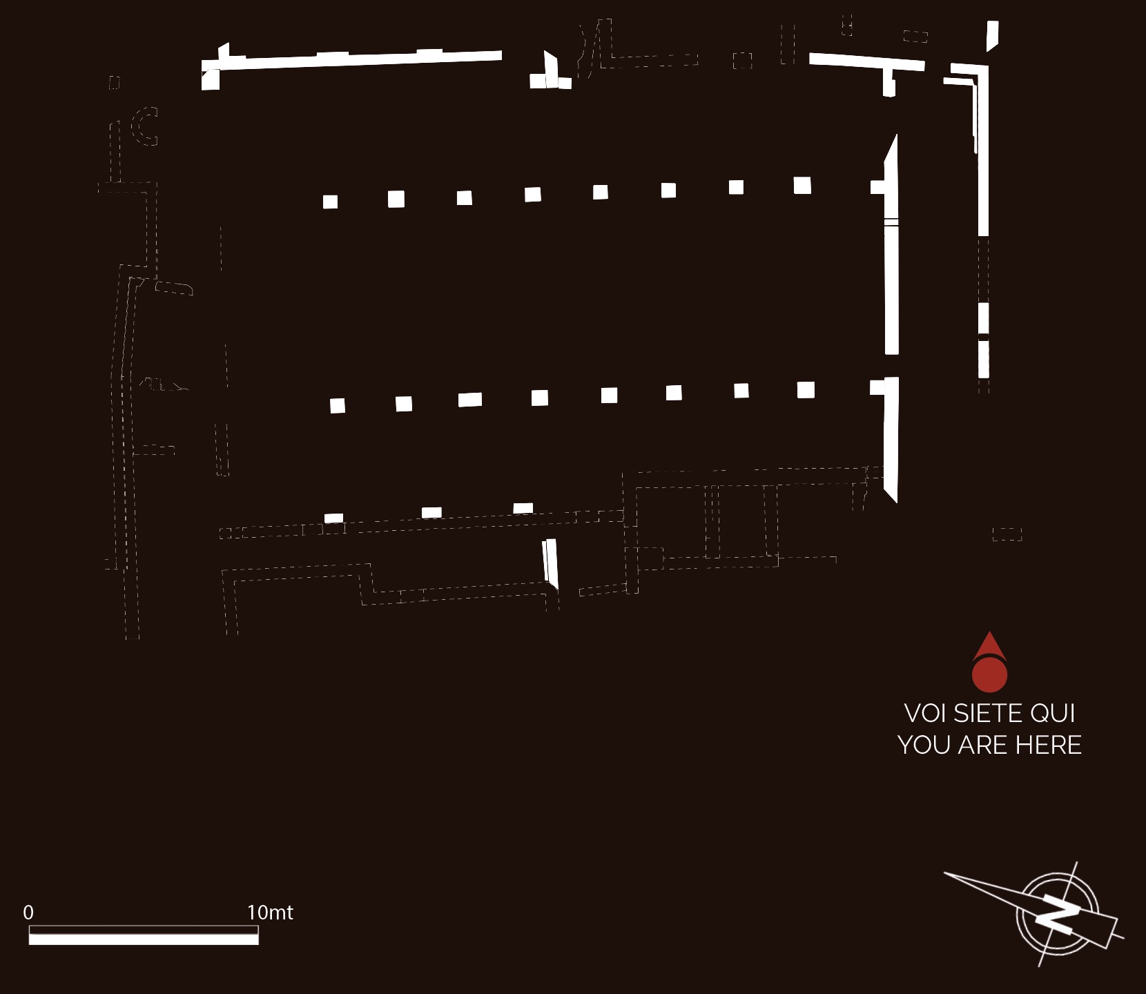 La basilica paleocristiana sorge in un settore della città densamente edificato, racchiuso tra il bacino esagonale, il canale trasverso, la via Portuense e la Fossa Traiana. La sua costruzione è l’ultimo stadio di un graduale processo di trasformazione di complessi preesistenti, costruiti dalla metà del I secolo d.C. Nel corso del IV secolo d.C. viene realizzato dapprima un edificio di tipo residenziale con pavimenti in mosaico e opus sectile, che poi viene ulteriormente trasformato con la costruzione di un’ampia aula pavimentata a mosaico, già in questa fase destinata probabilmente al culto cristiano, suddivisa in tre navate da due file di otto colonne.