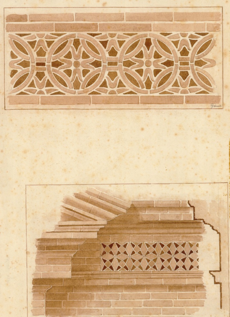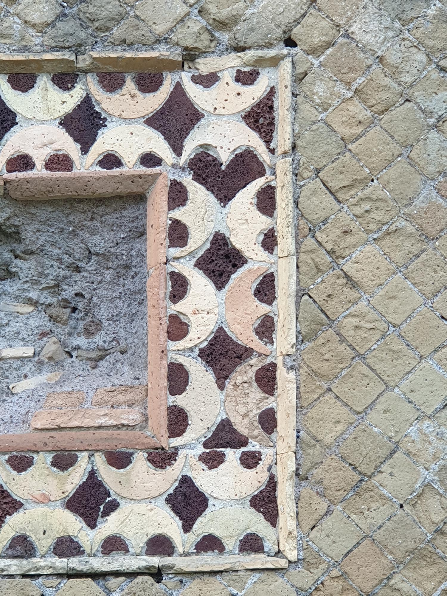 Dettaglio di decorazioni in laterizio, pomice e tufo dalla necropoli della Via Ostiense