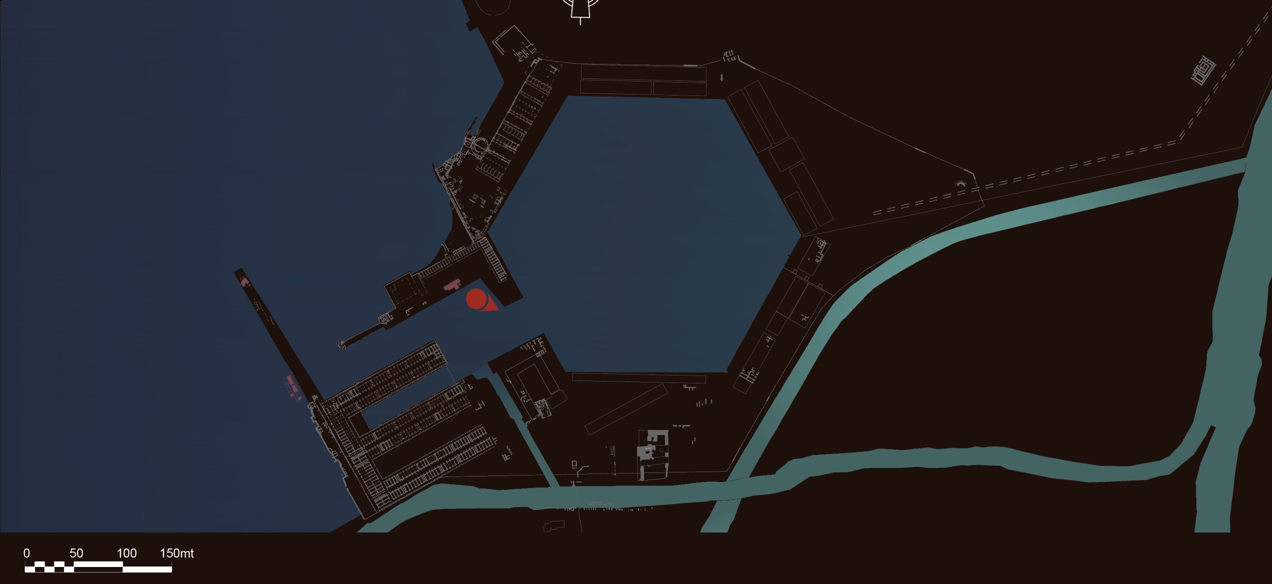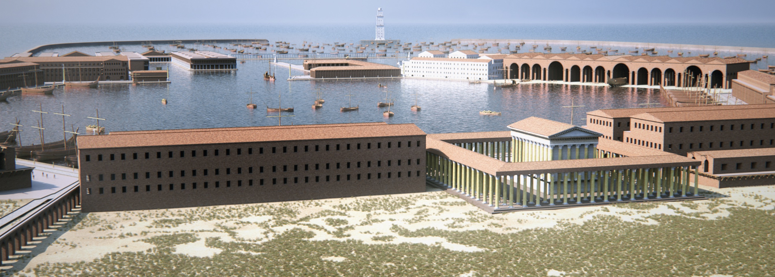 Costruito probabilmente tra il 110 e il 117 d.C. dall’imperatore Traiano al fine di rendere più sicuro l’approdo delle navi e al contempo di incrementare l’attività del porto, il bacino esagonale, progettato forse da Apollodoro di Damasco, fu scavato nella terraferma a est del preesistente porto di Claudio. L’ampliamento delle strutture portuali comportò lo scavo del Canale Romano, che collegava la c.d. Fossa Traiana, di età claudia, e il Tevere. L’invaso ha un’estensione di 32 ettari, ciascun lato dell’esagono è lungo 358 metri. Il fondo del bacino era pavimentato e le sponde costruite a “scarpa”, in modo da attenuare il moto ondoso. Nelle banchine erano ammorsati grandi blocchi forati di travertino che servivano all’attracco delle navi.