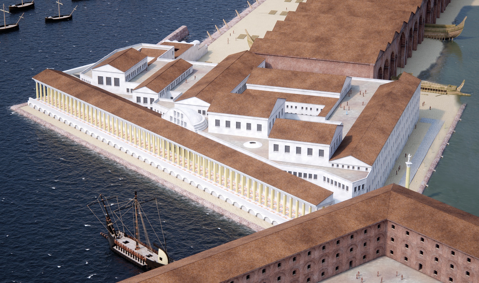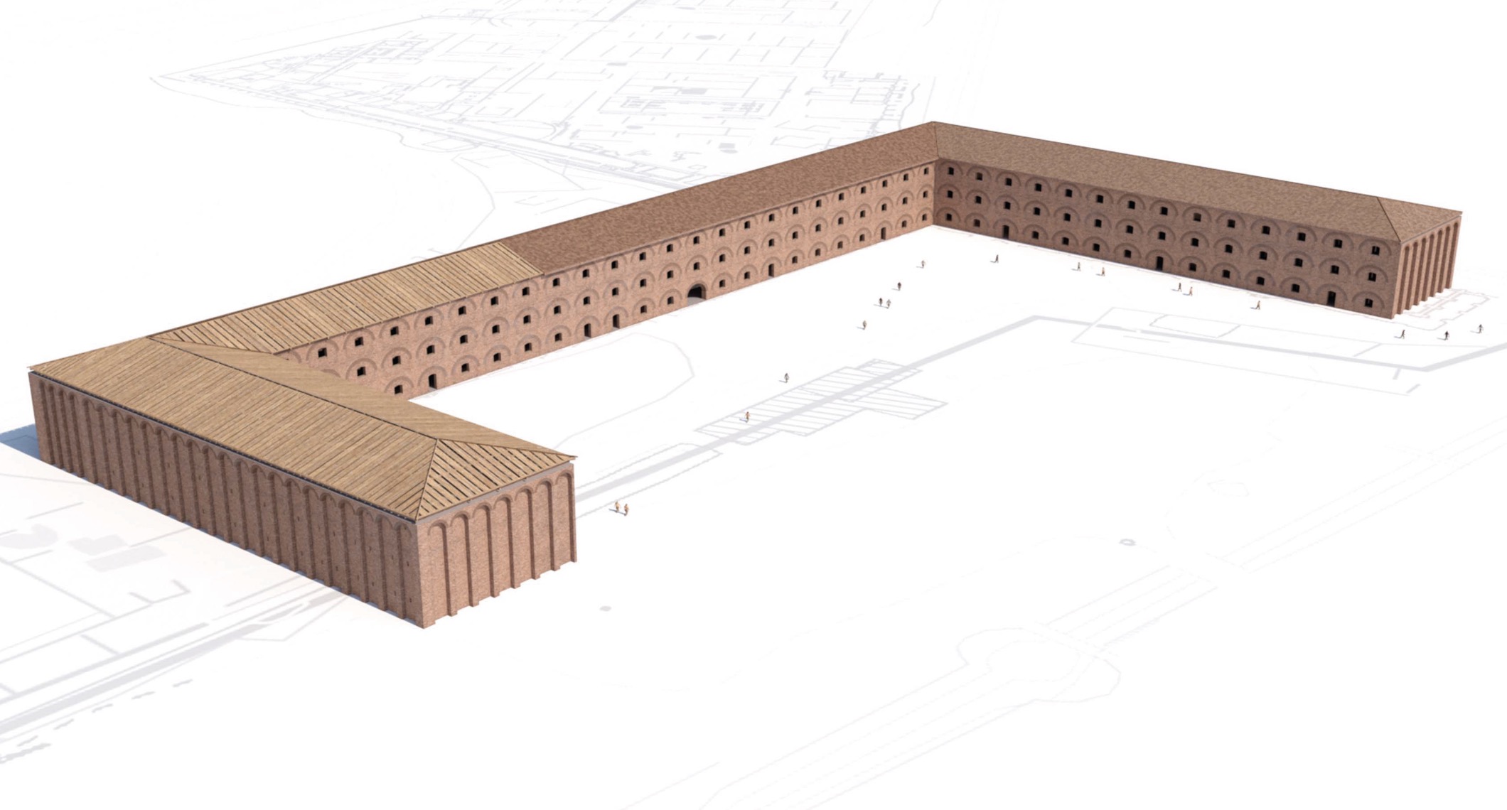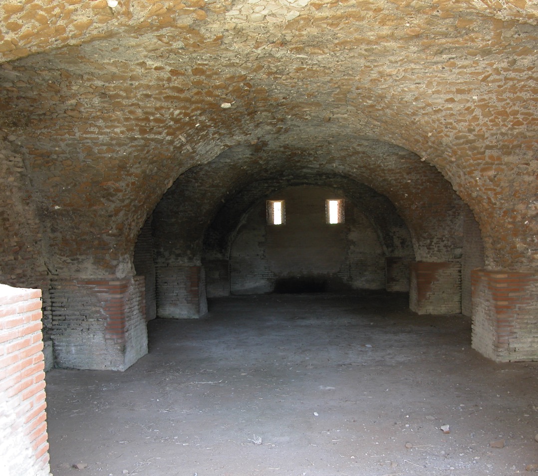 Il complesso presenta probabilmente una pianta a C, con i due bracci corti orientati in senso nord-sud e il braccio lungo in senso est-ovest. Il braccio corto orientale è parallelo e adiacente al bacino di Traiano, il secondo lato corto non è più visibile. Il complesso si articolava su tre piani. Sul braccio lungo al piano terra, su un corridoio largo 4,50 metri coperto da volte a crociera, si aprono ambienti a pianta quadrangolare, modulari, coperti da volte a crociera in muratura, con ingressi caratterizzati da stipiti e archi in laterizi. Sul lato breve gli ambienti affacciati sul corridoio sono lunghi e stretti, alternati a rampe per salire al piano superiore. I Magazzini Severiani sono in stretta connessione con il complesso del Palazzo Imperiale, collegato a essi attraverso un passaggio voltato.