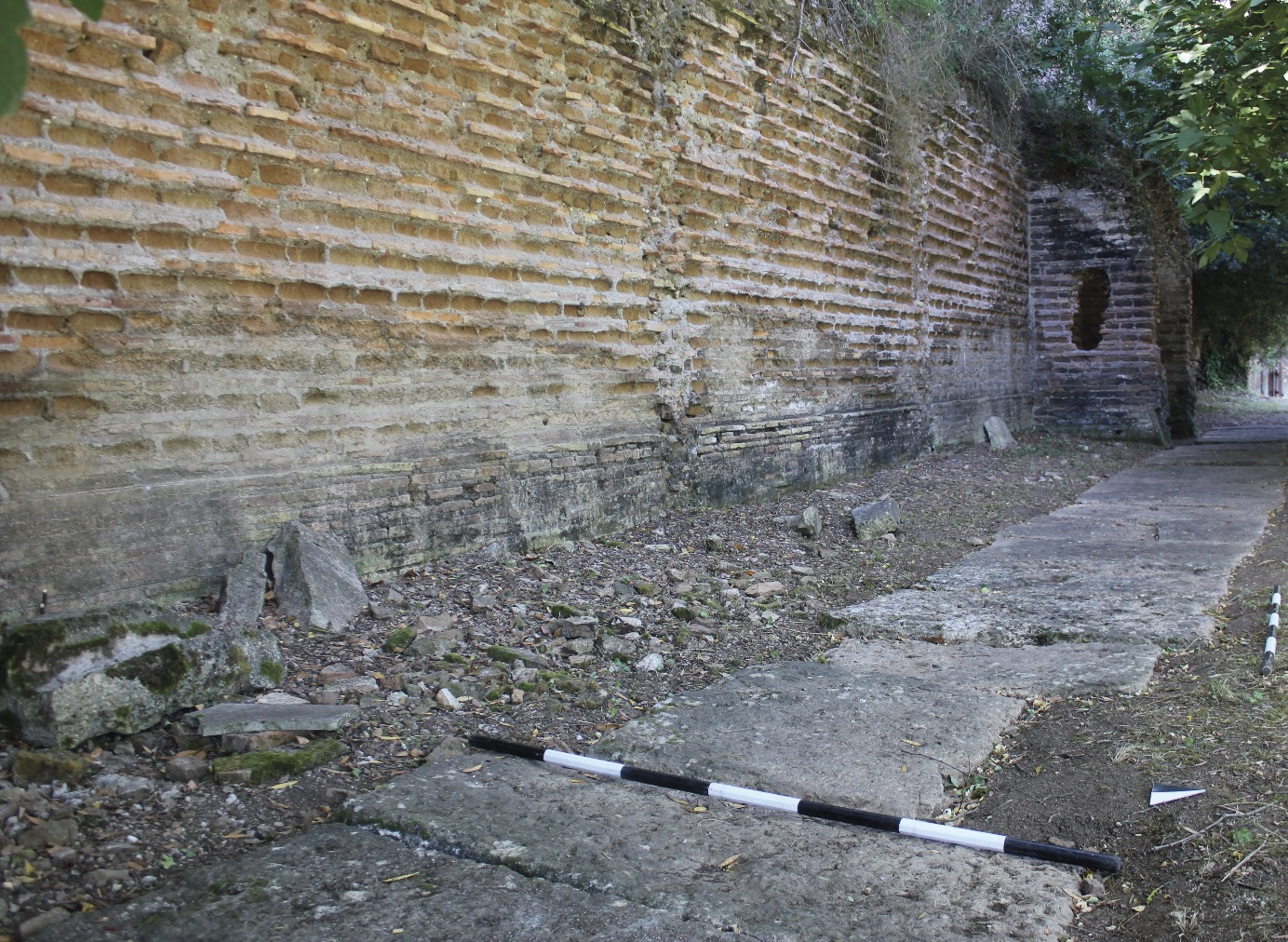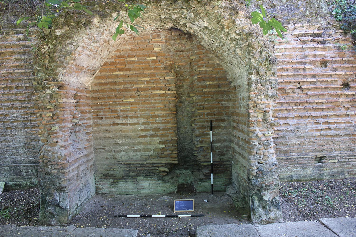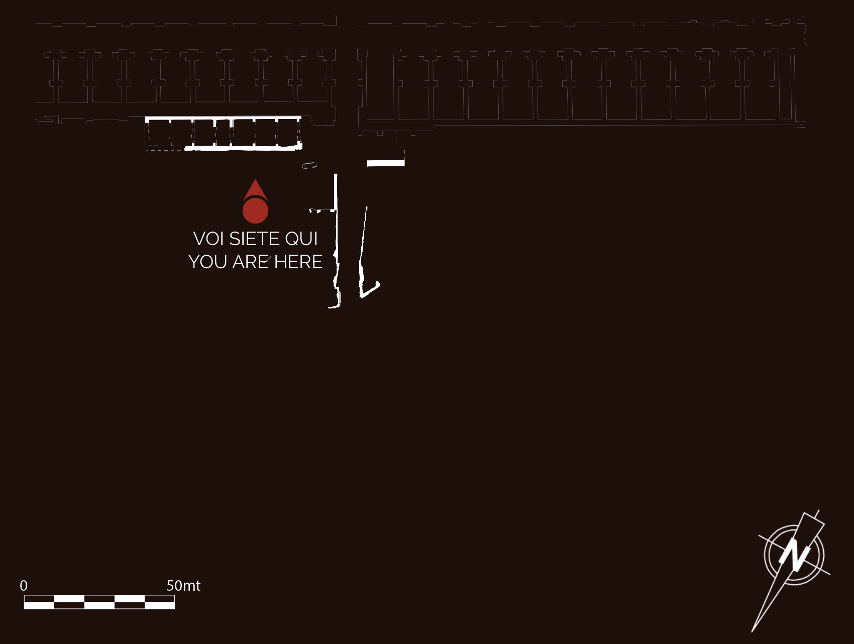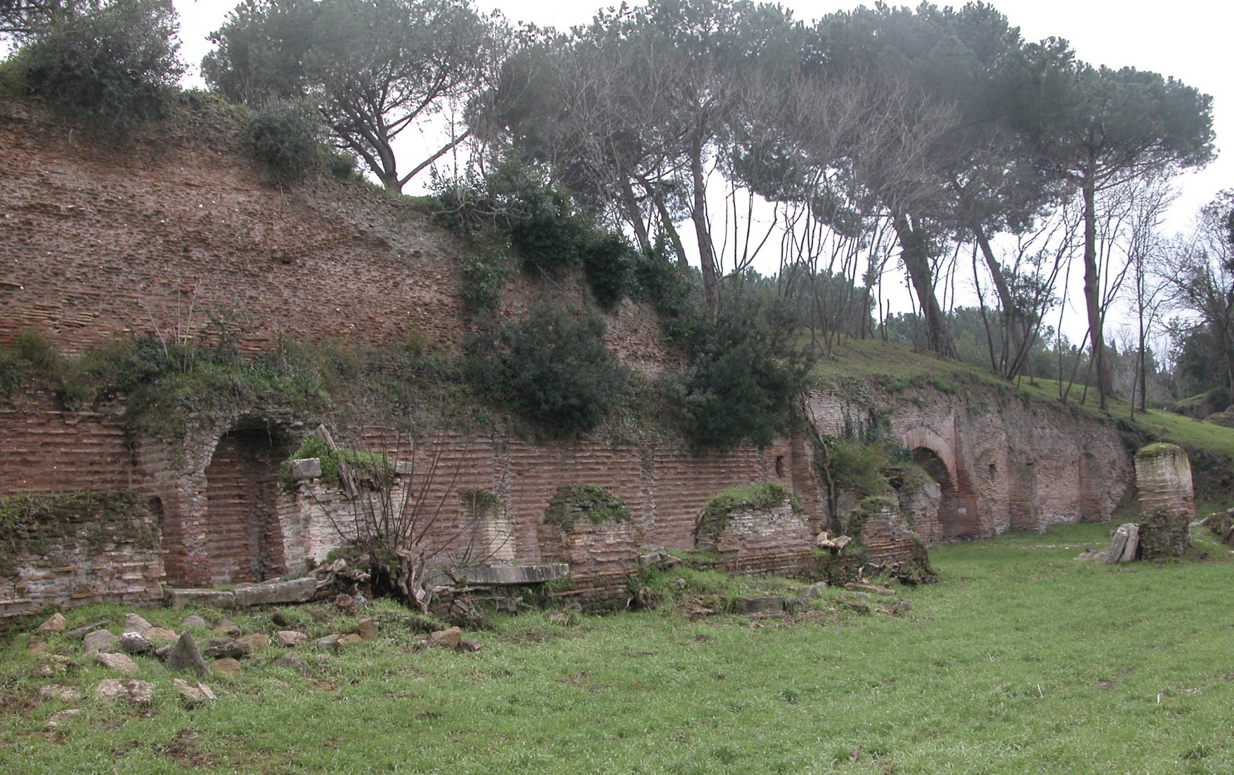 Alle spalle dei Magazzini Severiani, addossate alla parete di fondo e affacciate sul bacino di Claudio, in età tardoantica si installarono su una piccola spiaggia interna varie strutture, tra cui un edificio realizzato nella tecnica muraria definita opera vittata mista, caratterizzata dall’alternarsi di un filare di blocchetti rettangolari di tufo e di un filare di laterizi. Dell’edificio si conservano sette tabernae disposte in fila, identificate dalle tipiche soglie, e i resti di un portico antistante di cui rimane solo il primo pilastro. Al di sotto di questo impianto una fognatura più antica, coperta da blocchi di travertino, correva in direzione est-ovest dal bacino di Traiano parallela al braccio lungo dei Magazzini Severiani.