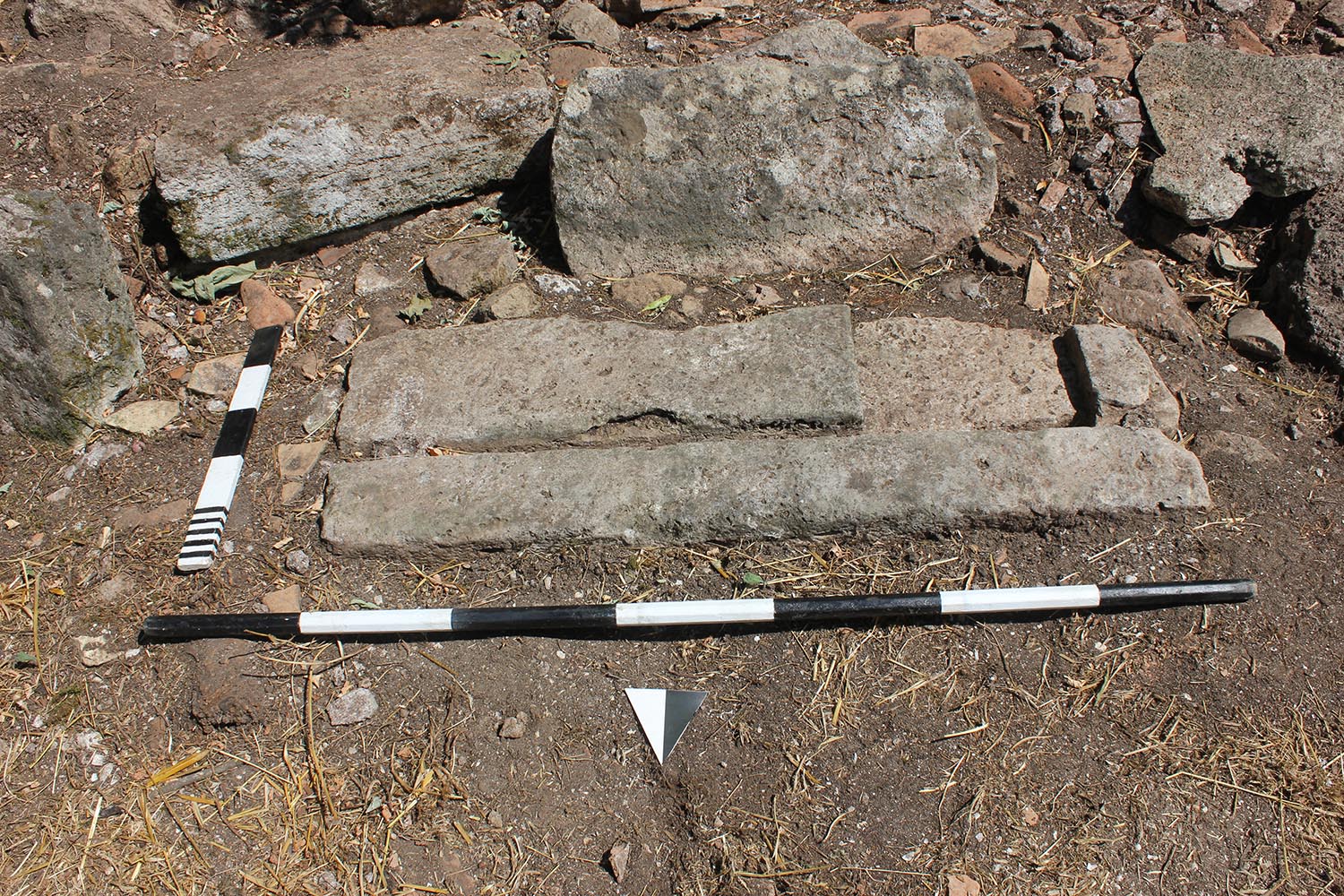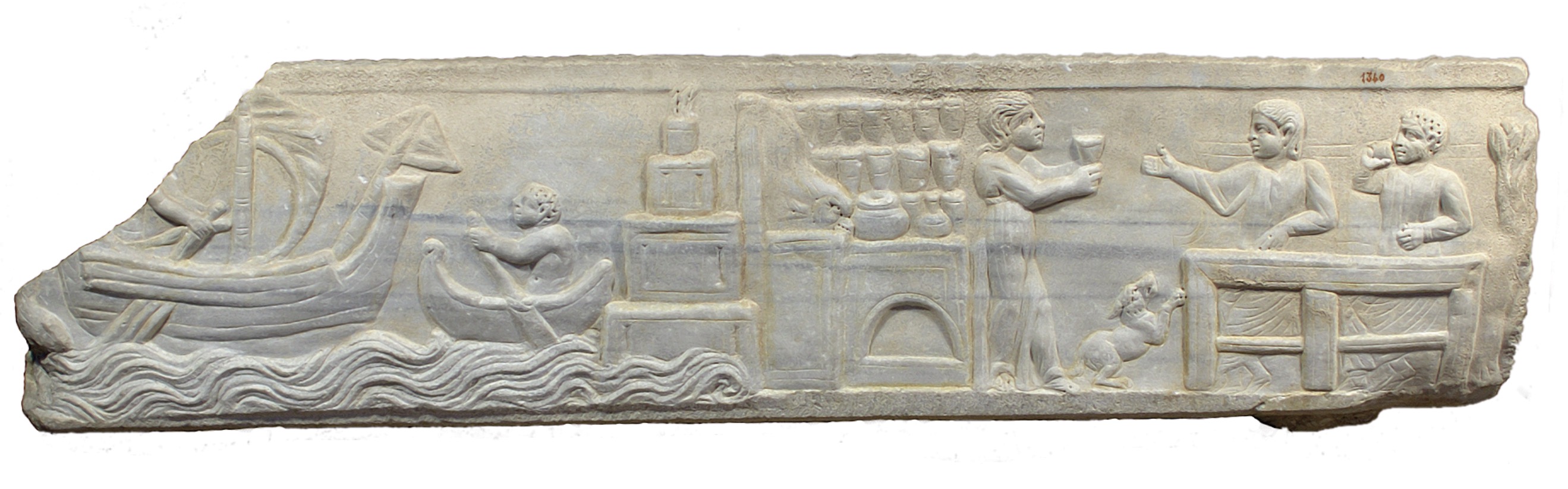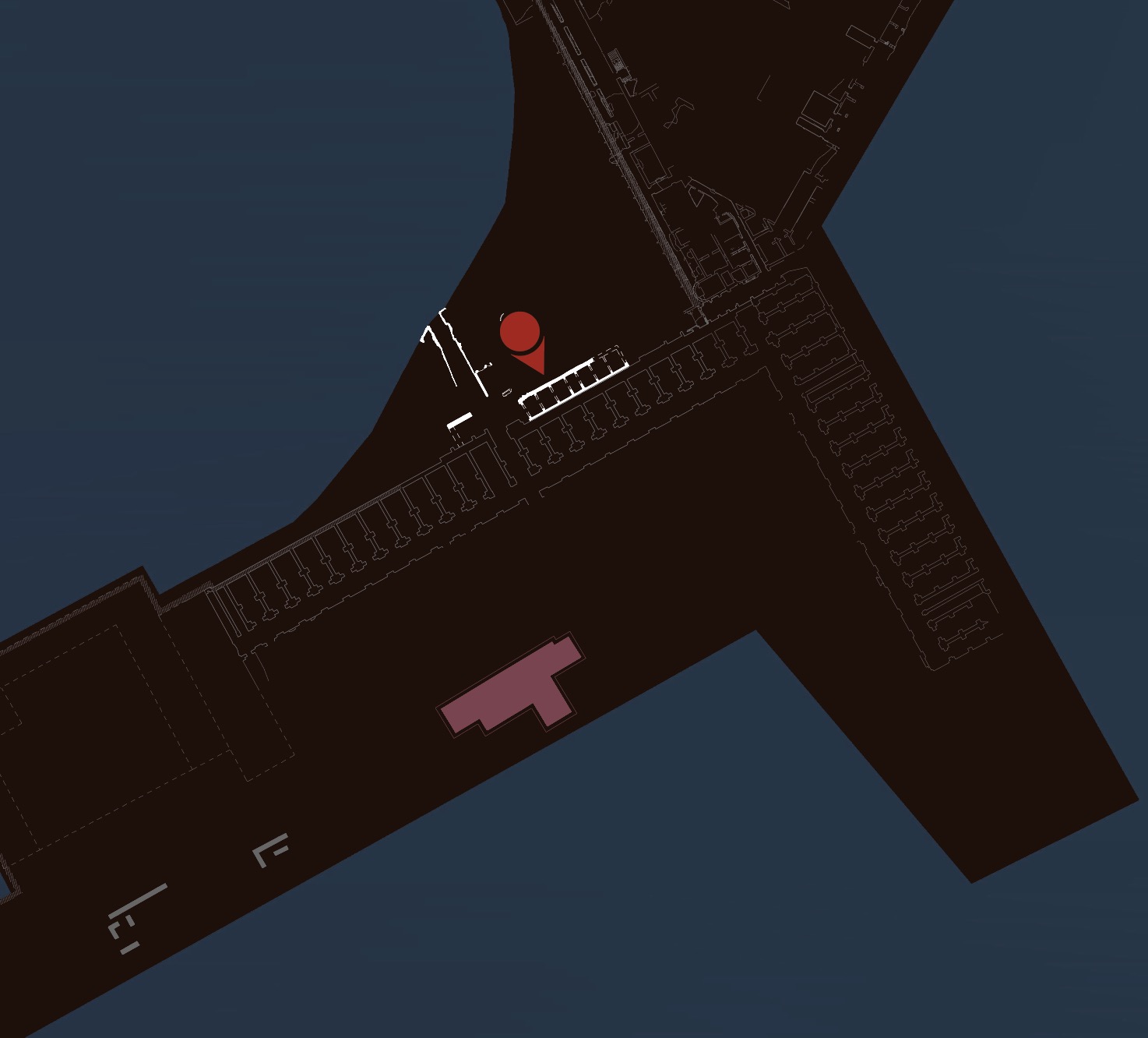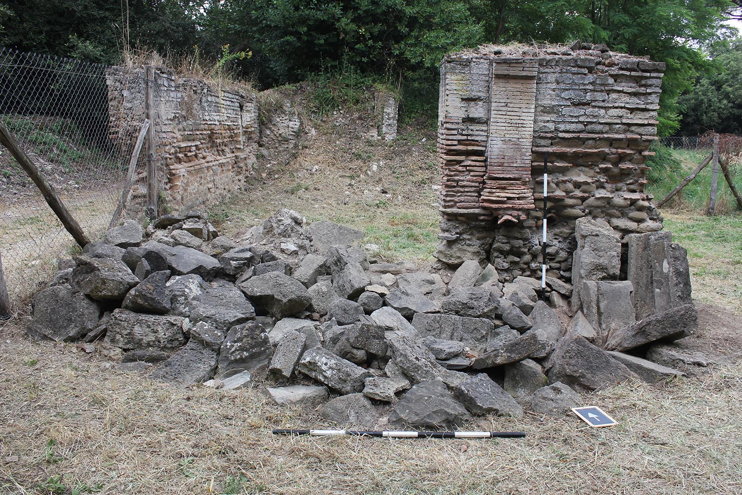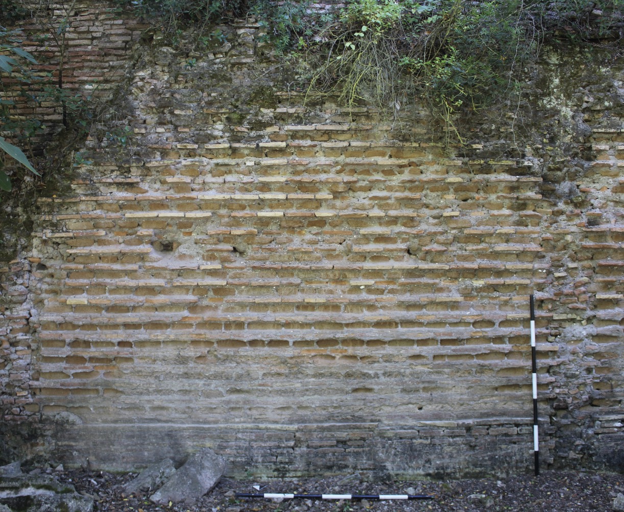 Alle spalle dei Magazzini Severiani, addossate alla parete di fondo e affacciate sul bacino di Claudio, in età tardoantica si installarono su una piccola spiaggia interna varie strutture, tra cui un edificio realizzato nella tecnica muraria definita opera vittata mista, caratterizzata dall’alternarsi di un filare di blocchetti rettangolari di tufo e di un filare di laterizi. Dell’edificio si conservano sette tabernae disposte in fila, identificate dalle tipiche soglie, e i resti di un portico antistante di cui rimane solo il primo pilastro. Al di sotto di questo impianto una fognatura più antica, coperta da blocchi di travertino, correva in direzione est-ovest dal bacino di Traiano parallela al braccio lungo dei Magazzini Severiani.